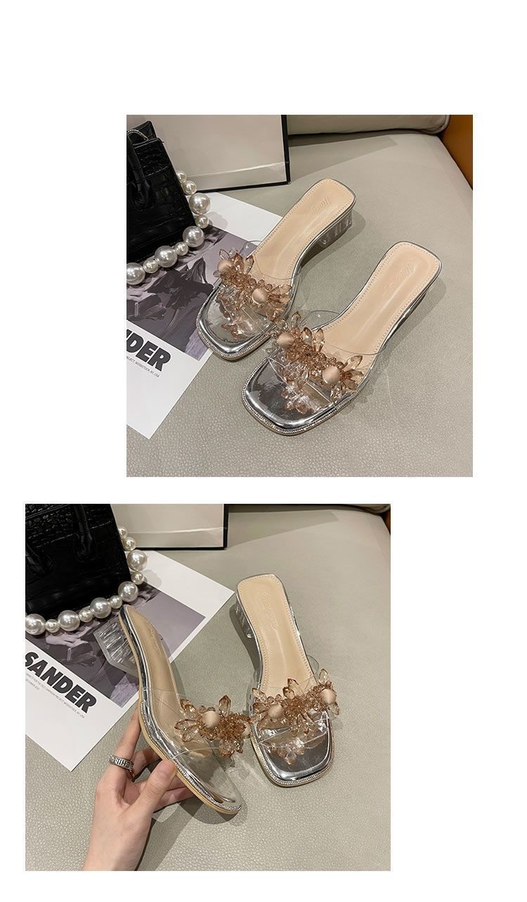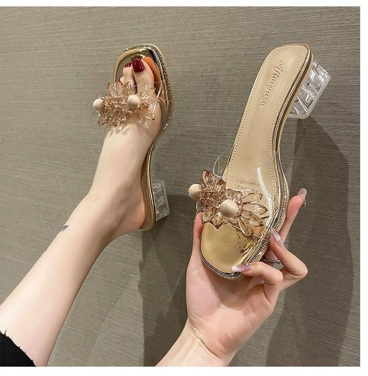 Sandalias Estilo Hada Zapatillas de Mujer para Exterior 2025 Verano Nuevo Decoración de Flor de Cristal Zapatillas Versátiles de Una Tira