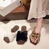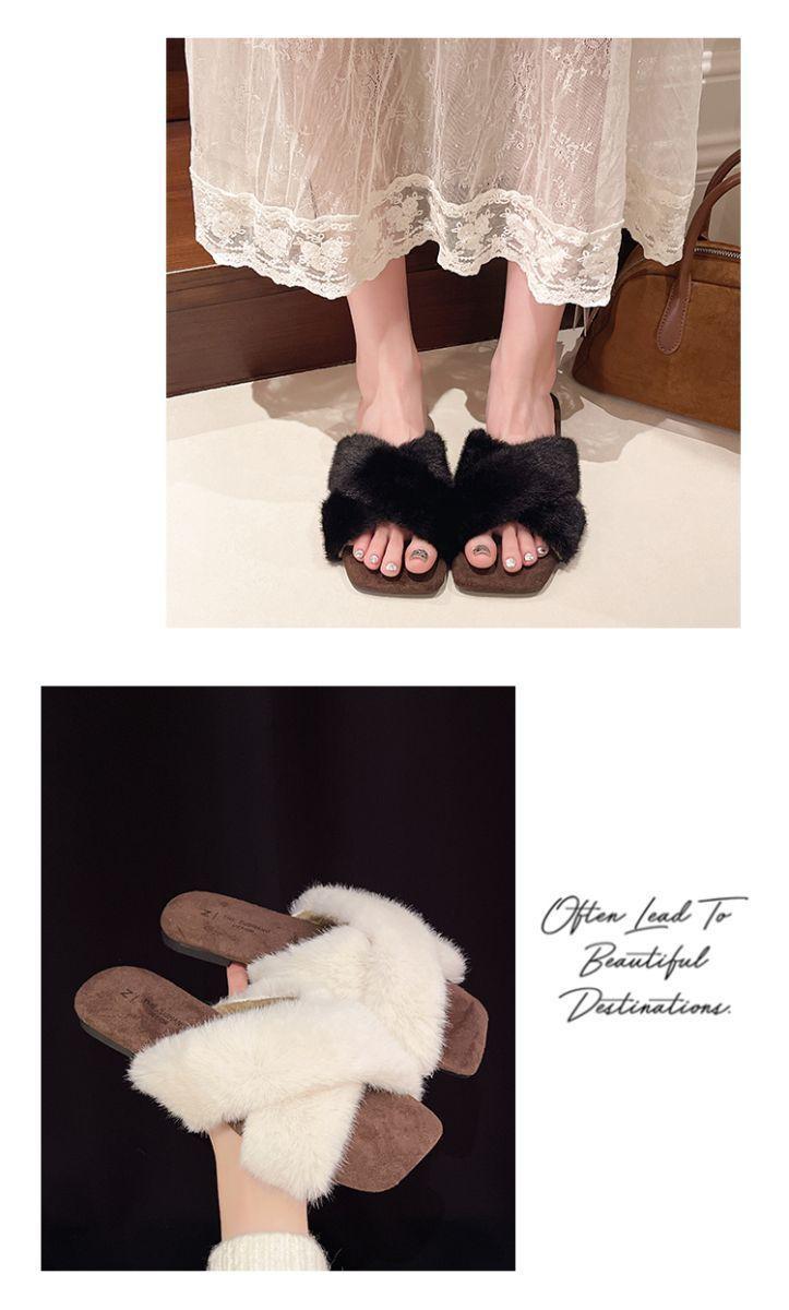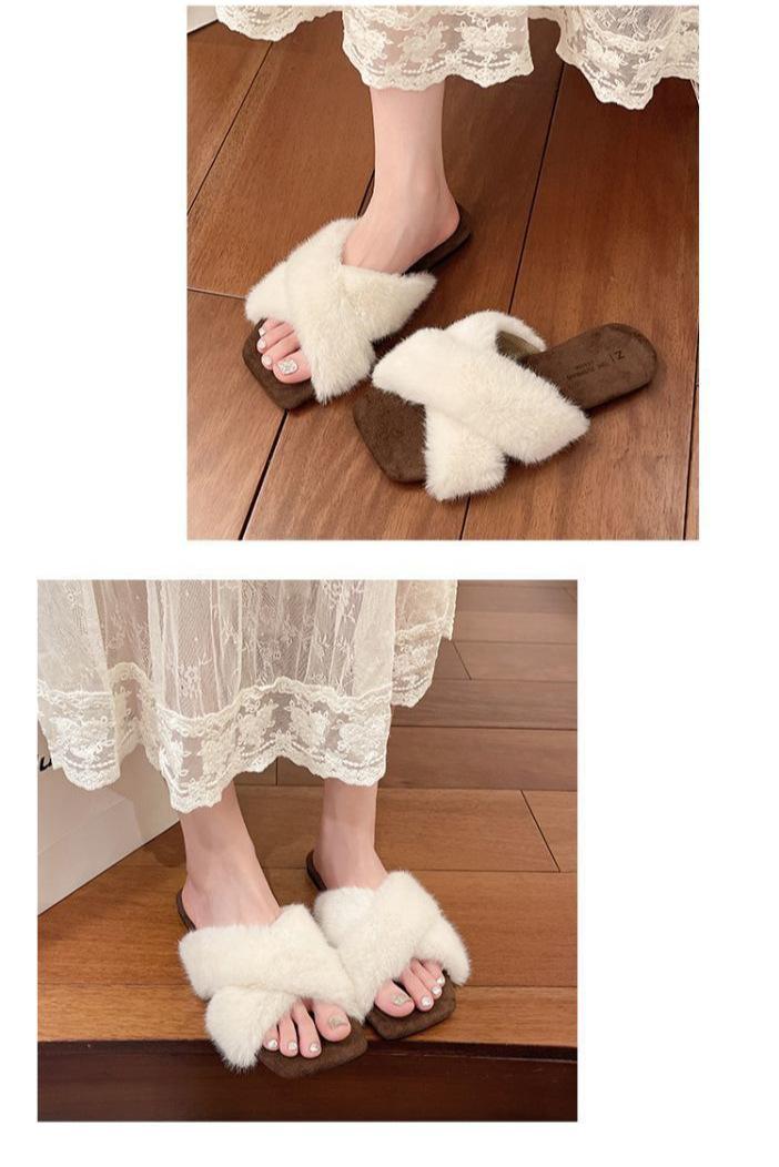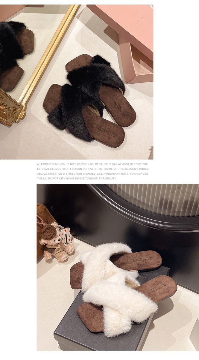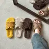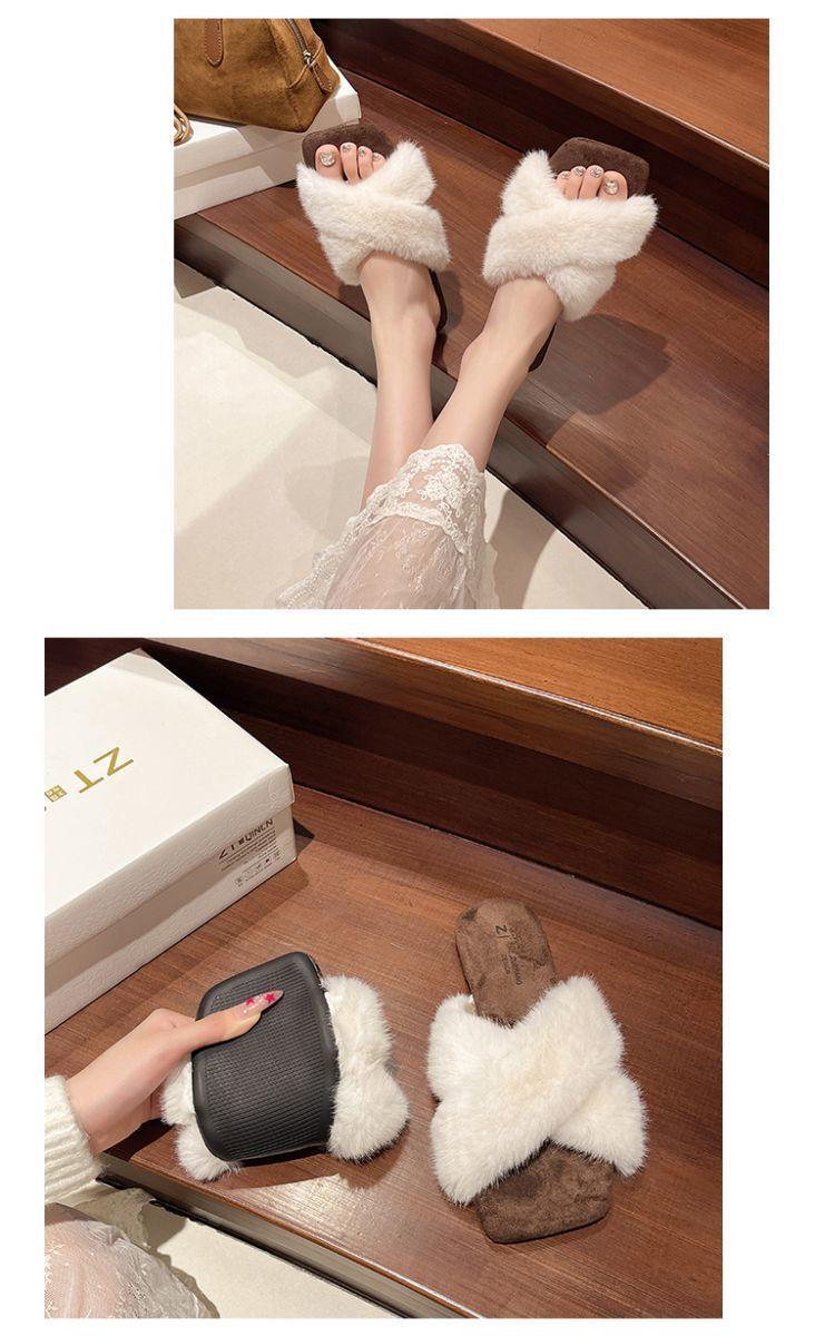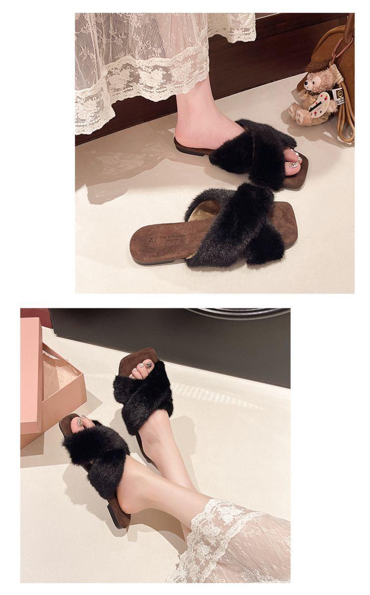 Pantuflas planas peludas francesas que las mujeres usan en la calle 2025 nuevo otoño e invierno felpa de alta gama pantuflas de una tira pantuflas de casa