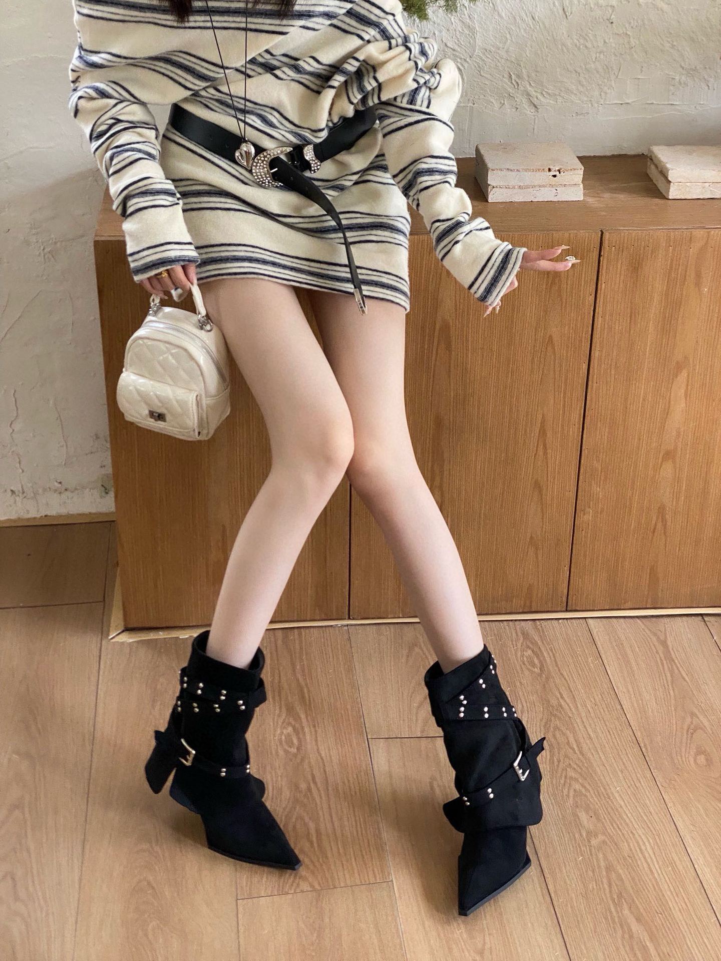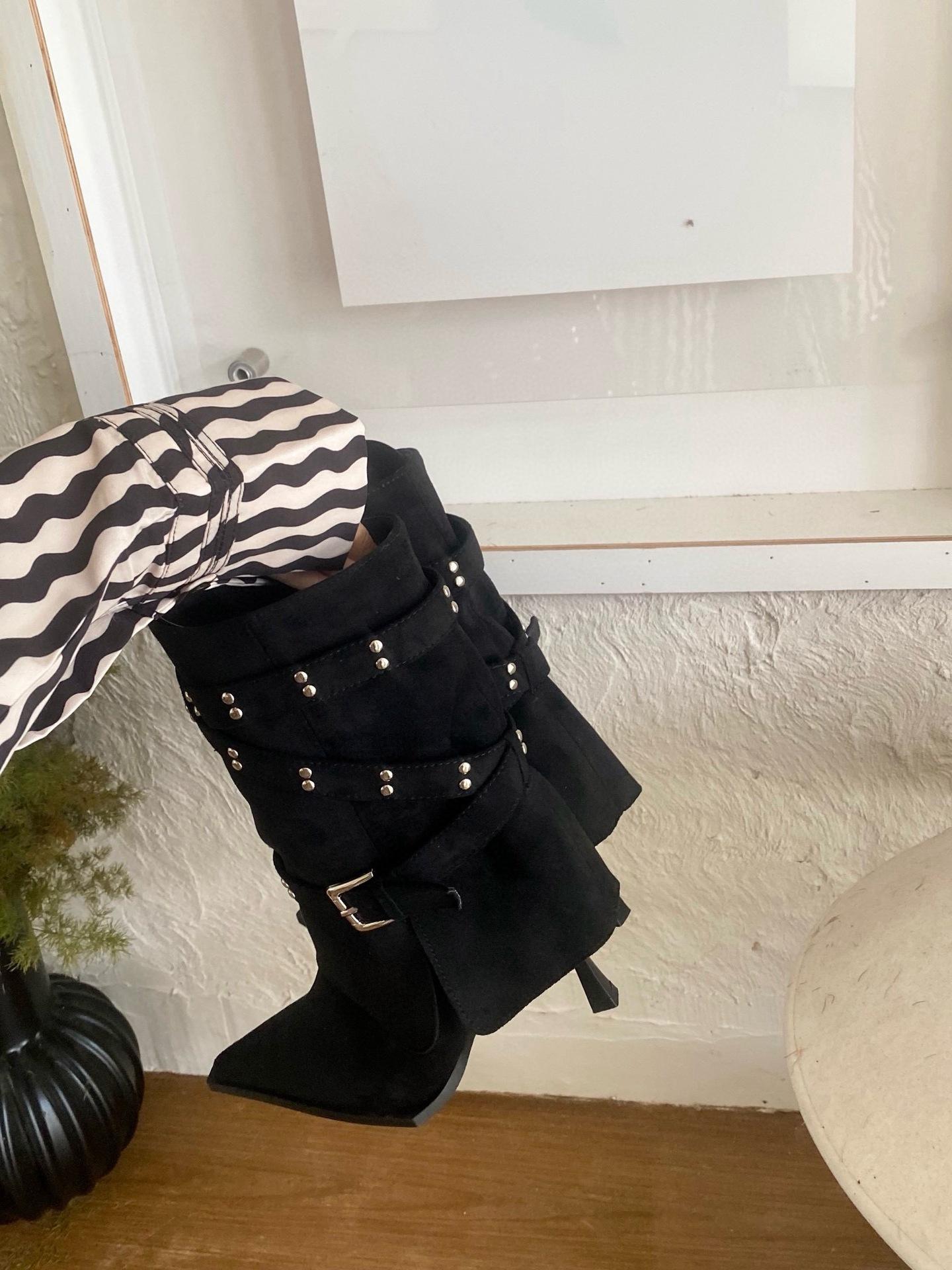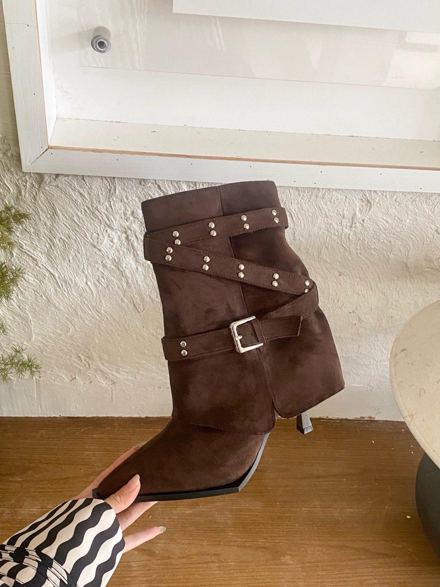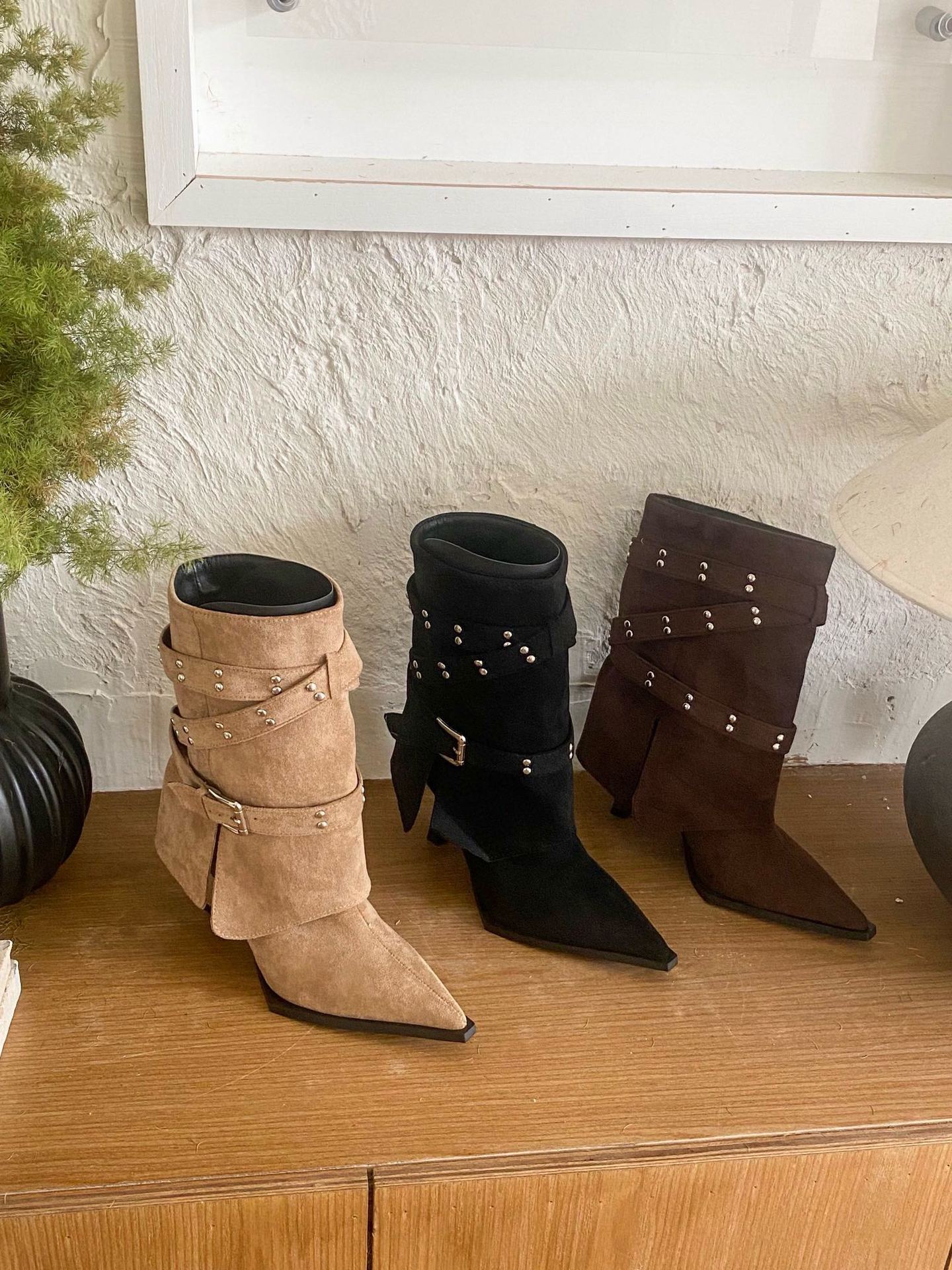 2025 Otoño/Invierno Nuevo Estilo Europeo y Americano Hebilla de Remaches Caña Ancha Punta Afilada Tacón de Aguja Tacón Alto Botines al Tobillo Botas de Gamuza para Pierna