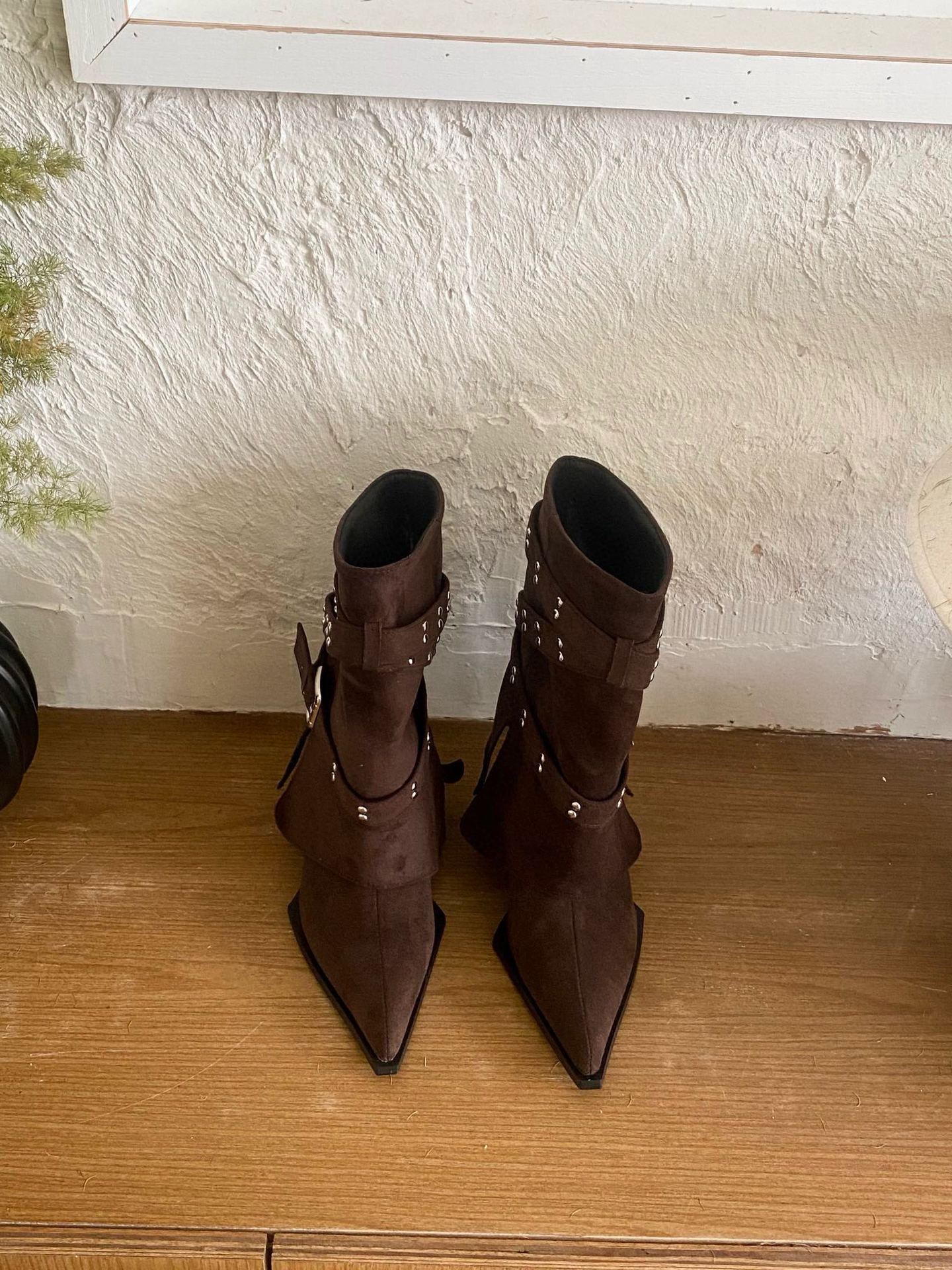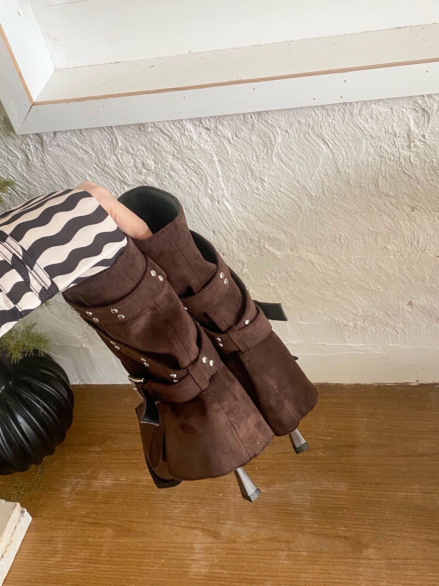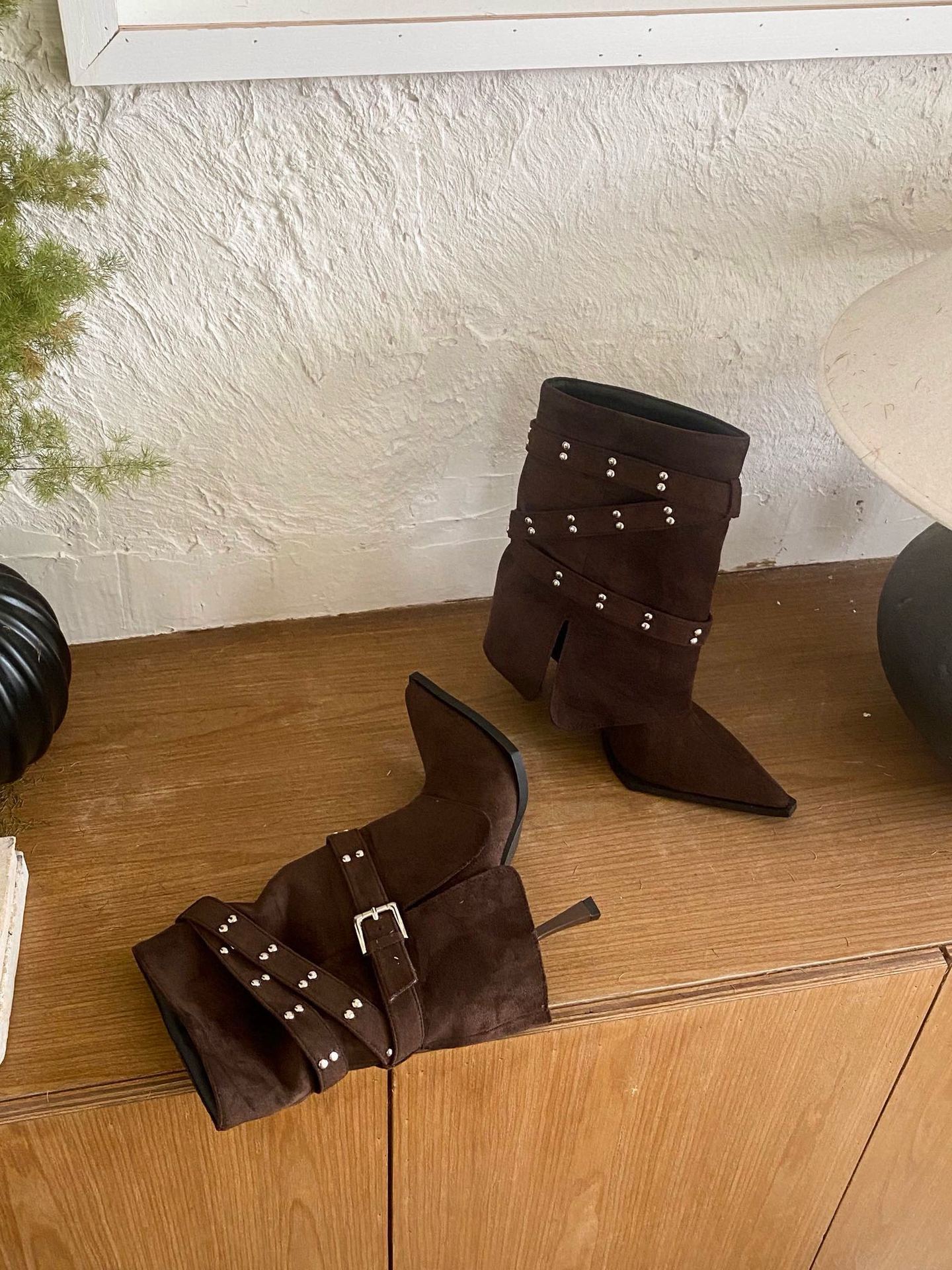 2025 Otoño/Invierno Nuevo Estilo Europeo y Americano Hebilla de Remaches Caña Ancha Punta Afilada Tacón de Aguja Tacón Alto Botines al Tobillo Botas de Gamuza para Pierna