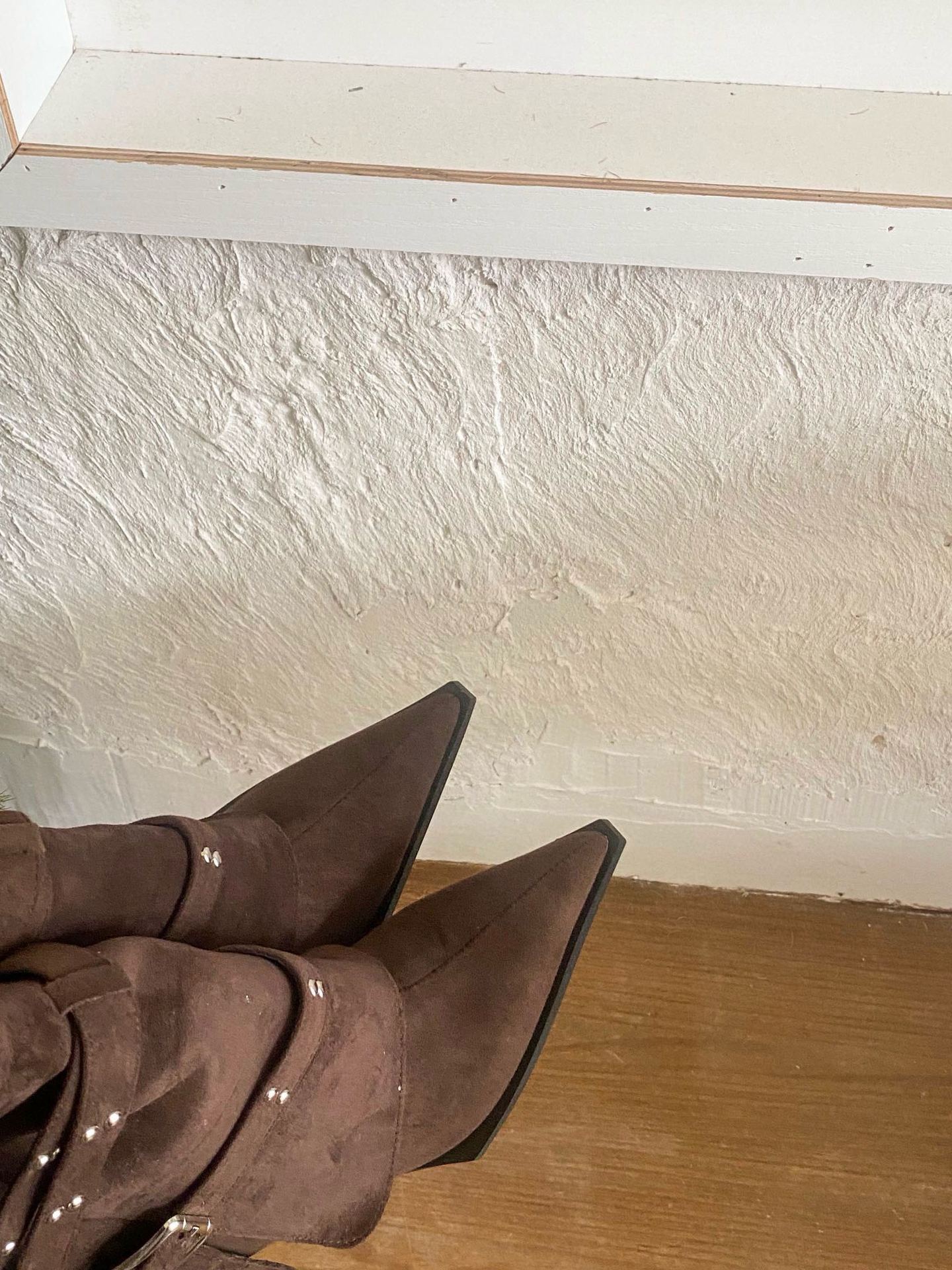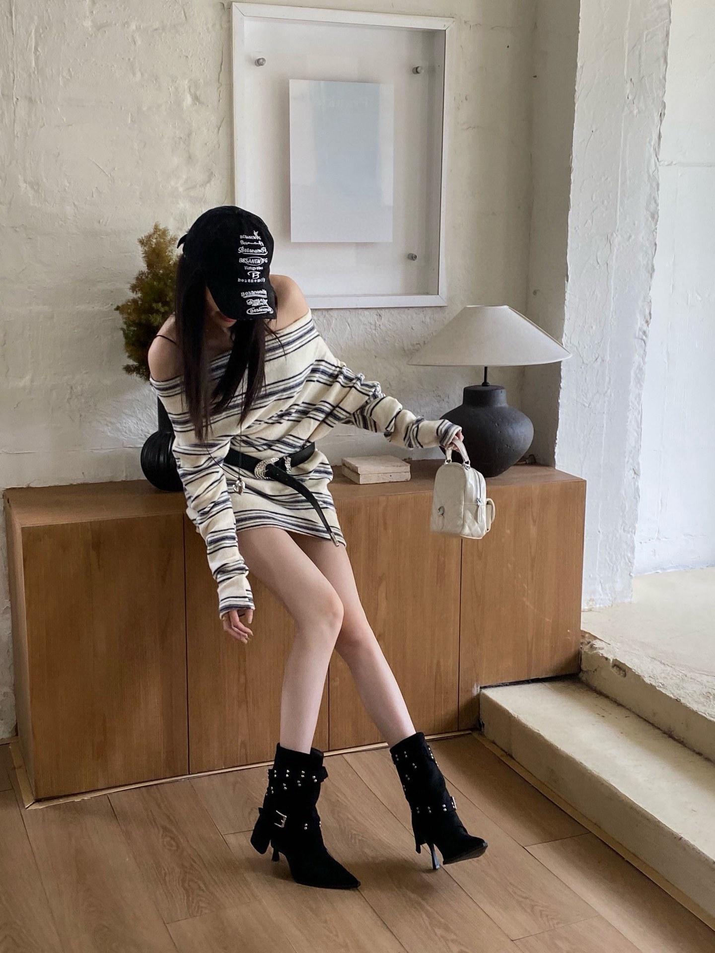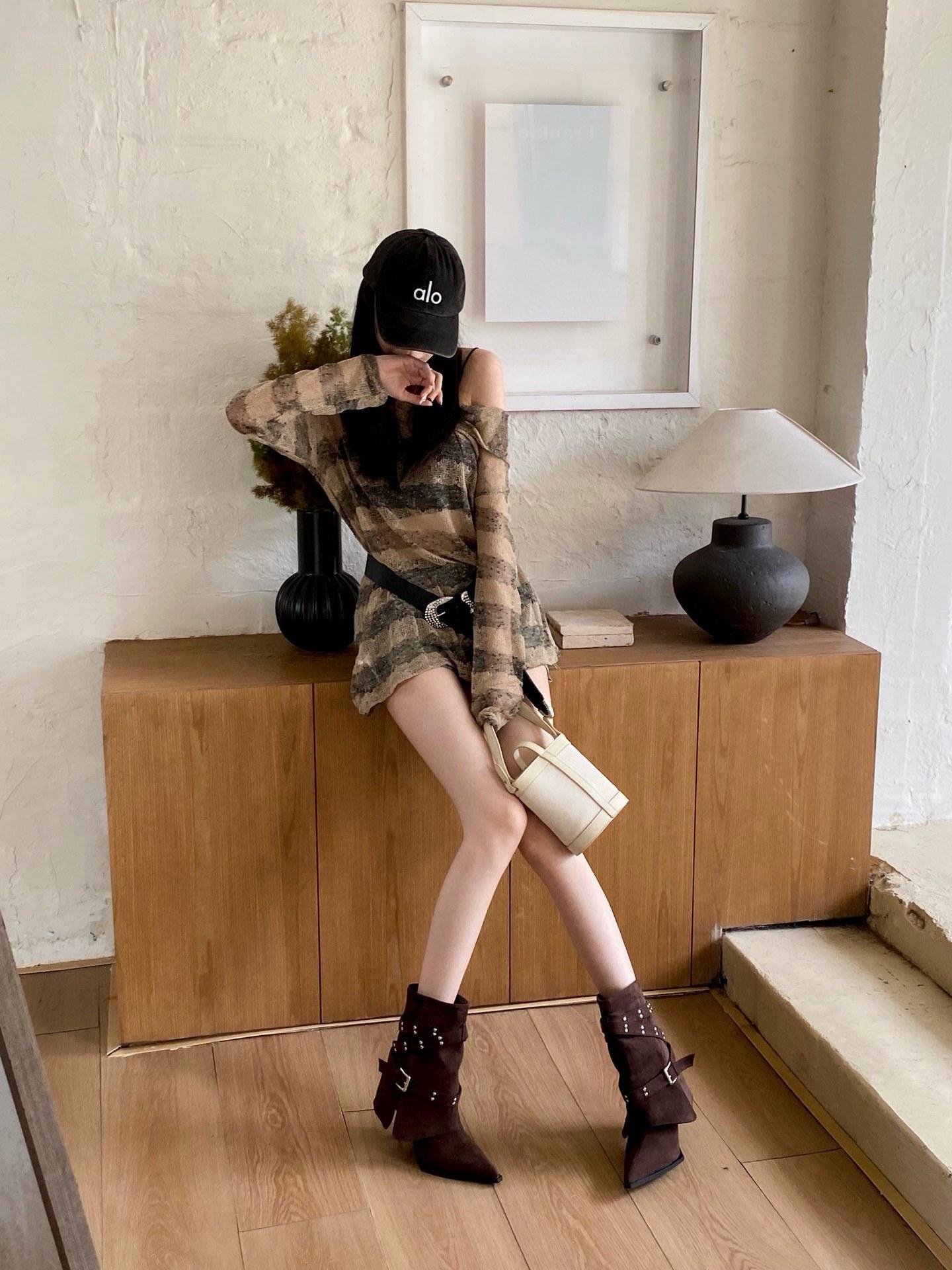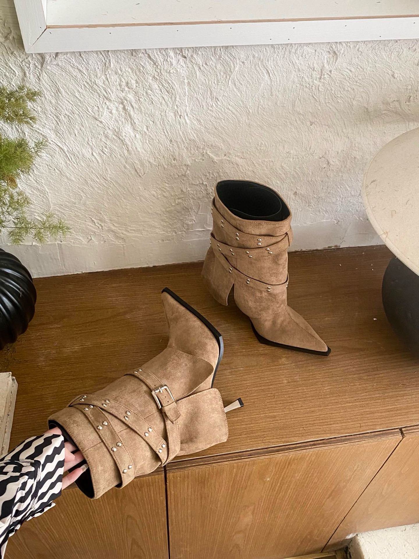 2025 Otoño/Invierno Nuevo Estilo Europeo y Americano Hebilla de Remaches Caña Ancha Punta Afilada Tacón de Aguja Tacón Alto Botines al Tobillo Botas de Gamuza para Pierna