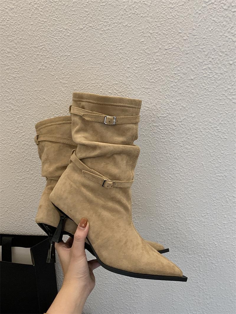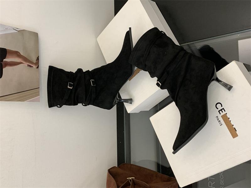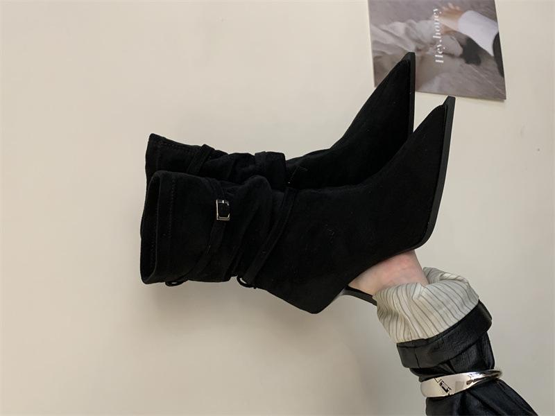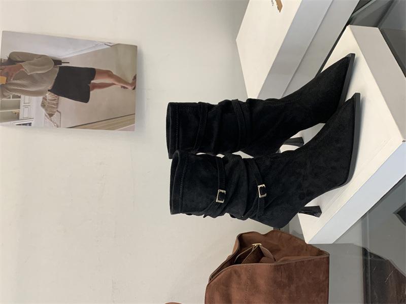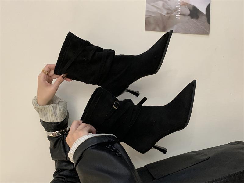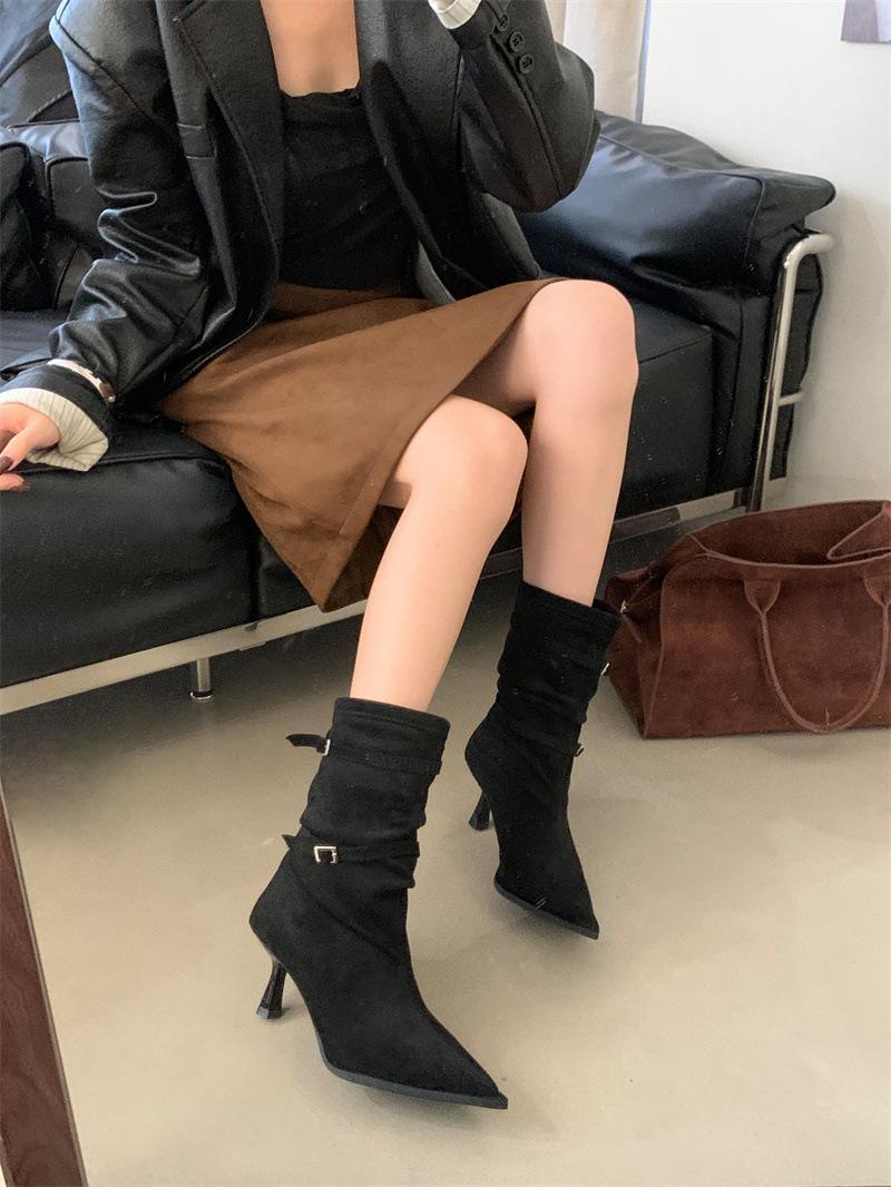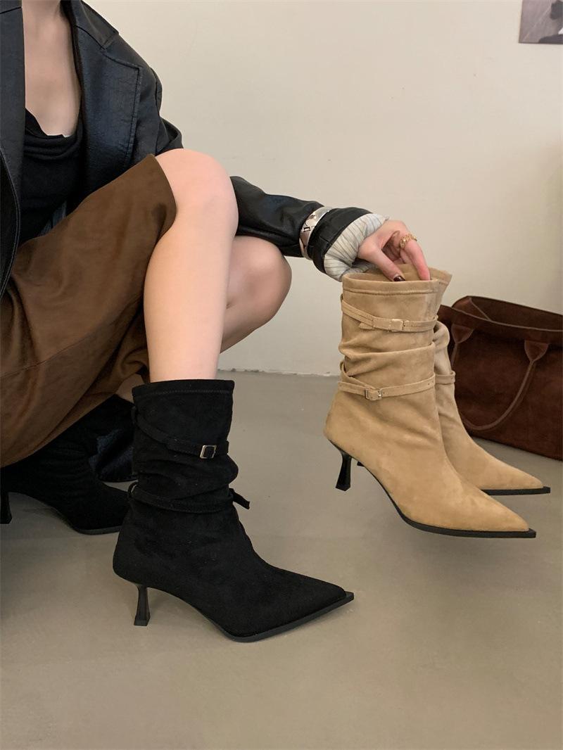 Botas de Moda 2025 Otoño Nuevo Europeo y Americano Punta Afilada Temperamento Hebilla Adelgazantes Botines Tacón de Aguja Gamuza Tacón Alto Botines Mujer