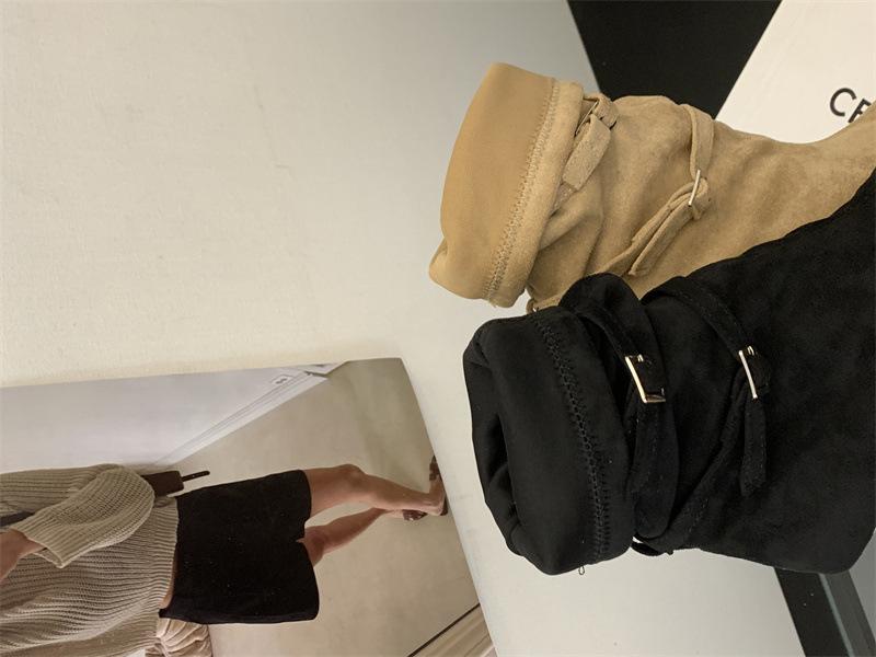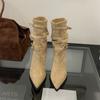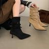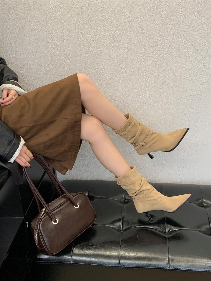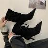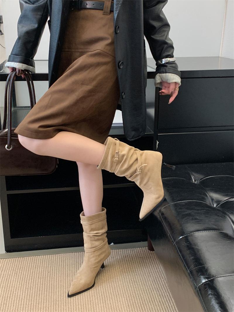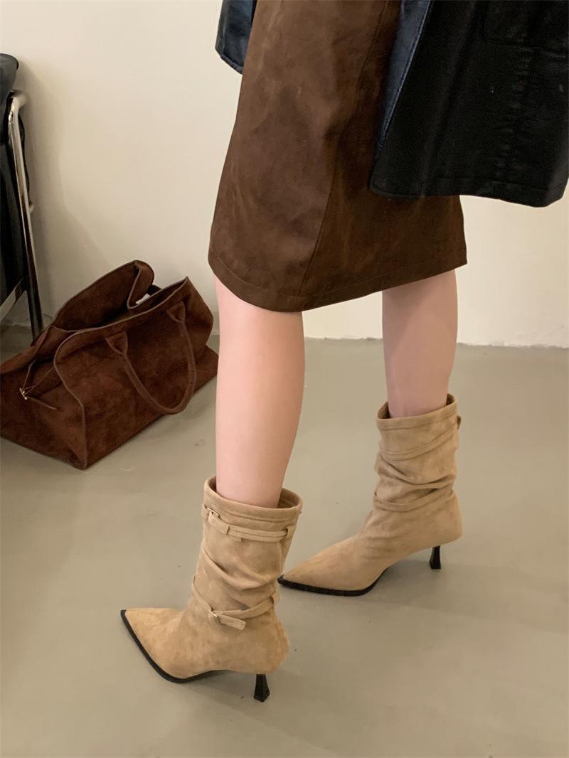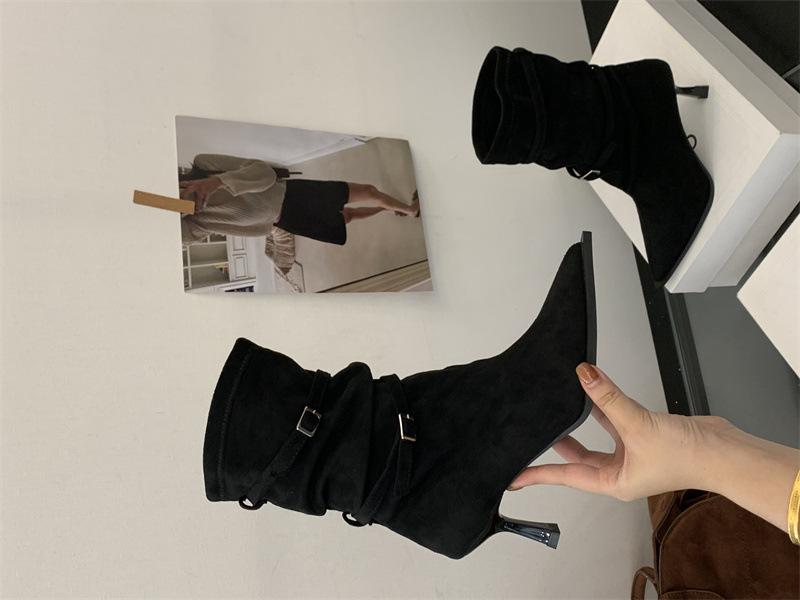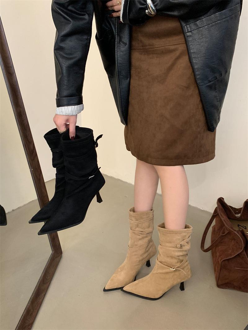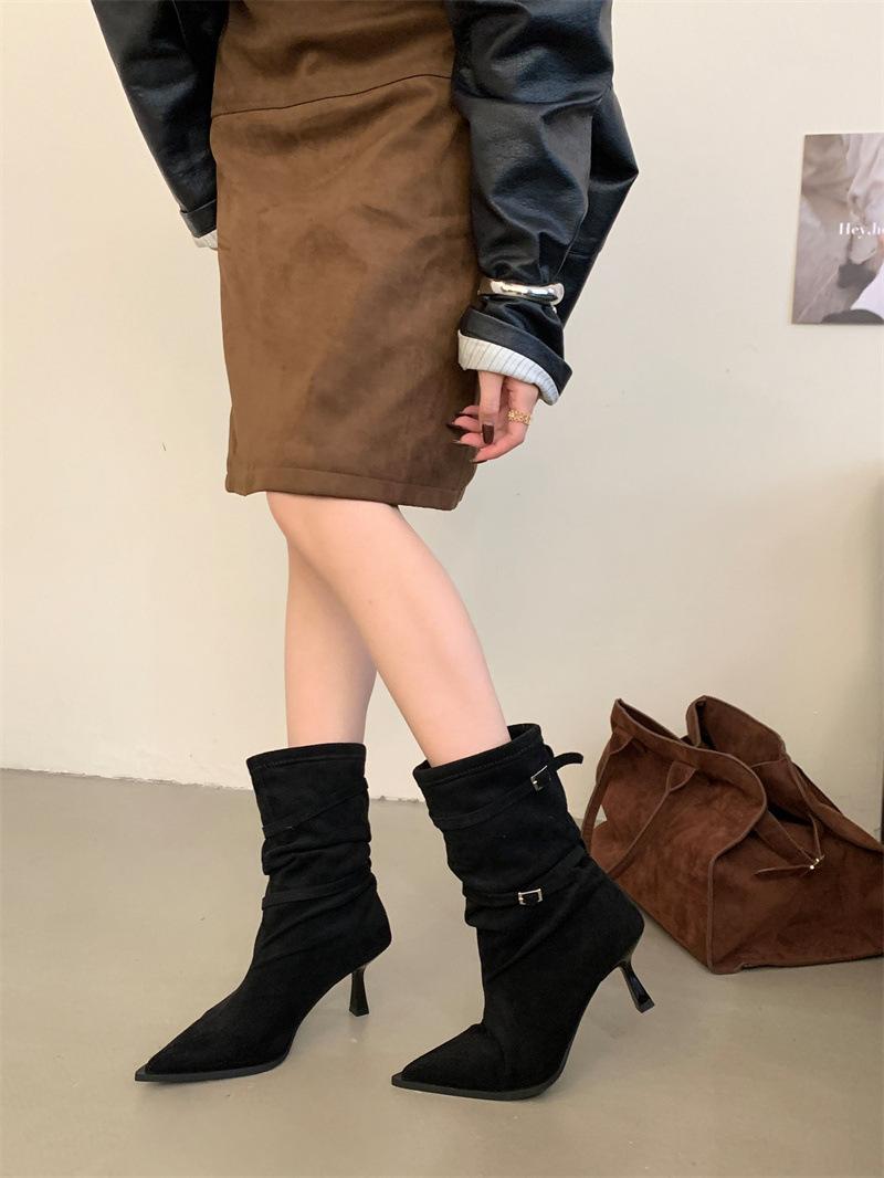 Botas de Moda 2025 Otoño Nuevo Europeo y Americano Punta Afilada Temperamento Hebilla Adelgazantes Botines Tacón de Aguja Gamuza Tacón Alto Botines Mujer