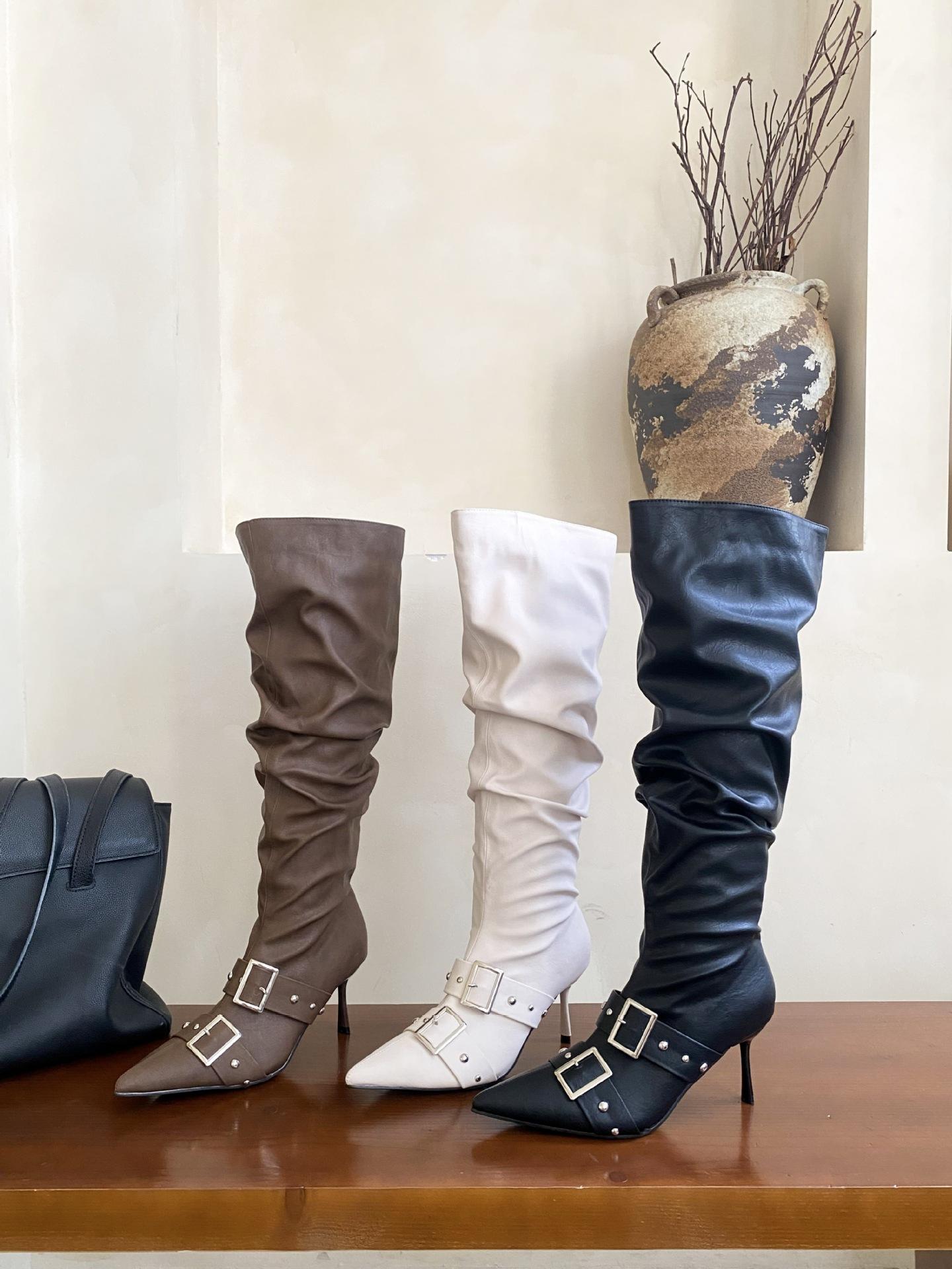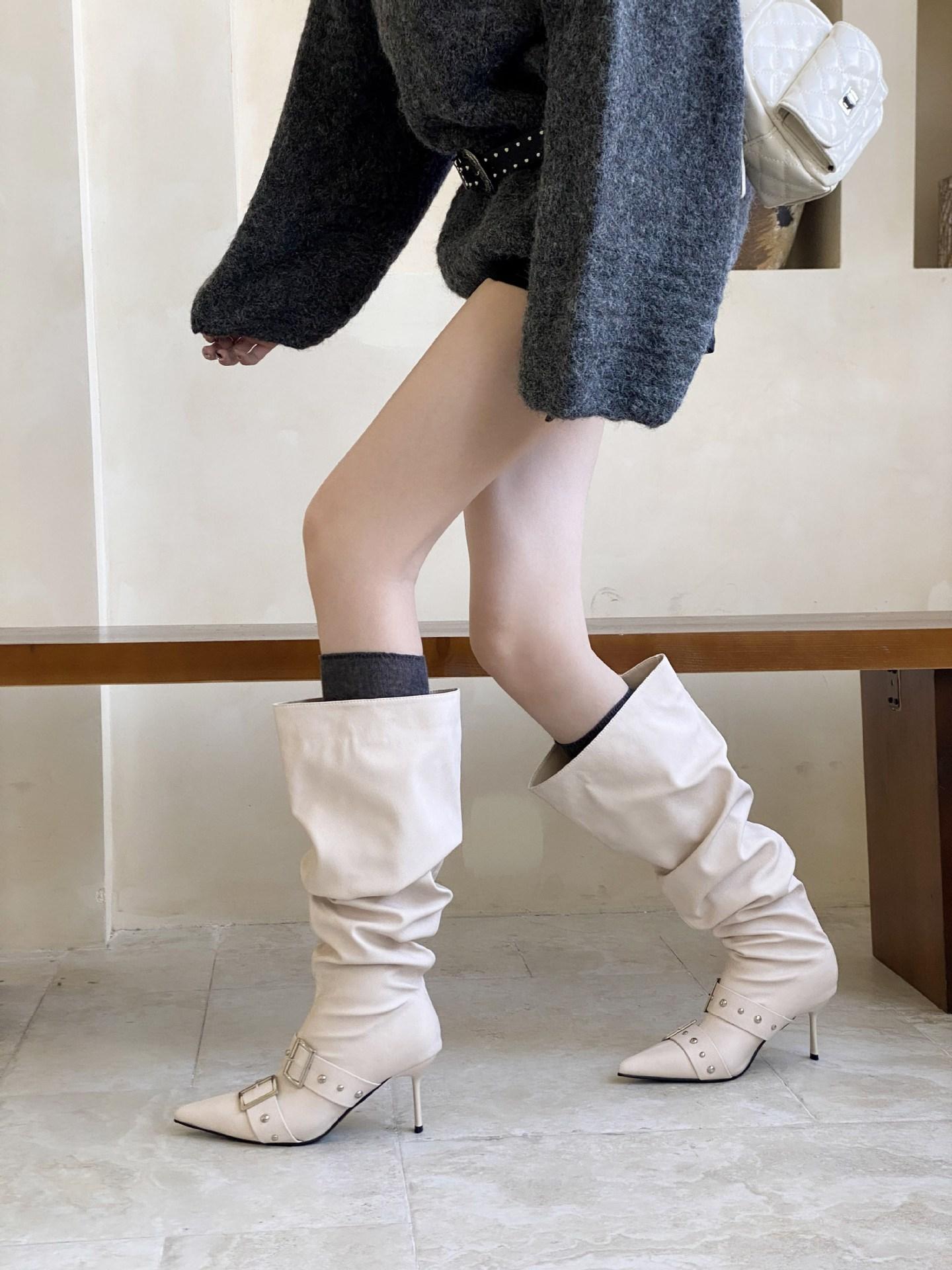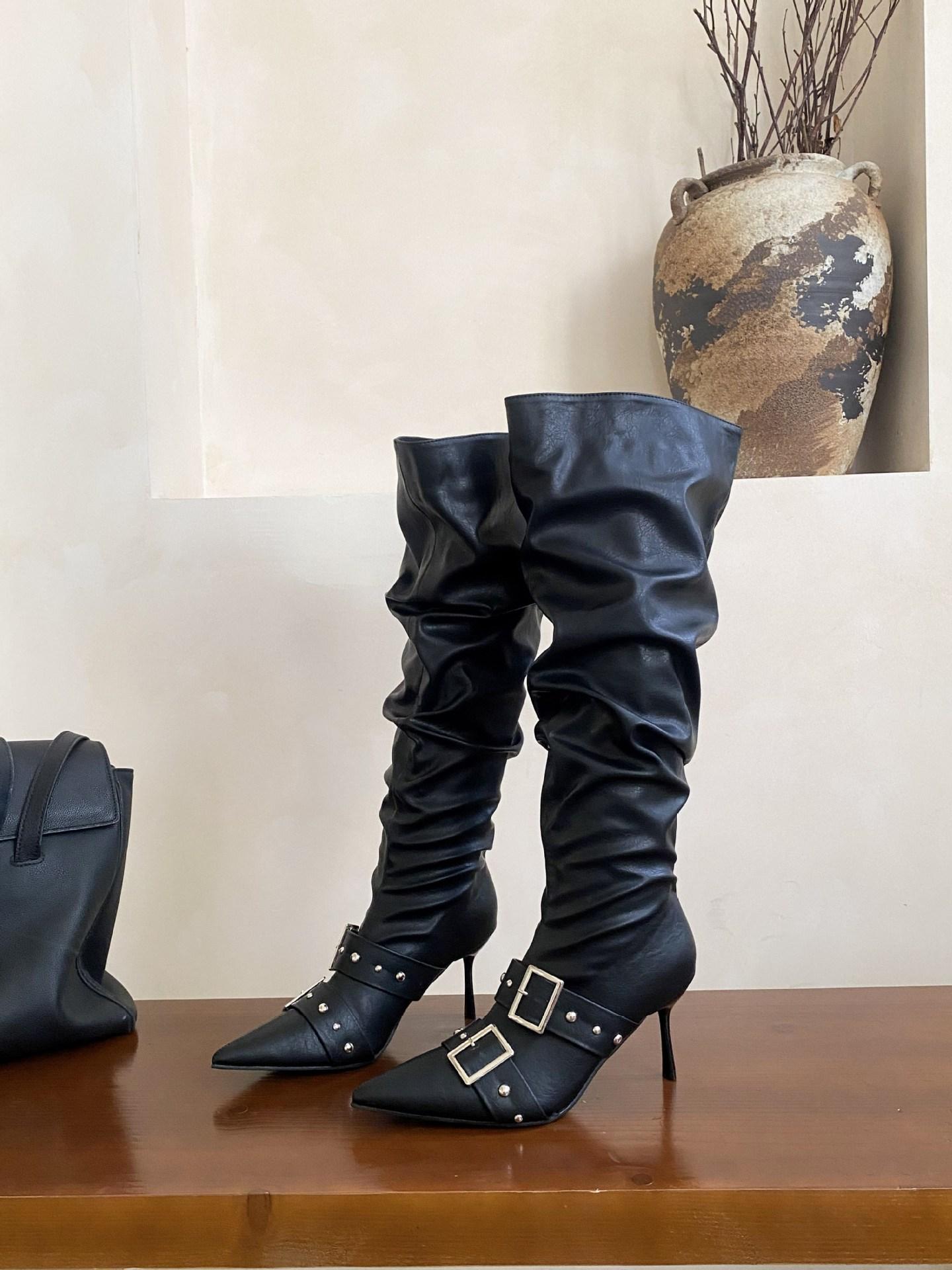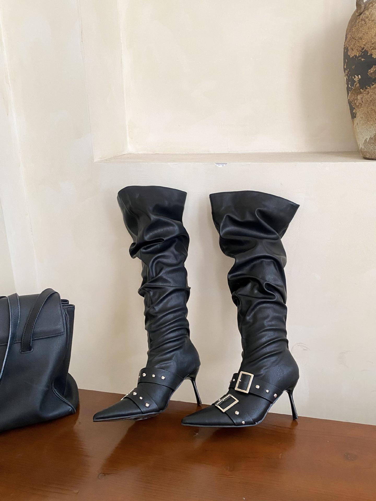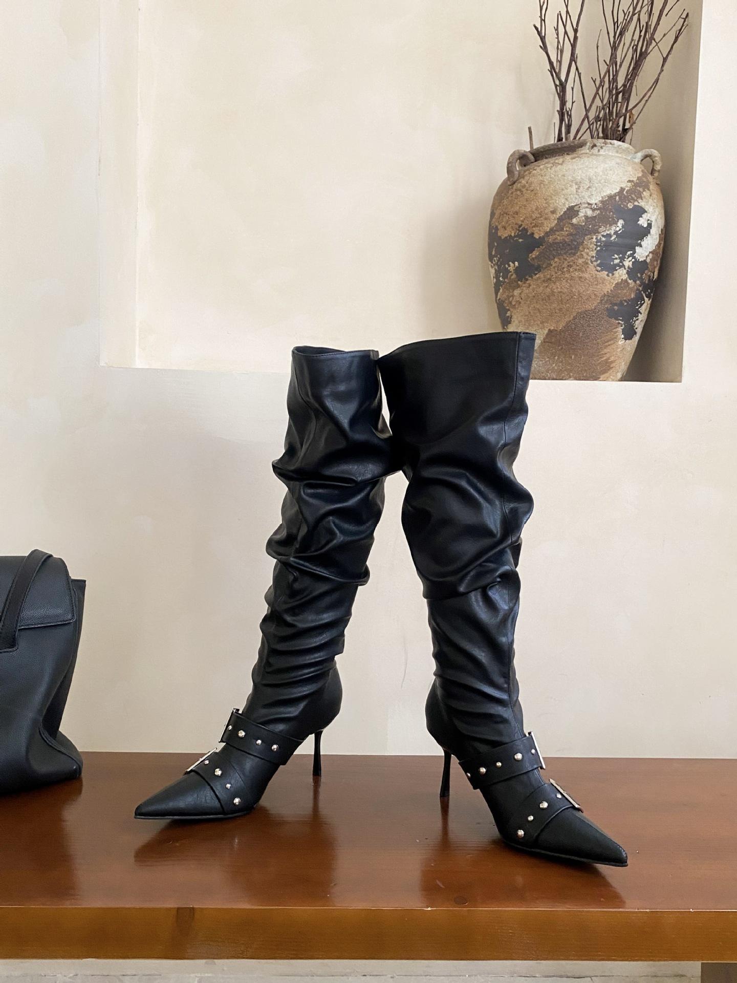 2025 Otoño/Invierno Nuevo Europeo y Americano Punta Afilada Tacón de Aguja Tacón Alto Temperamento Moda Francesa Remache Hebilla Botas Largas de Mujer