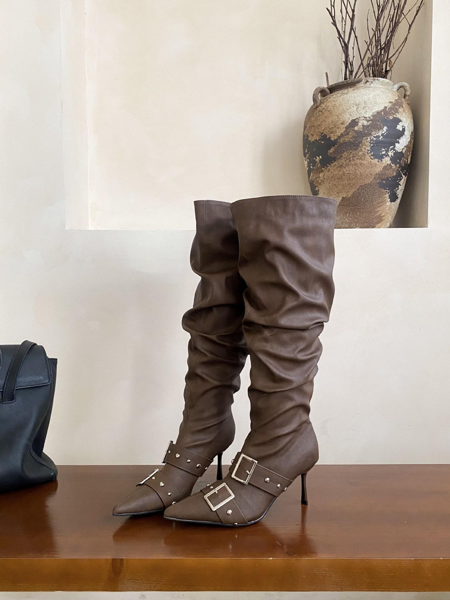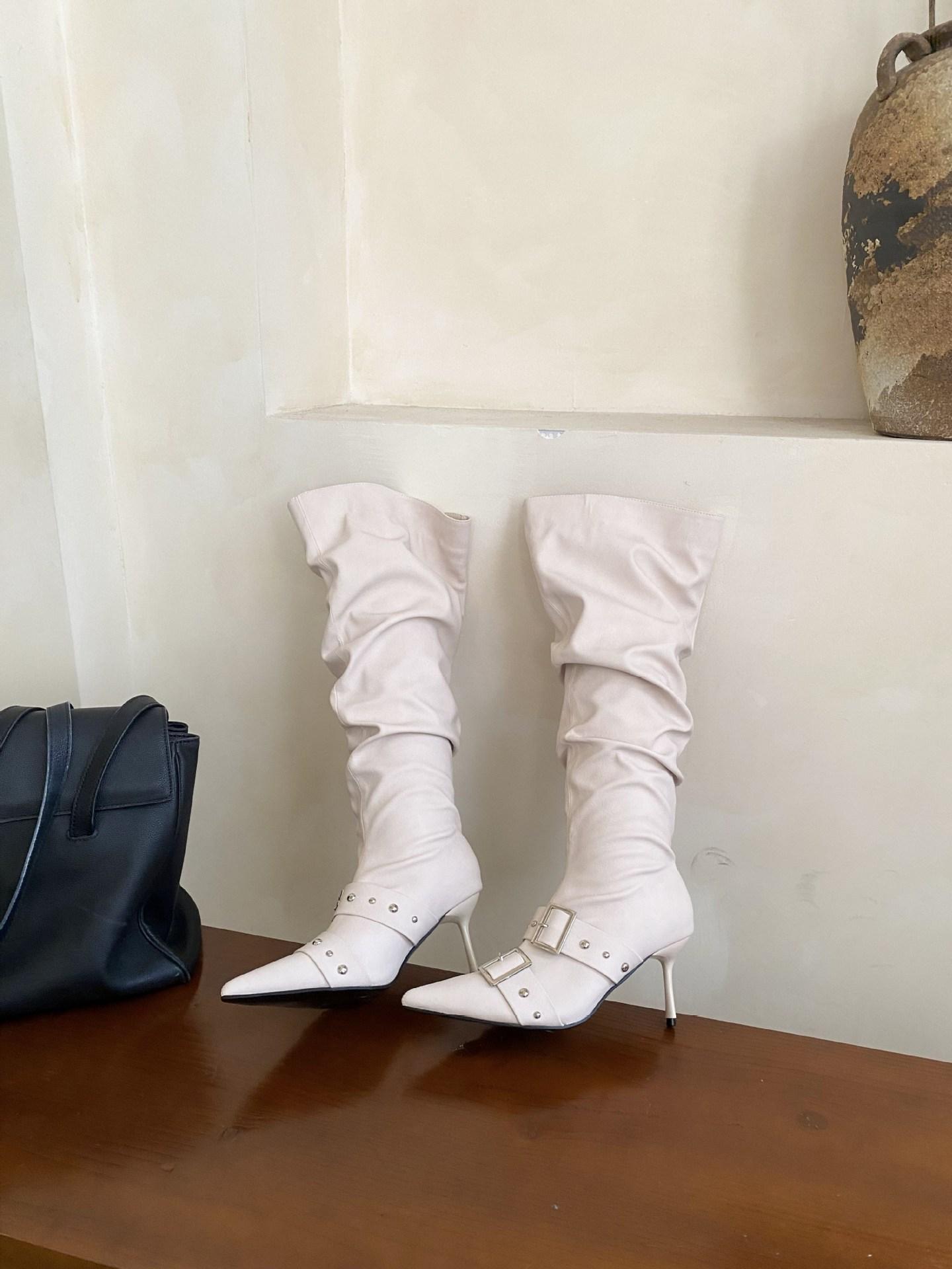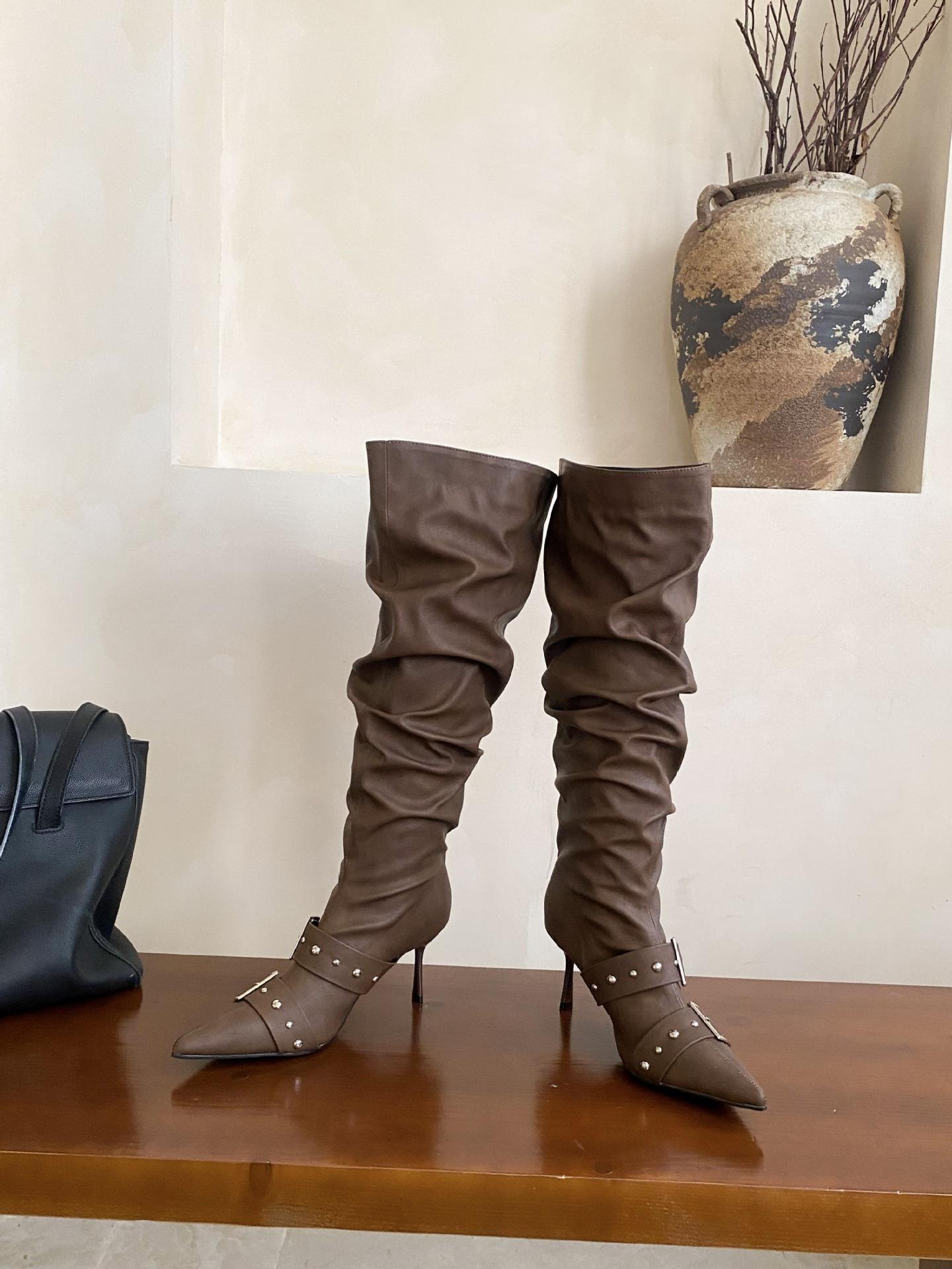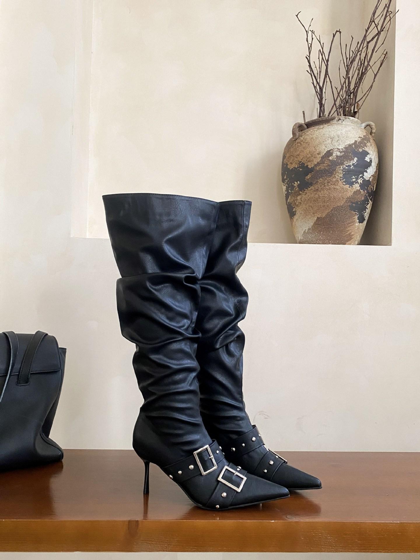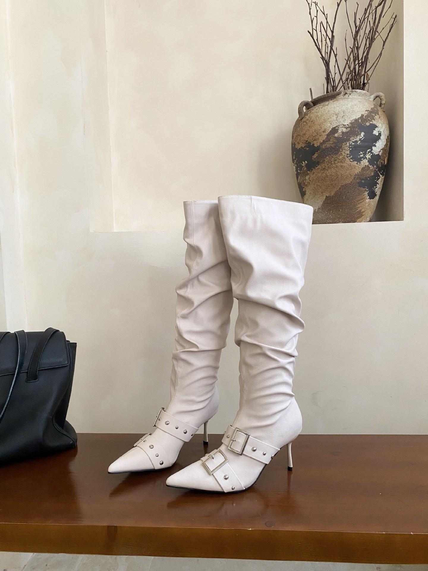 2025 Otoño/Invierno Nuevo Europeo y Americano Punta Afilada Tacón de Aguja Tacón Alto Temperamento Moda Francesa Remache Hebilla Botas Largas de Mujer