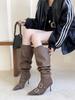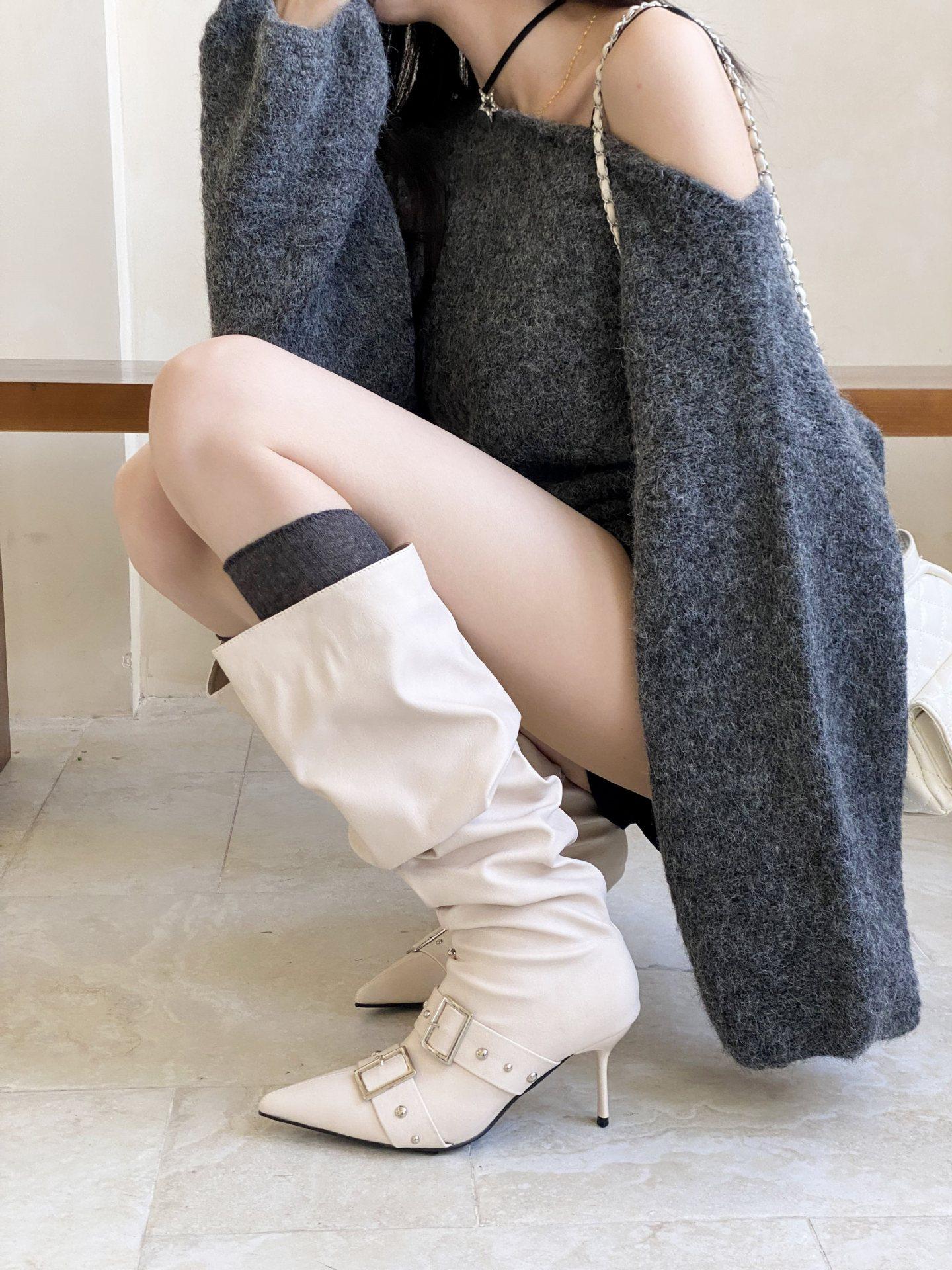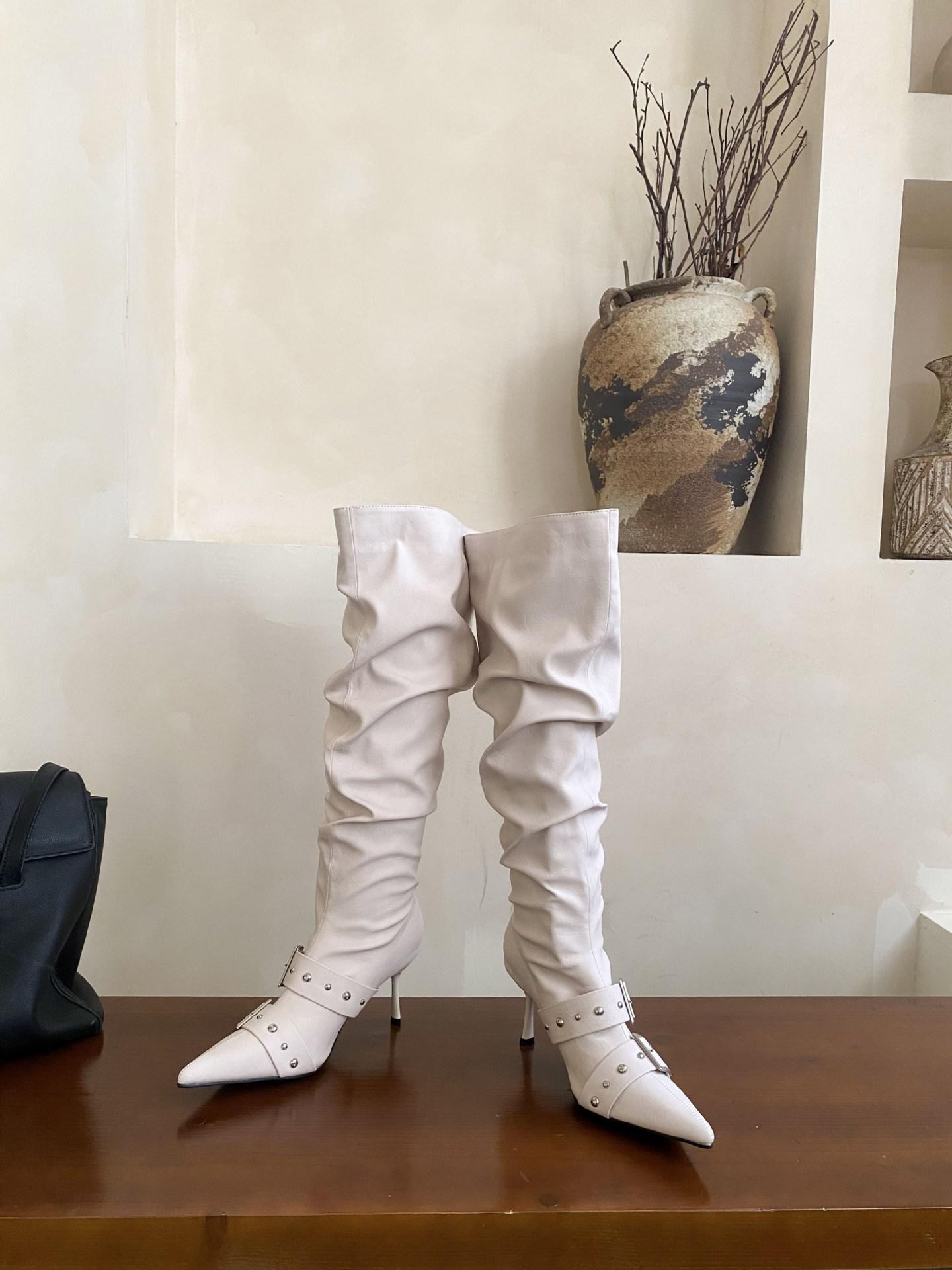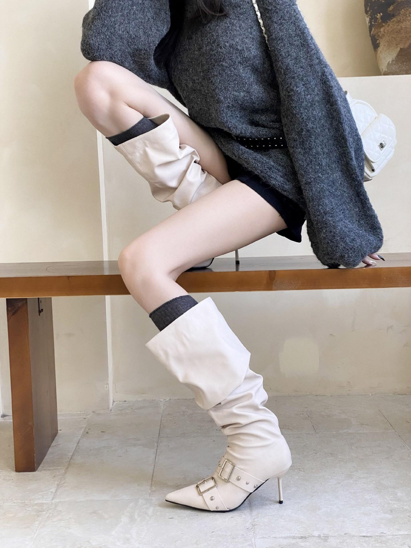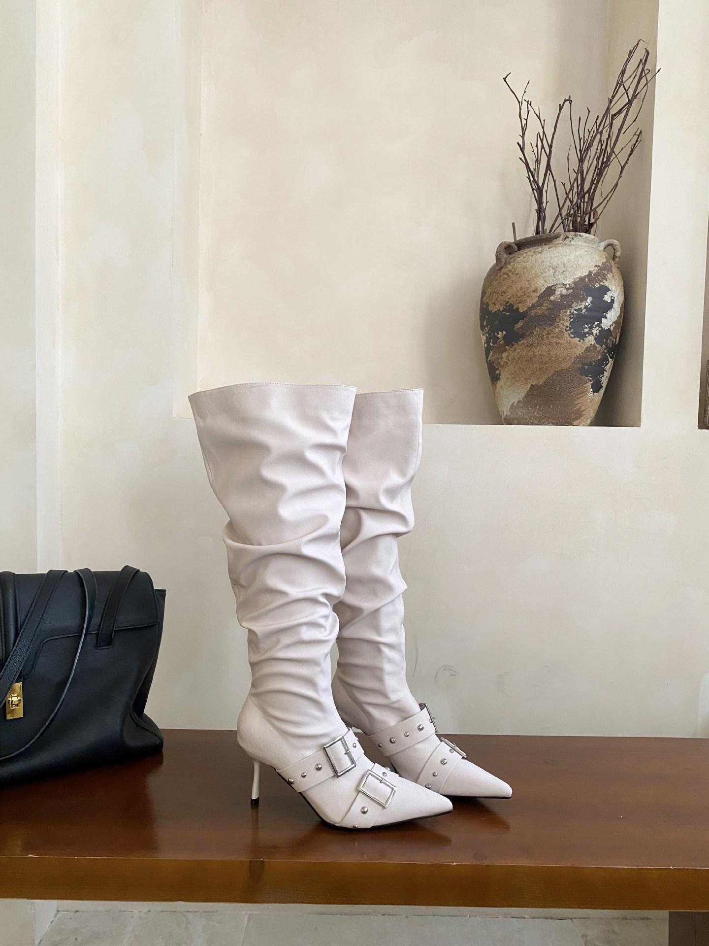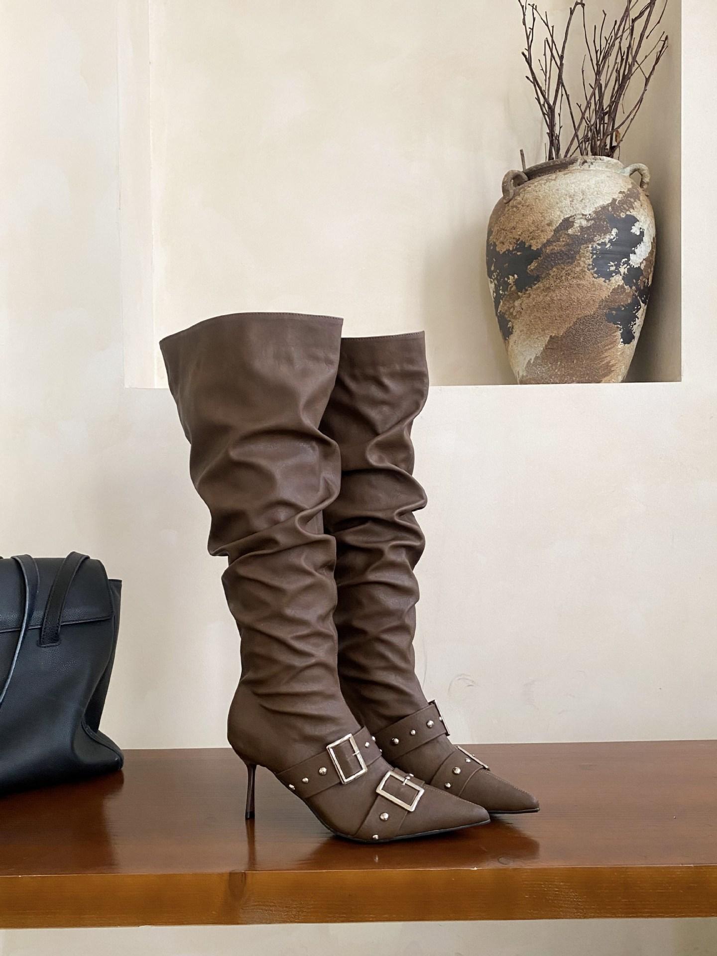 2025 Otoño/Invierno Nuevo Europeo y Americano Punta Afilada Tacón de Aguja Tacón Alto Temperamento Moda Francesa Remache Hebilla Botas Largas de Mujer