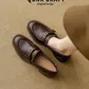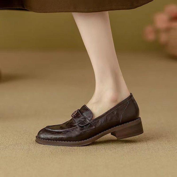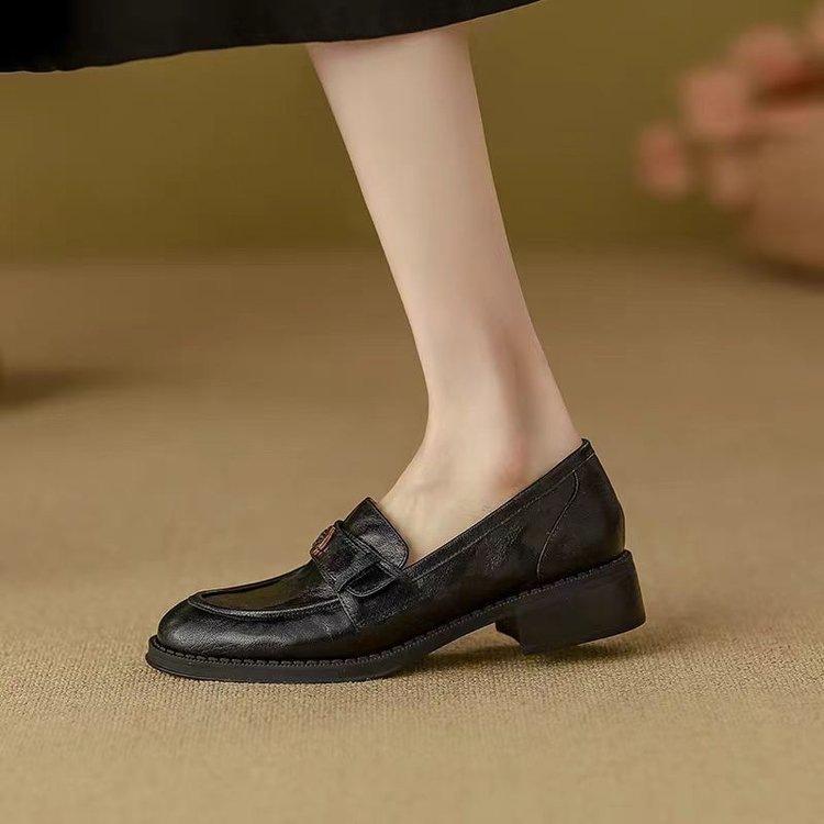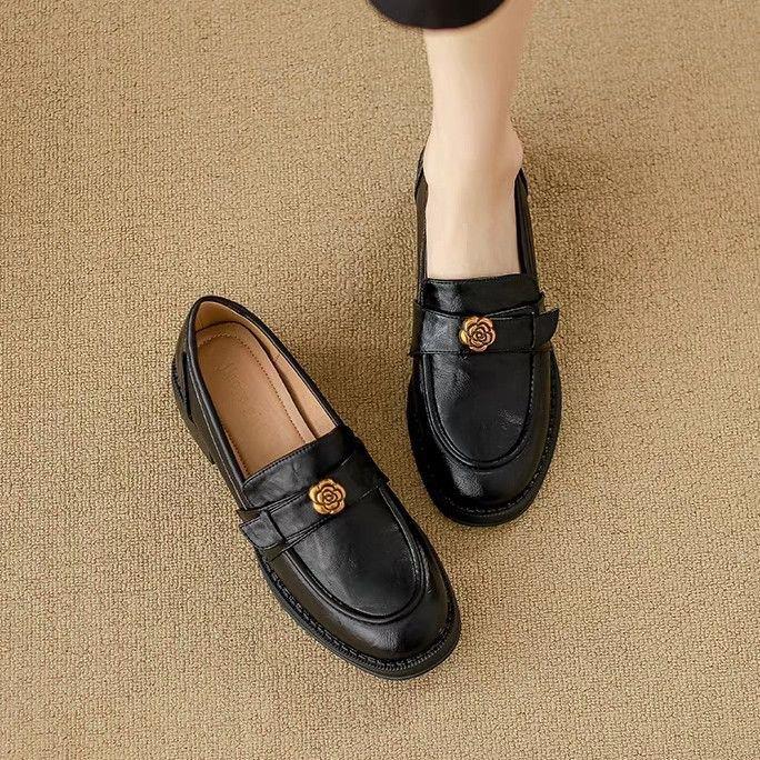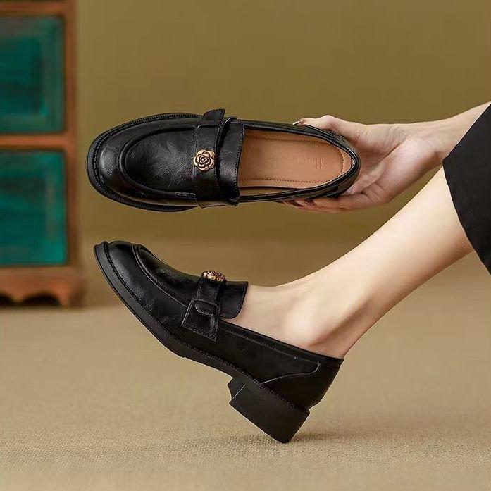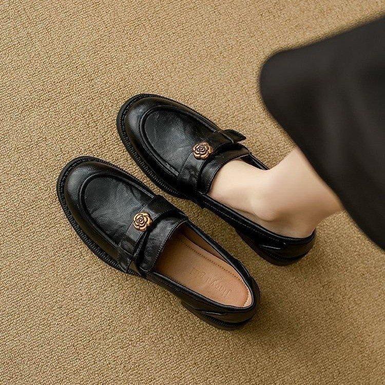 Mocasines de piel con camelia para mujer otoño 2025 nuevos estilo británico retro zapatos de piel pequeños versátiles zapatos individuales