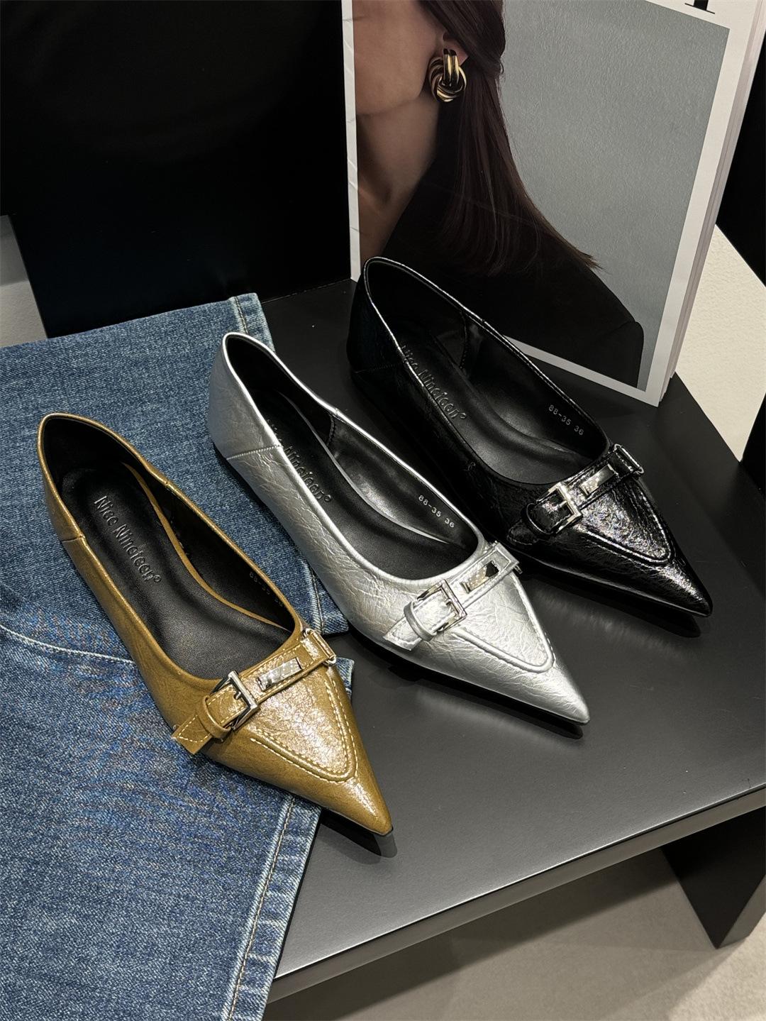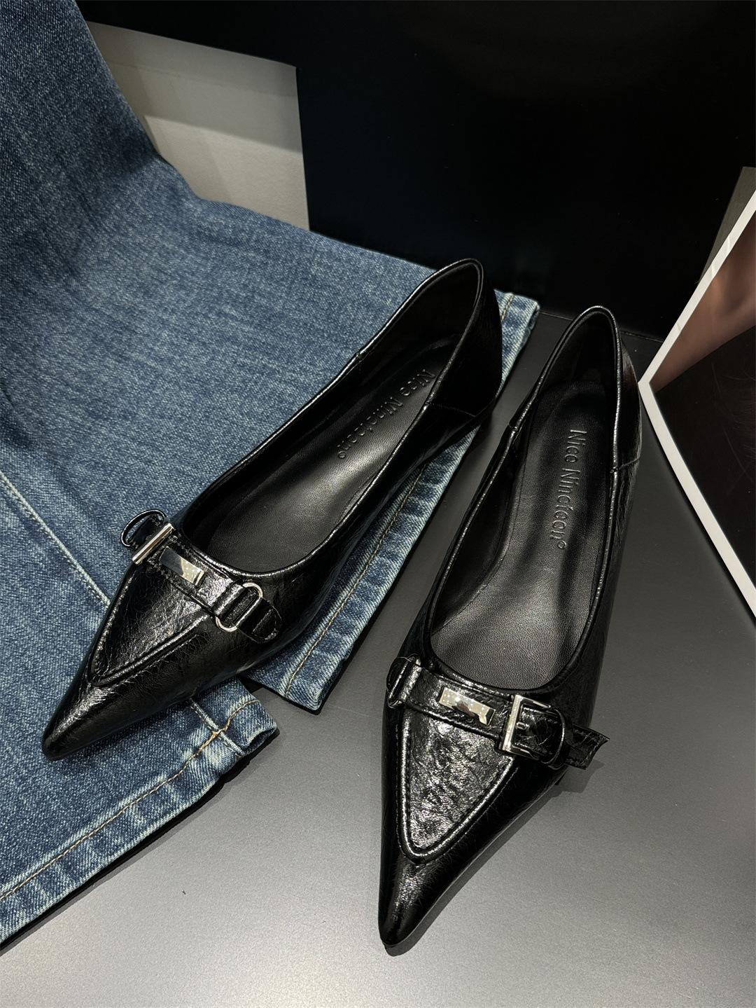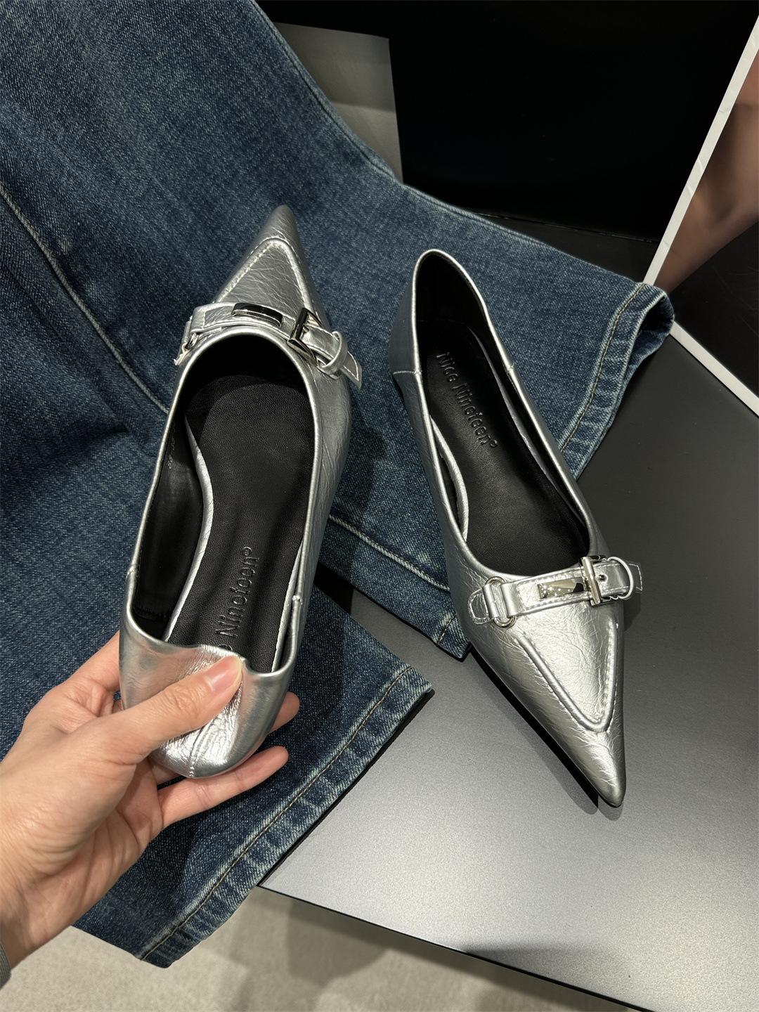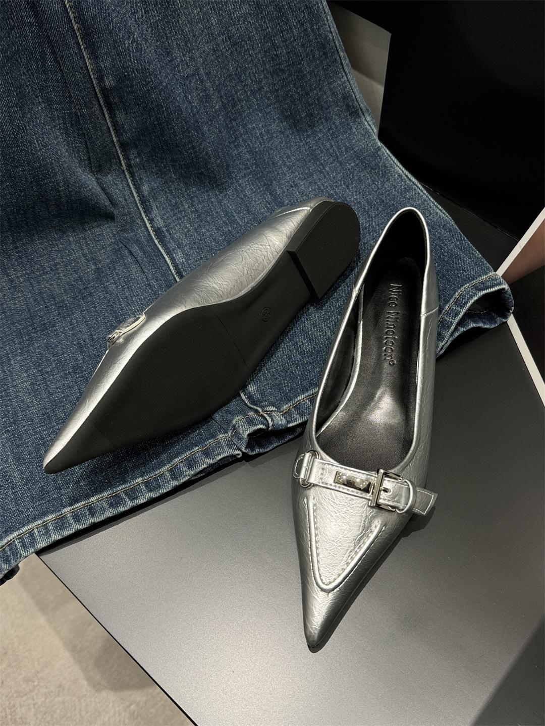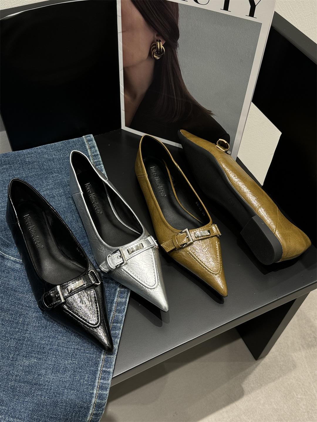 Zapatos planos de punta para primavera 2025 con hebilla metálica, zapatos de mujer de boca baja con suela blanda, mocasines cómodos de tacón bajo