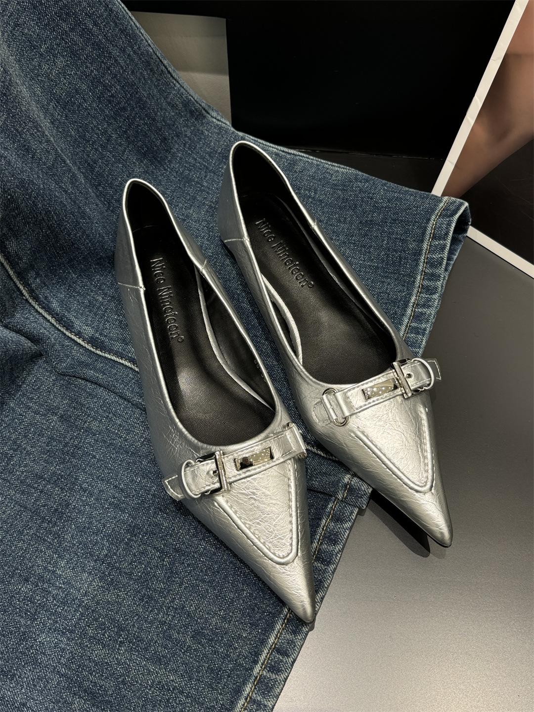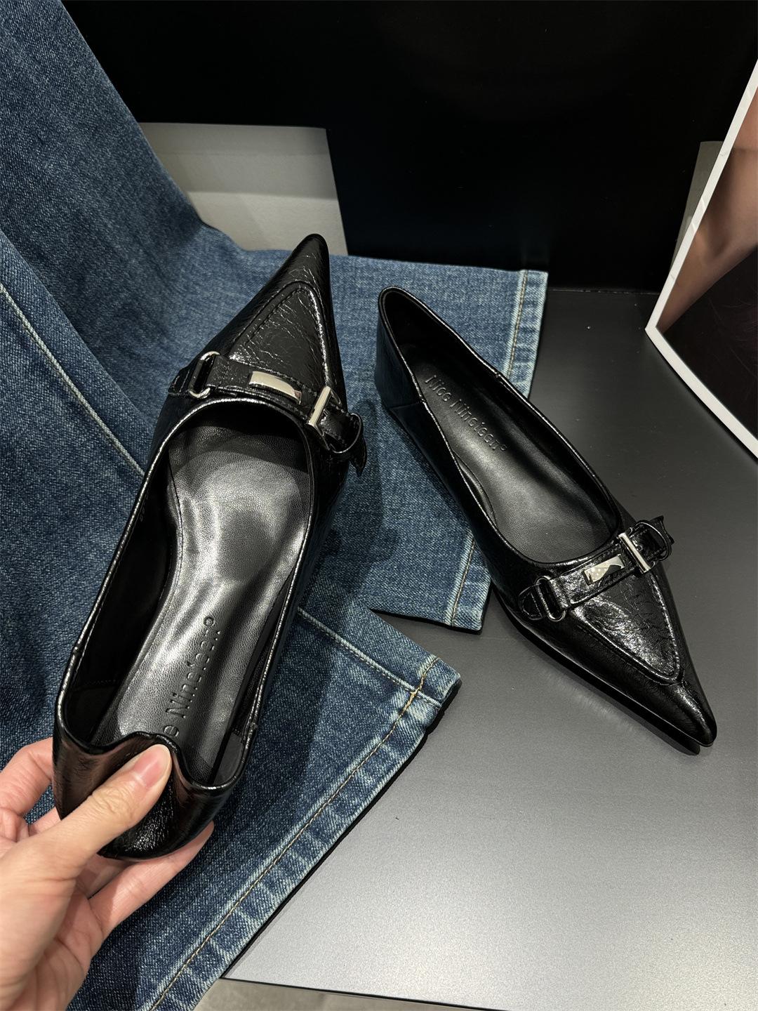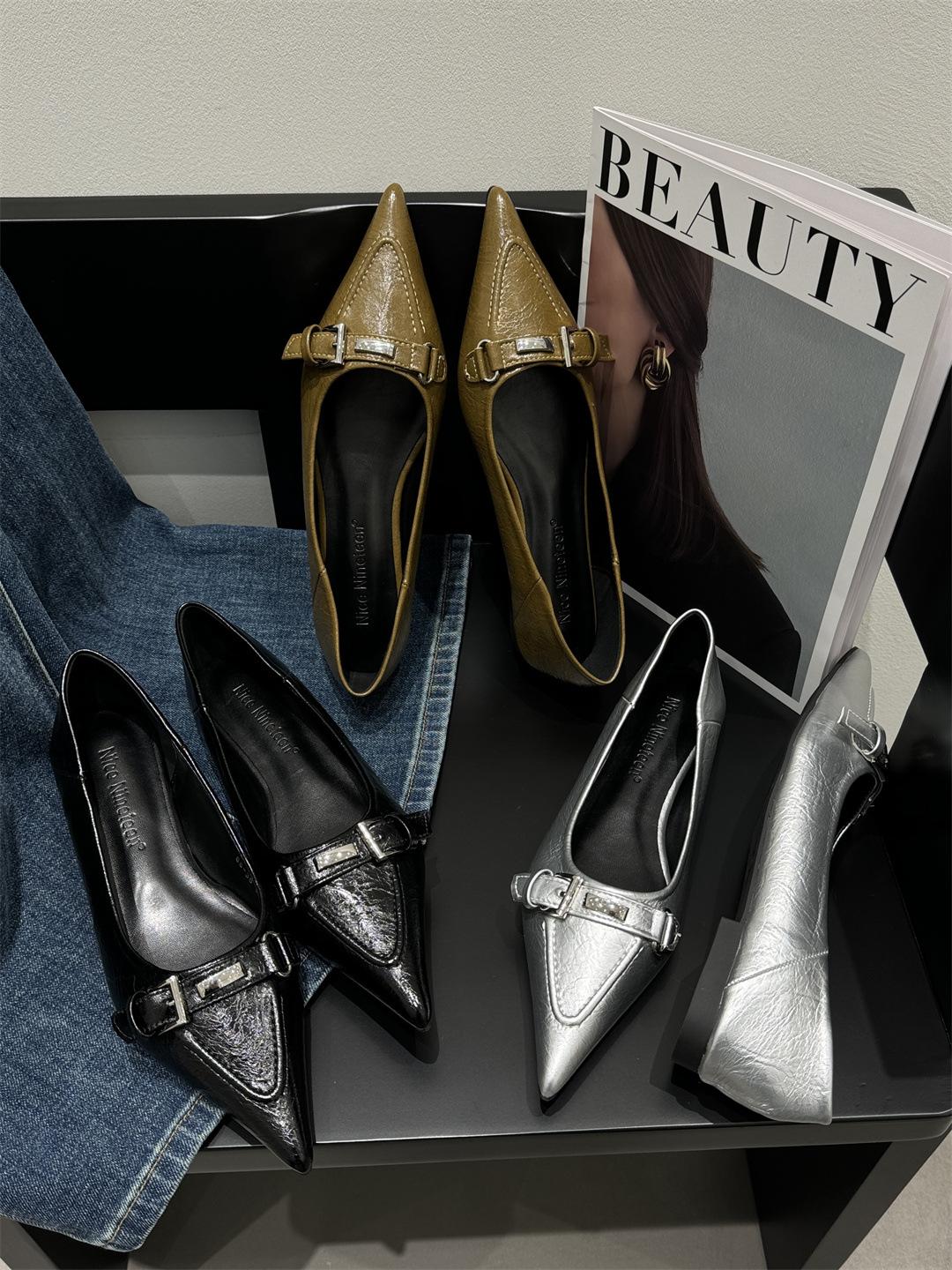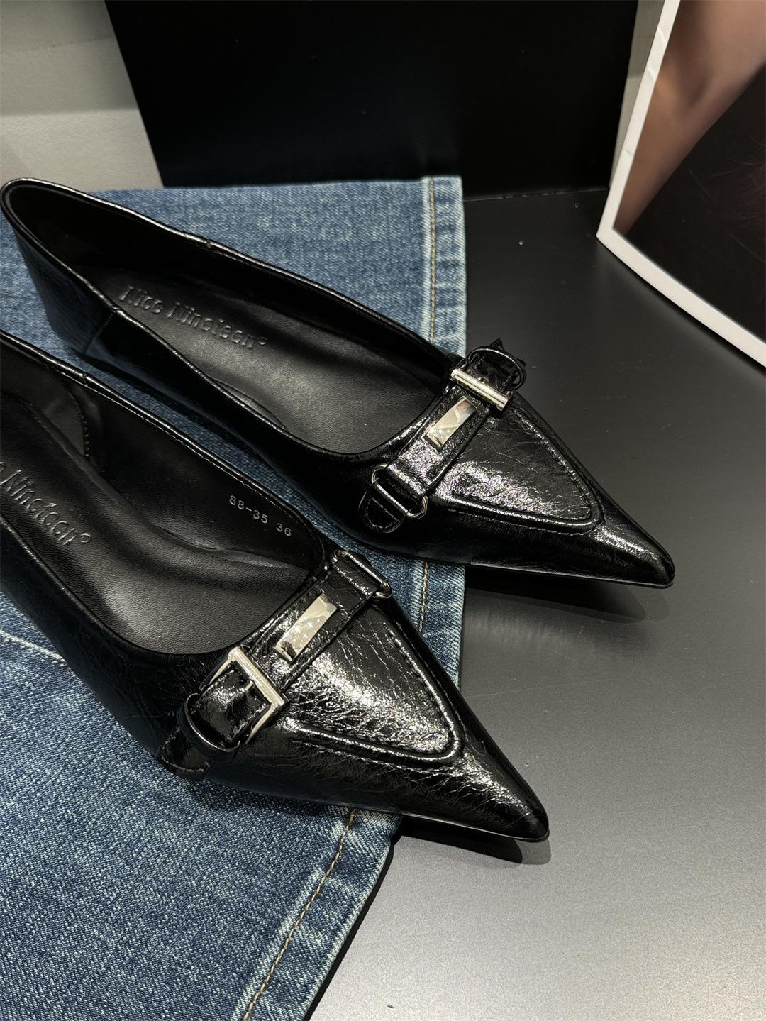 Zapatos planos de punta para primavera 2025 con hebilla metálica, zapatos de mujer de boca baja con suela blanda, mocasines cómodos de tacón bajo