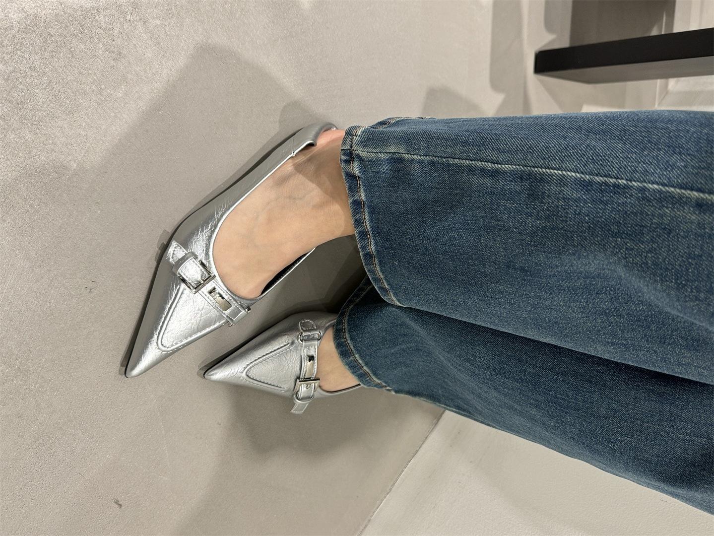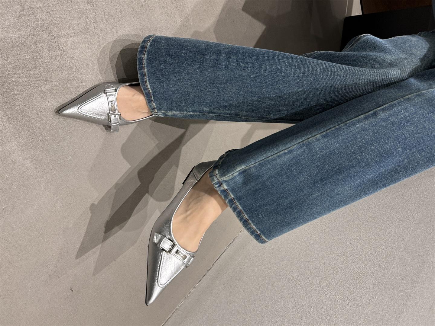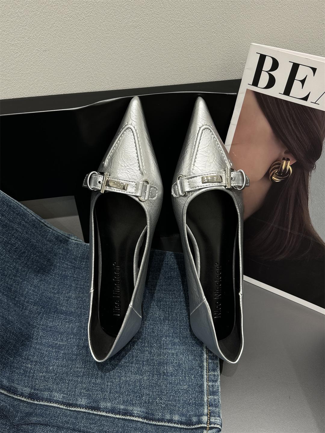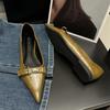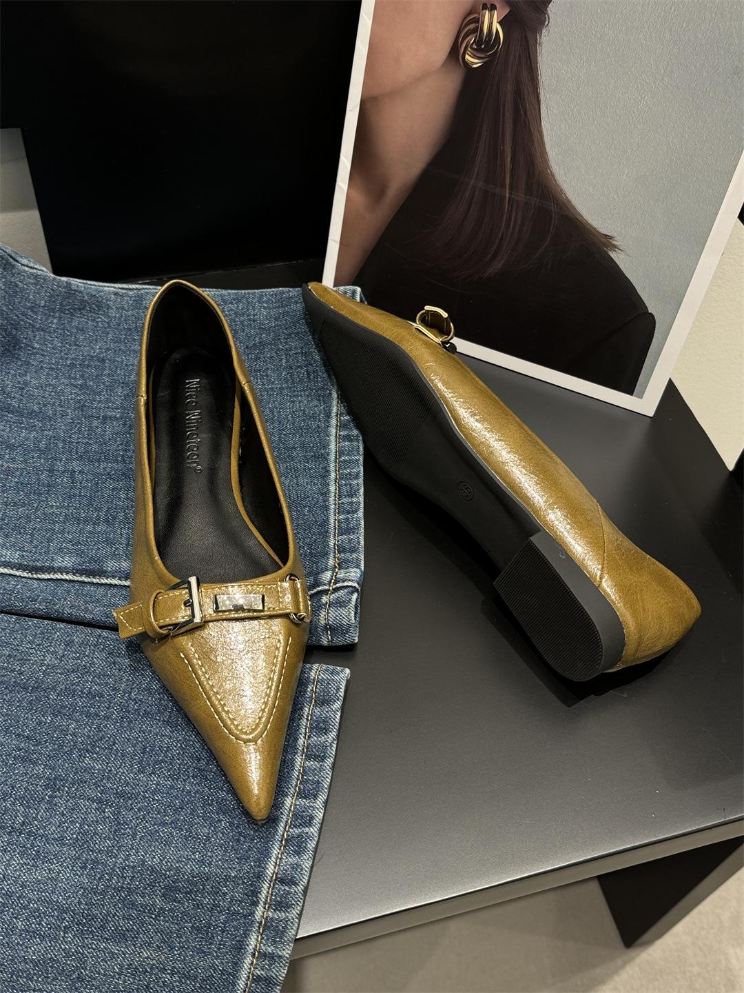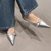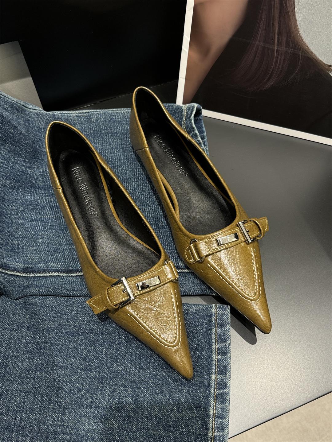 Zapatos planos de punta para primavera 2025 con hebilla metálica, zapatos de mujer de boca baja con suela blanda, mocasines cómodos de tacón bajo