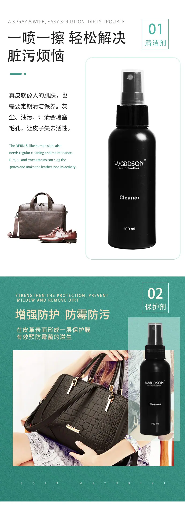 Cleaning, stain removal, decontamination, protection, nourishing leather
