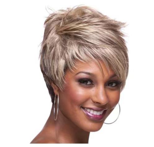 Peluca de fibra química de seda de alta temperatura con degradado dorado esponjoso de pelo corto para mujeres transfronterizas europeas y americanas, cubierta para la cabeza de fábrica en stock, generación de cabello