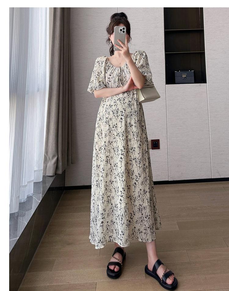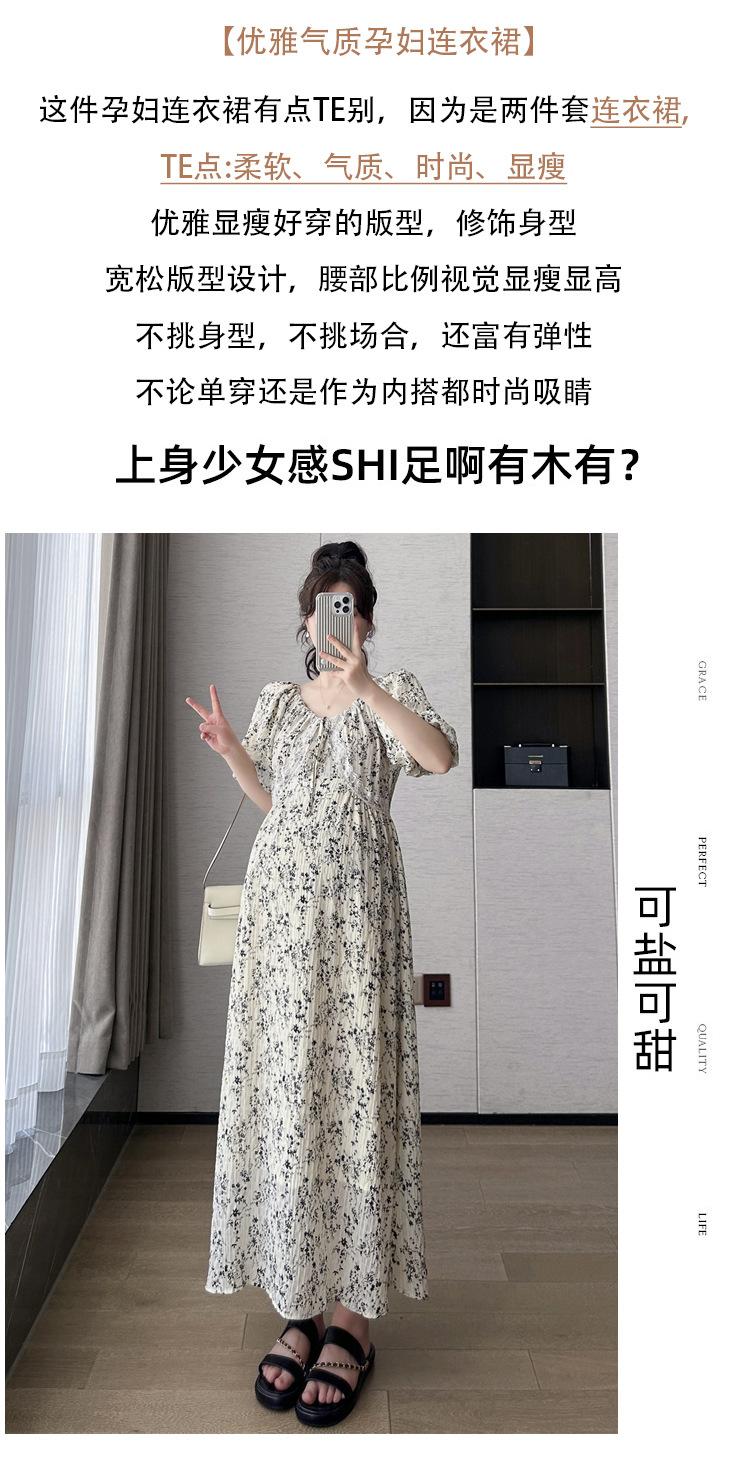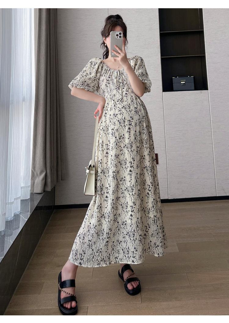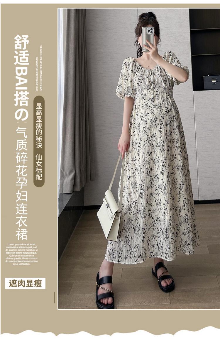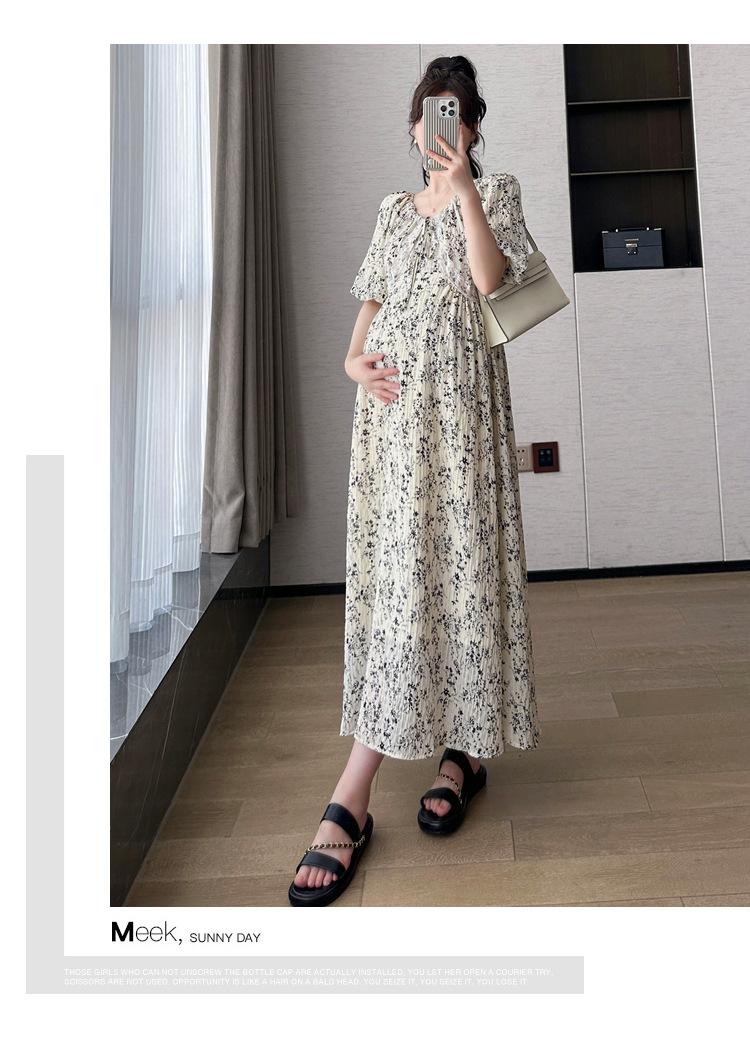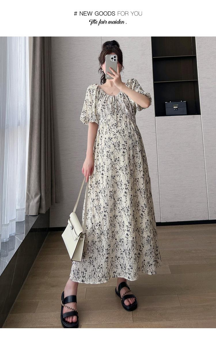 Maternidad Verano Nuevo Dulce Moda Estampado Manga Burbuja Largo Floral Suelto Vestido para Mujeres Embarazadas