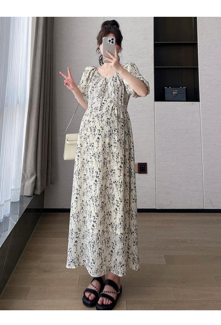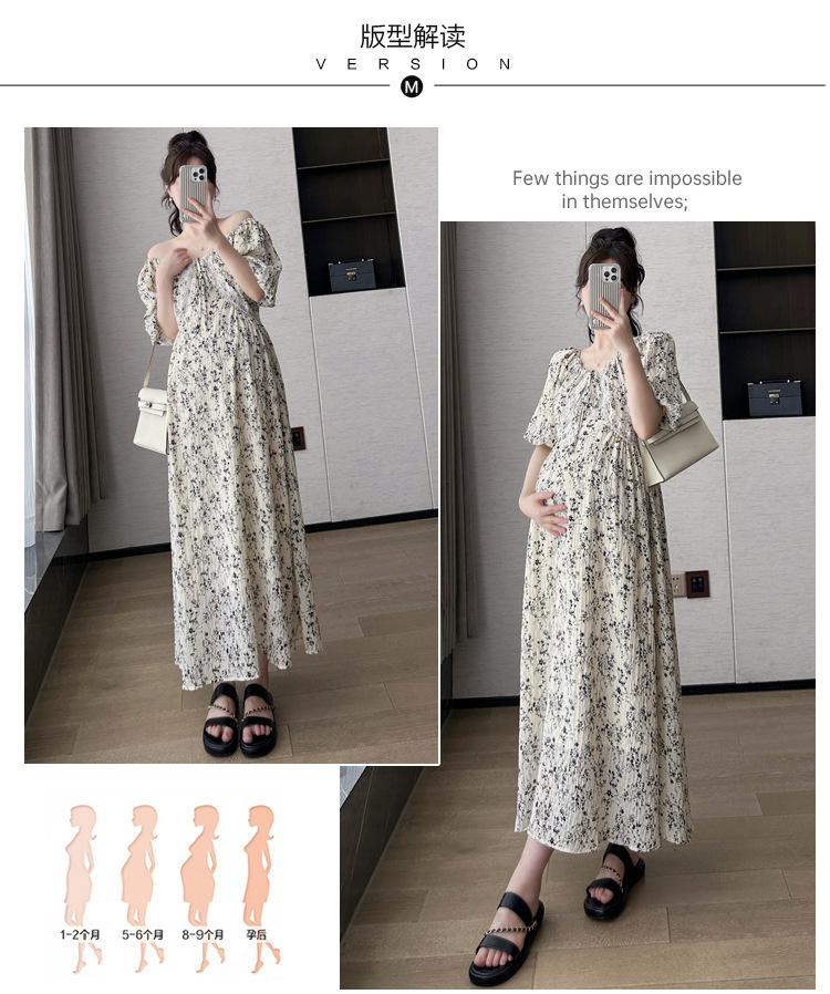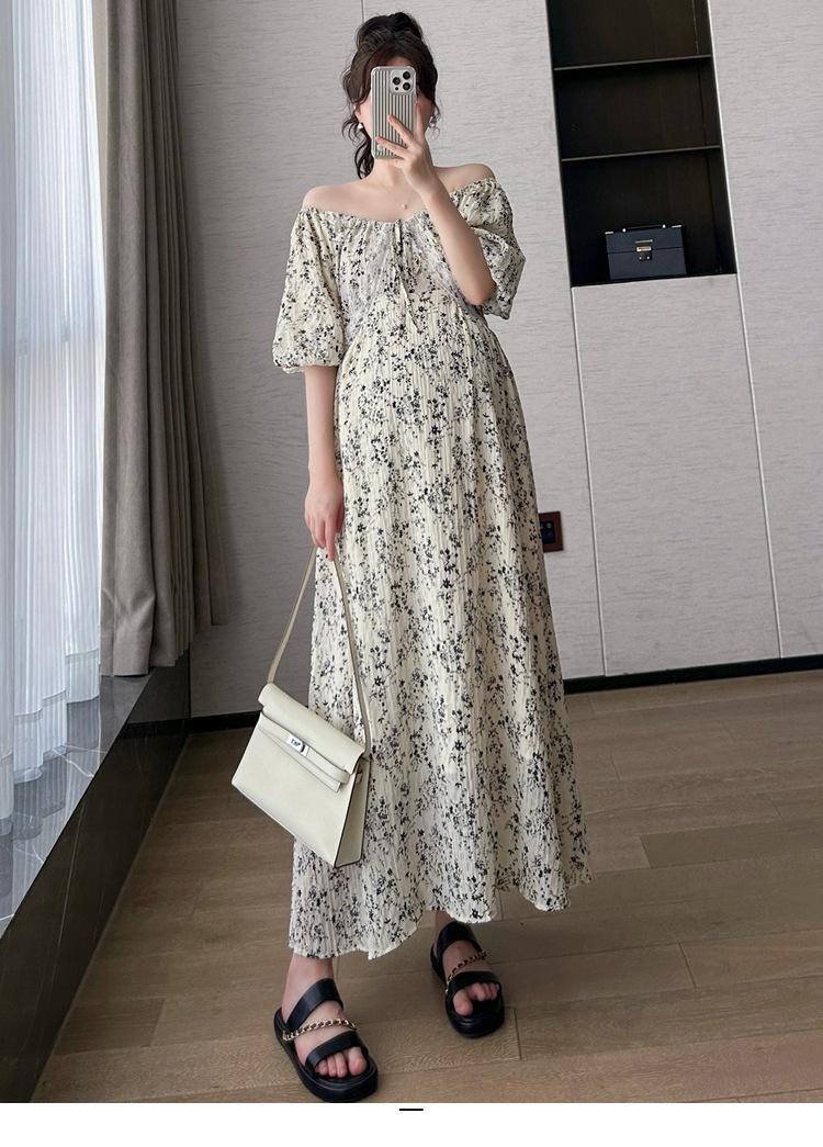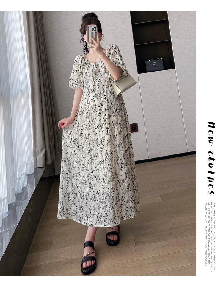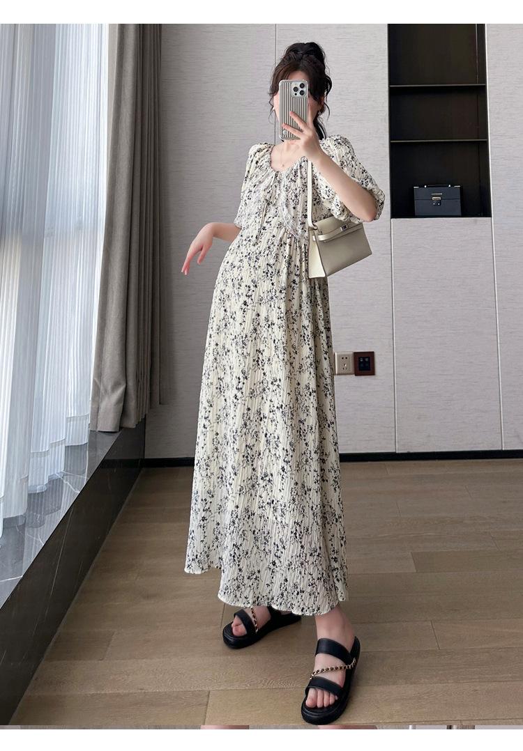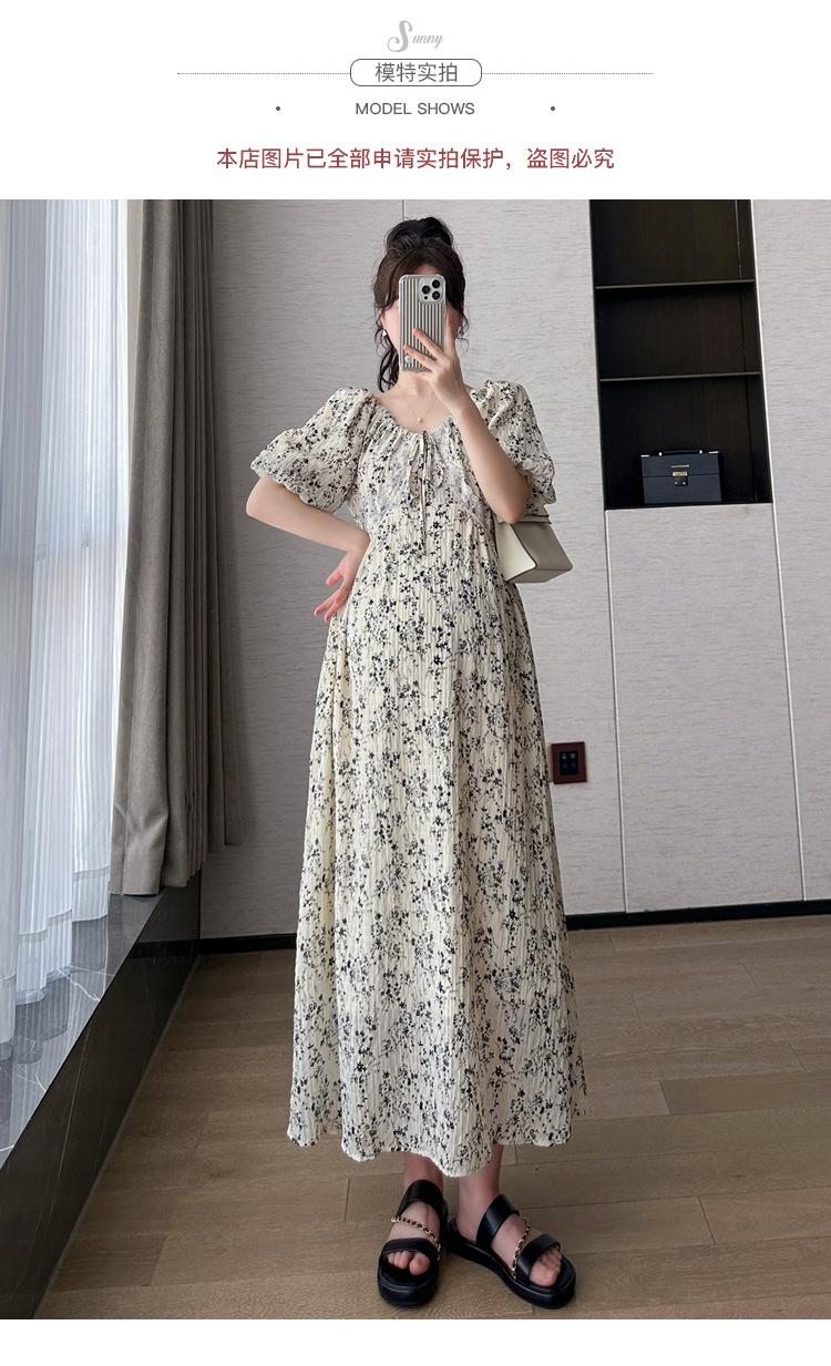 Maternidad Verano Nuevo Dulce Moda Estampado Manga Burbuja Largo Floral Suelto Vestido para Mujeres Embarazadas