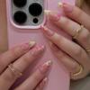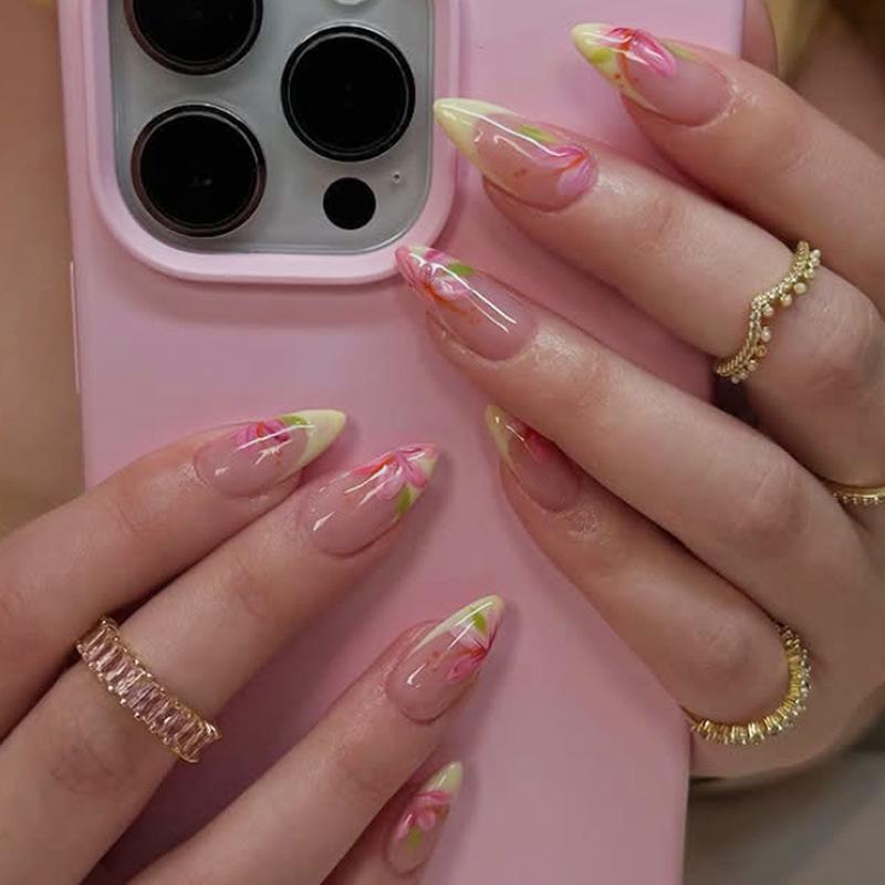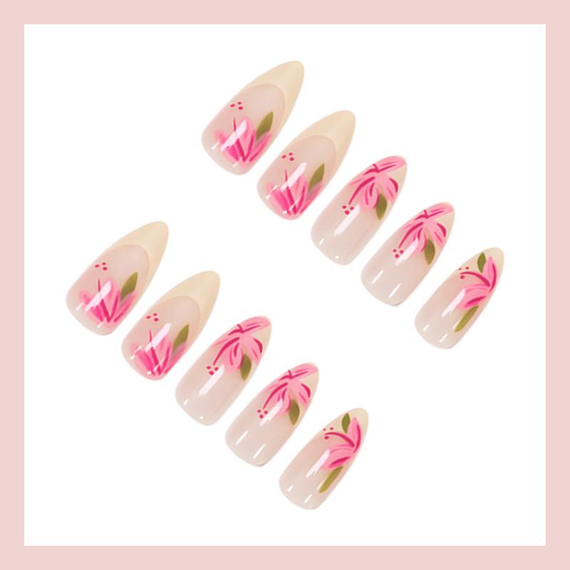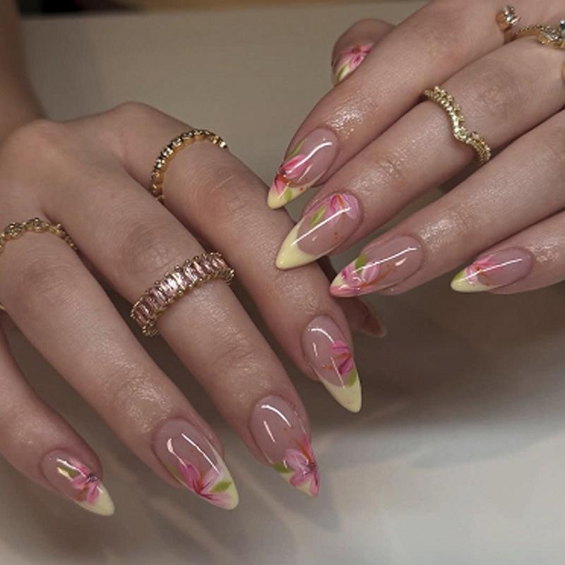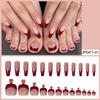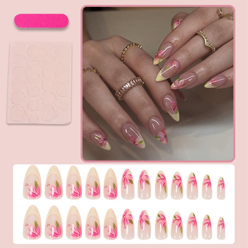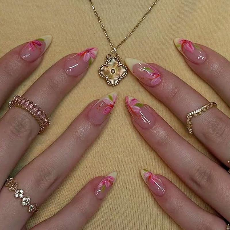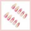 Uñas Postizas Transfronterizas Europeas y Americanas Almendra Manicura Francesa Flor Roja Parche Removible Uñas para Usar Venta al por Mayor