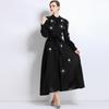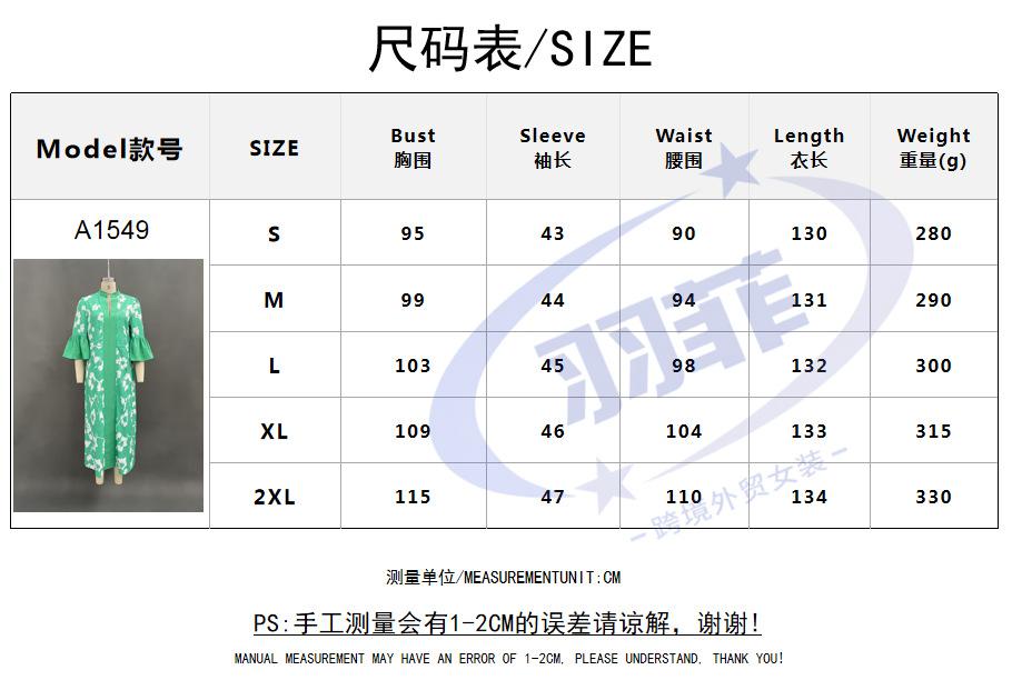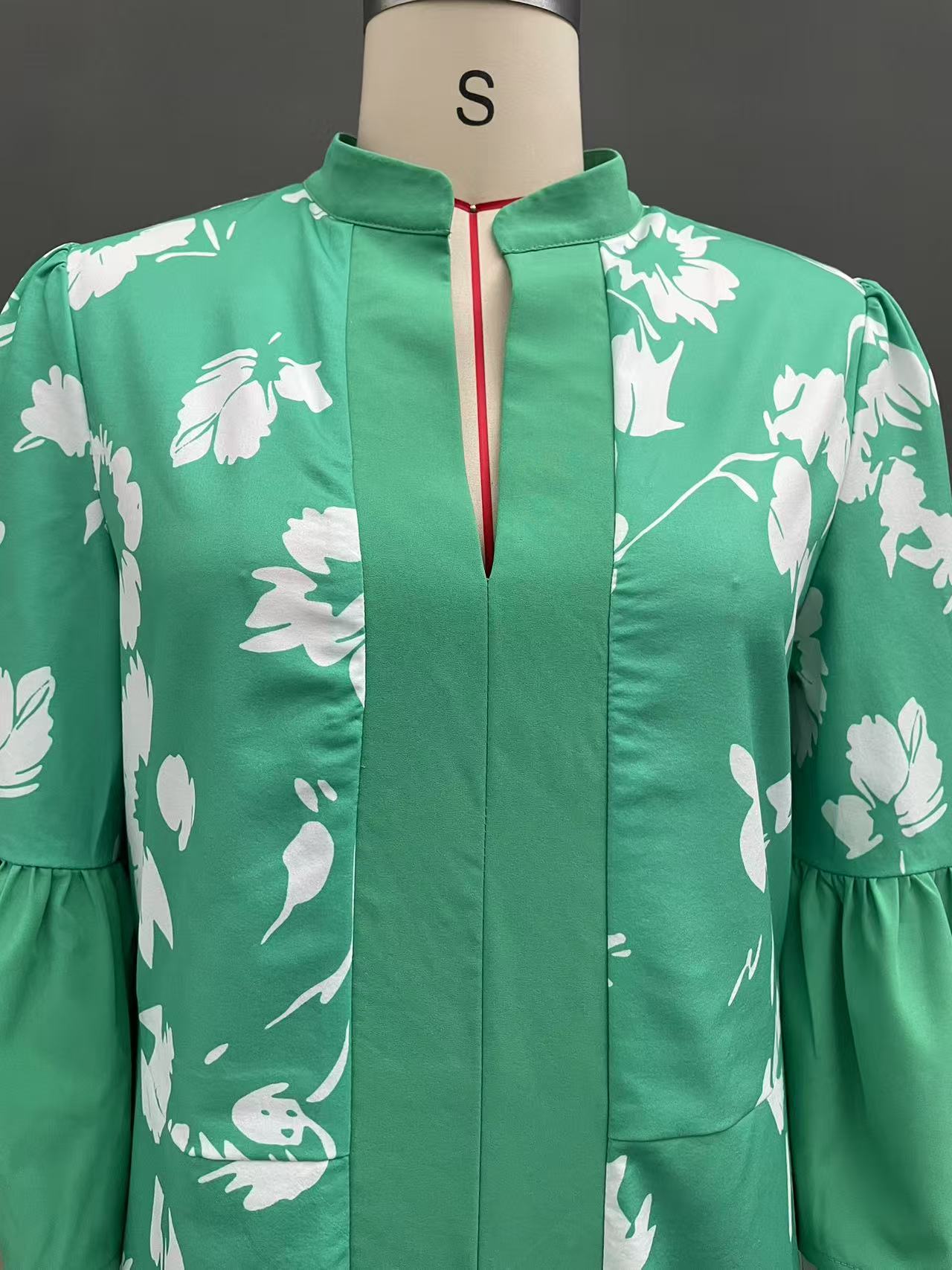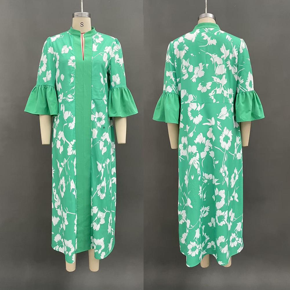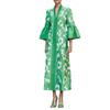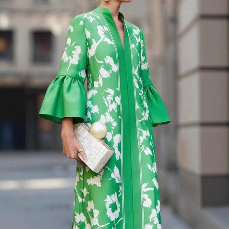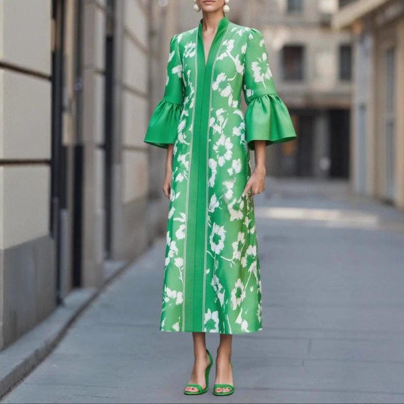 Estilo europeo y americano transfronterizo TEMU2025 otoño nuevo manga abullonada estampada cuello en V profundo elegante vestido largo verde para mujer
