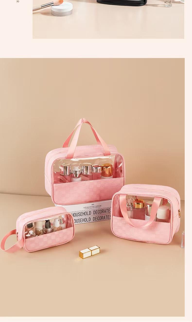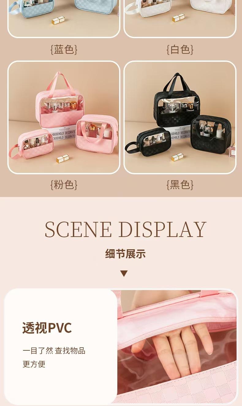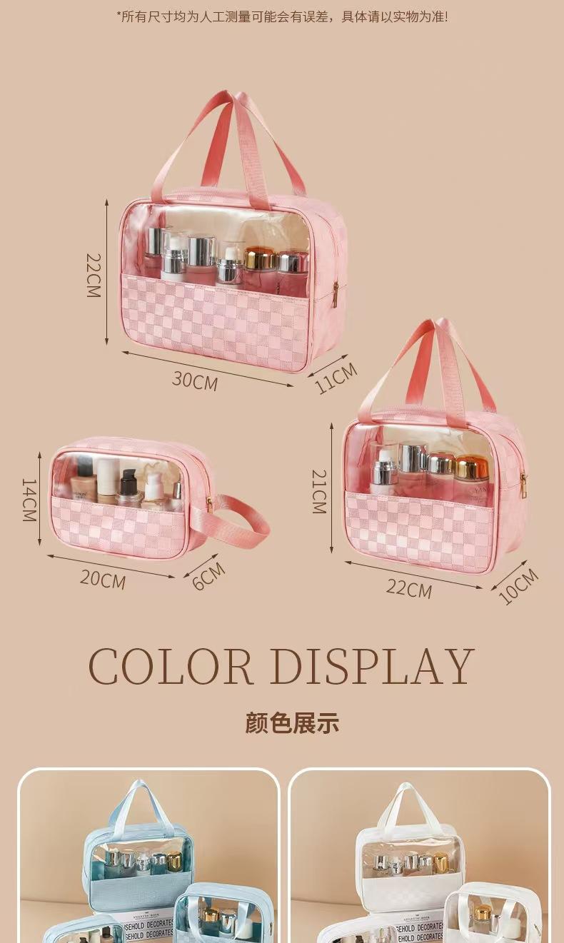 Set de Tres Piezas de Bolsa de Cosméticos Transparente de Alto Valor Gran Capacidad Bolsa de Aseo de Viaje Bolsa Organizadora de Cosméticos a Cuadros PVC