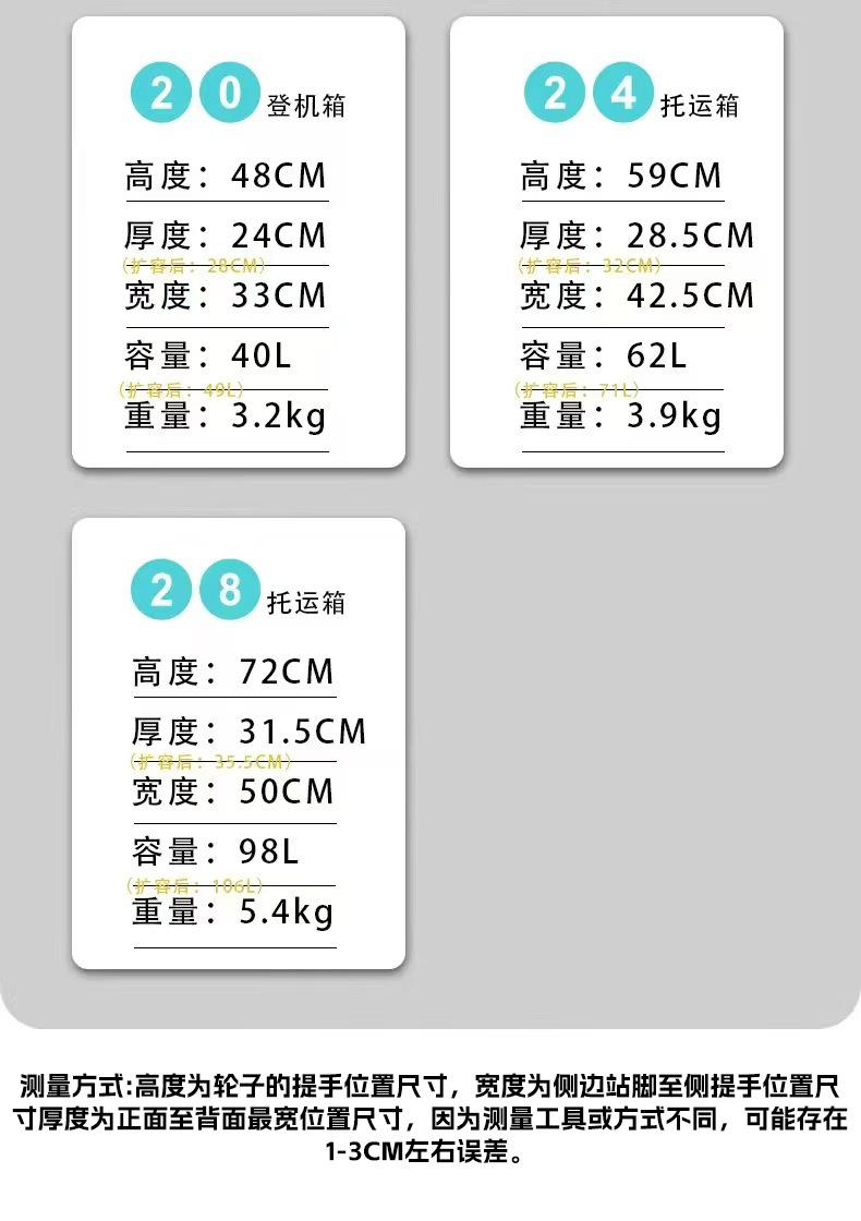 20 inch【Carry-on + YKK Explosion-proof Zipper】, 24 inch【Need to check in + YKK explosion-proof zipper】, 28 inc...