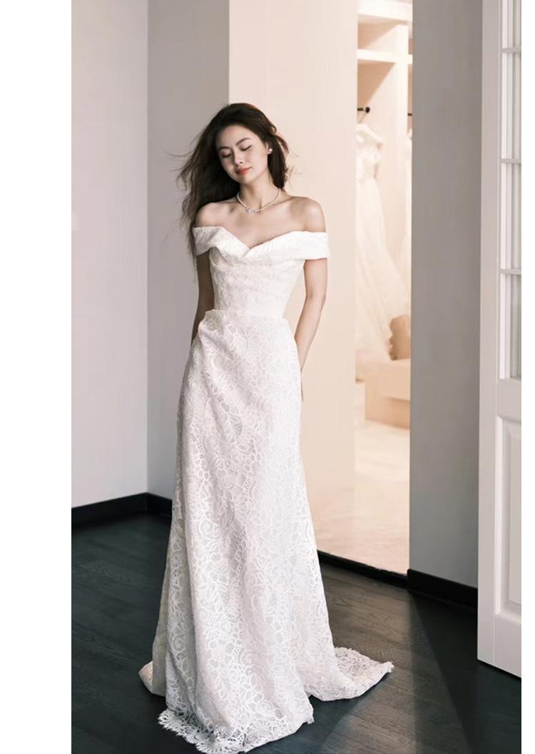 Nuevo Vestido de Novia Ligero de Un Hombro Encaje Francés Vestido con Cola Pequeña Vestido de Novia Vestido de Boda Sencillo Estilo Occidental