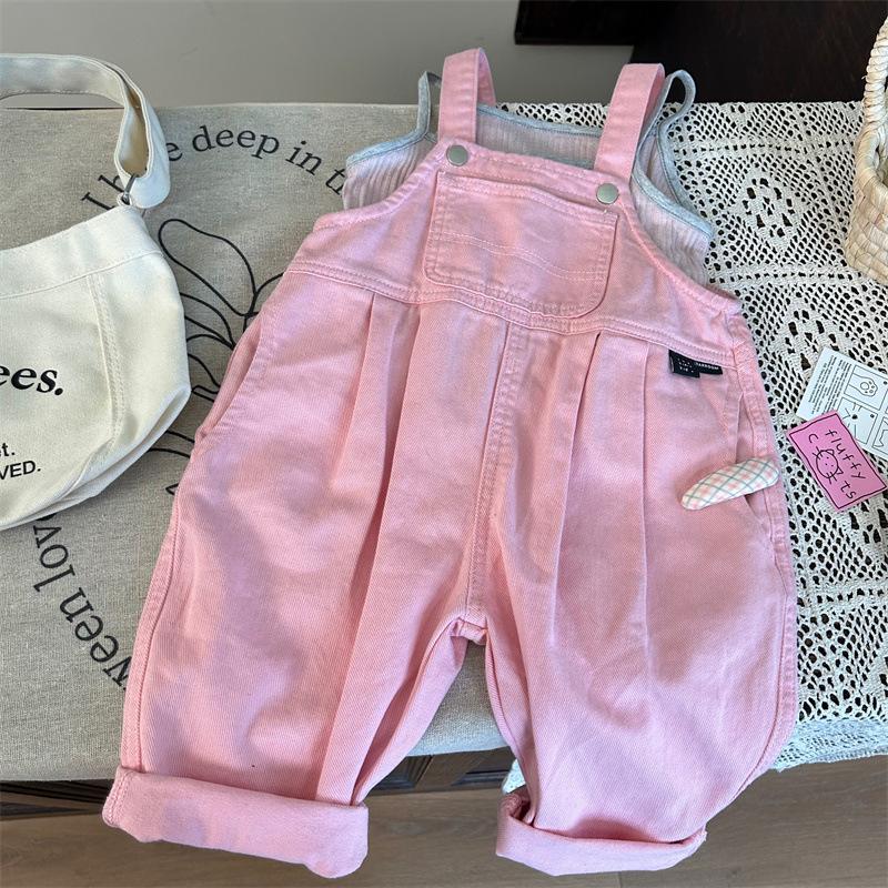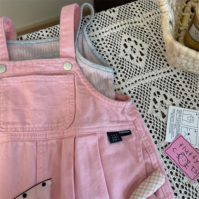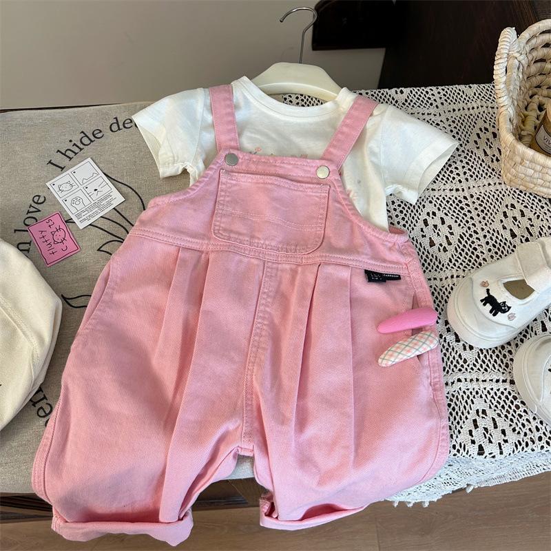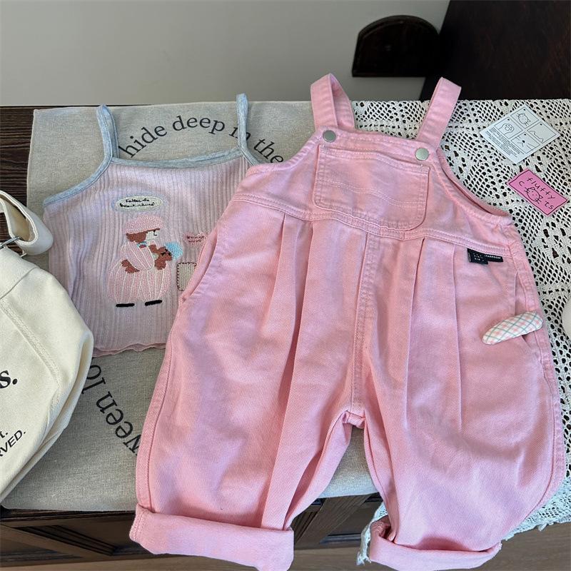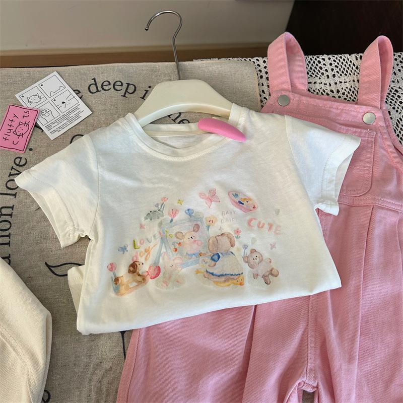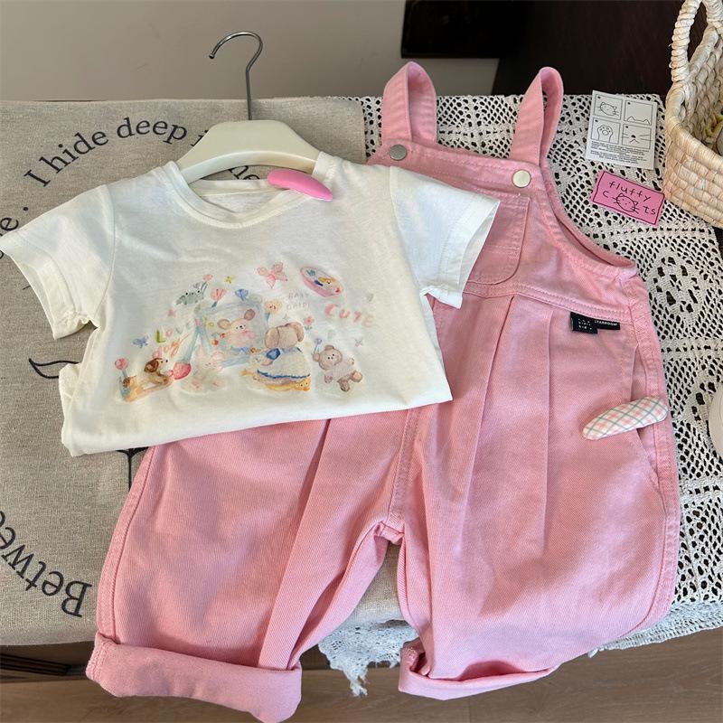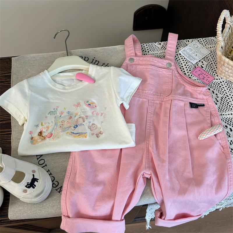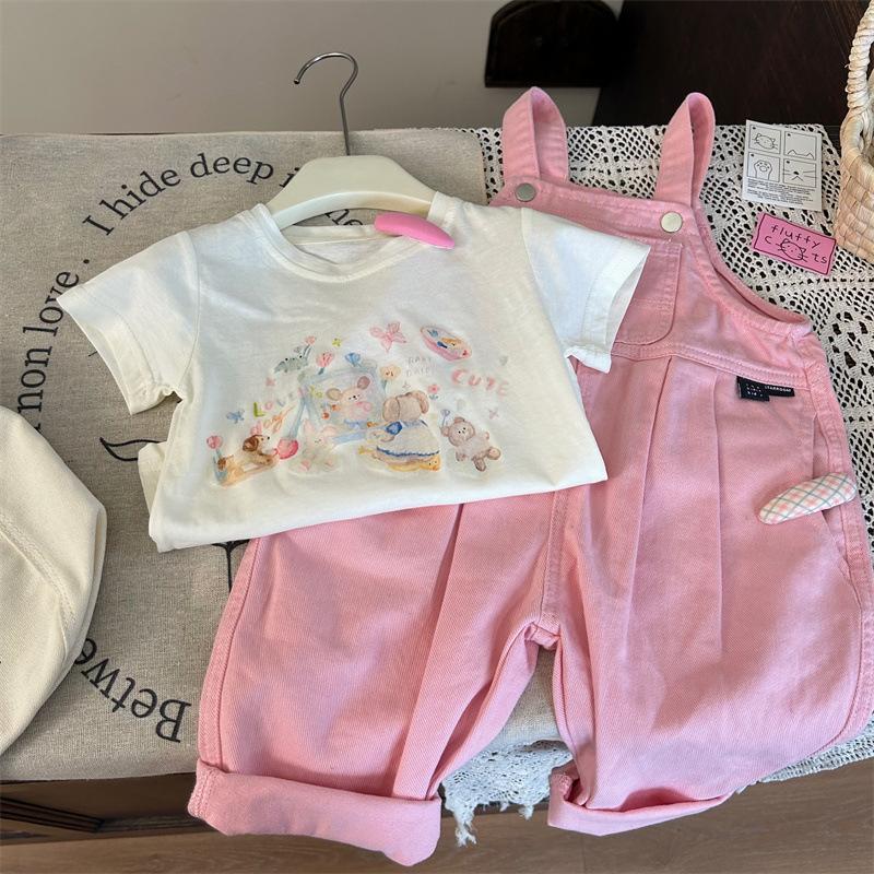 Ropa infantil coreana, novedad de verano 2025, mono holgado con tirantes rosas para niñas, camiseta de dibujos animados, dos piezas de moda