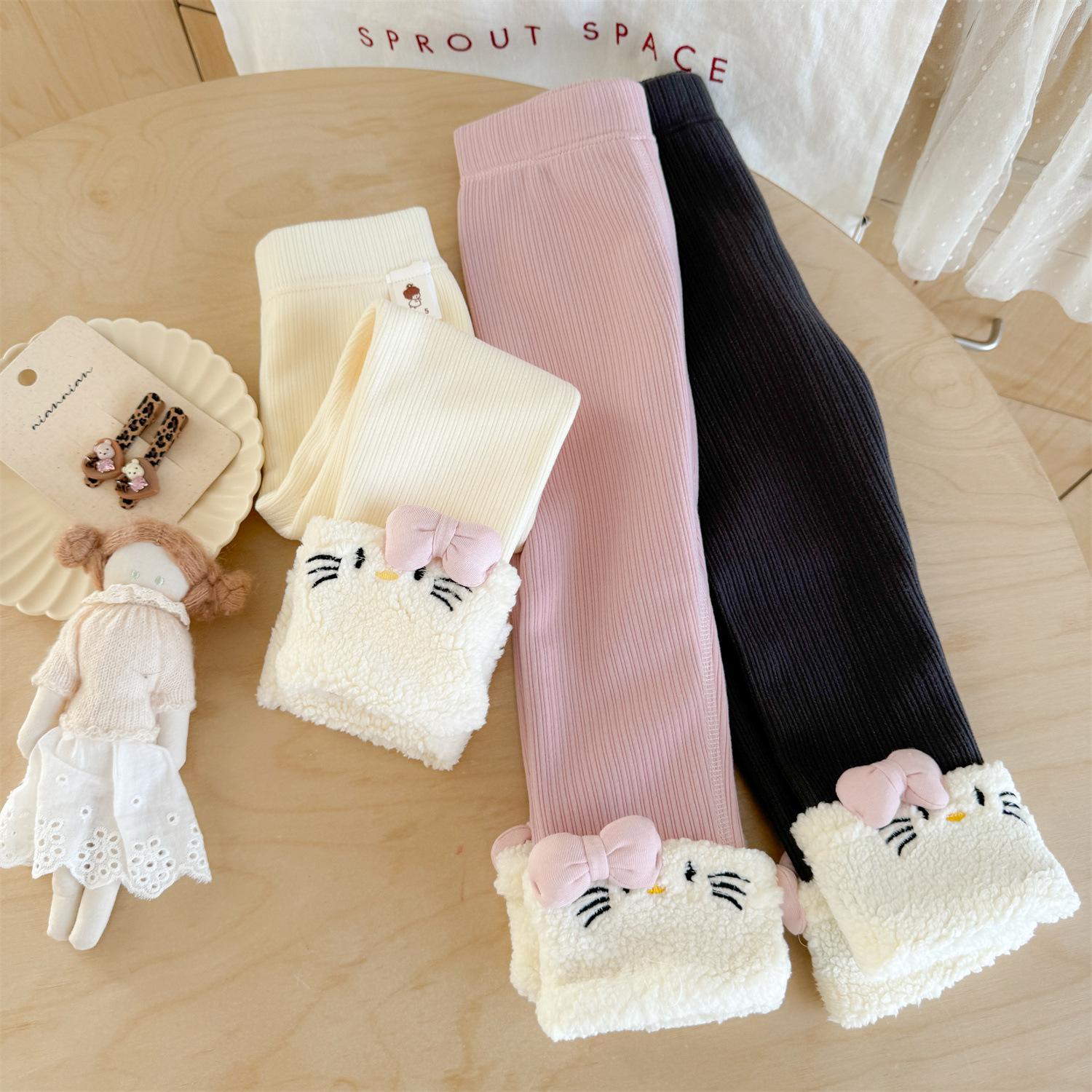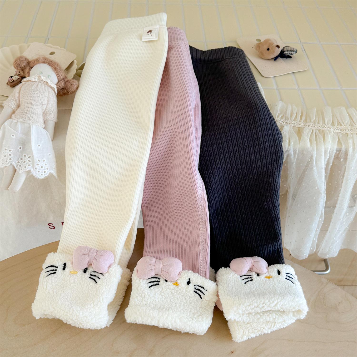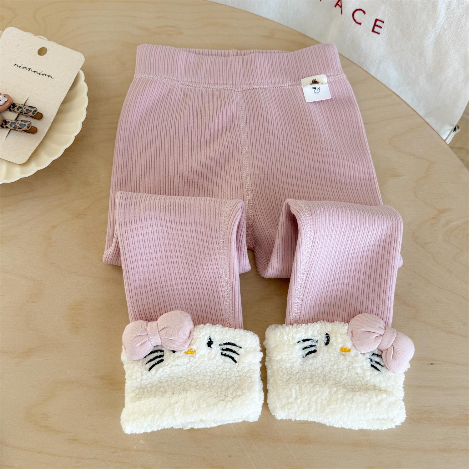 Leggings for Girls with Fleece Lining Autumn and Winter 25 New Children's Cartoon KT Cat Warm Pants Baby Outer Wear Long Pants Trendy Cross-Border