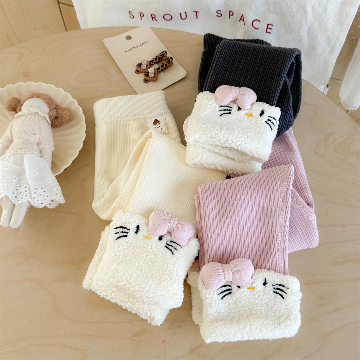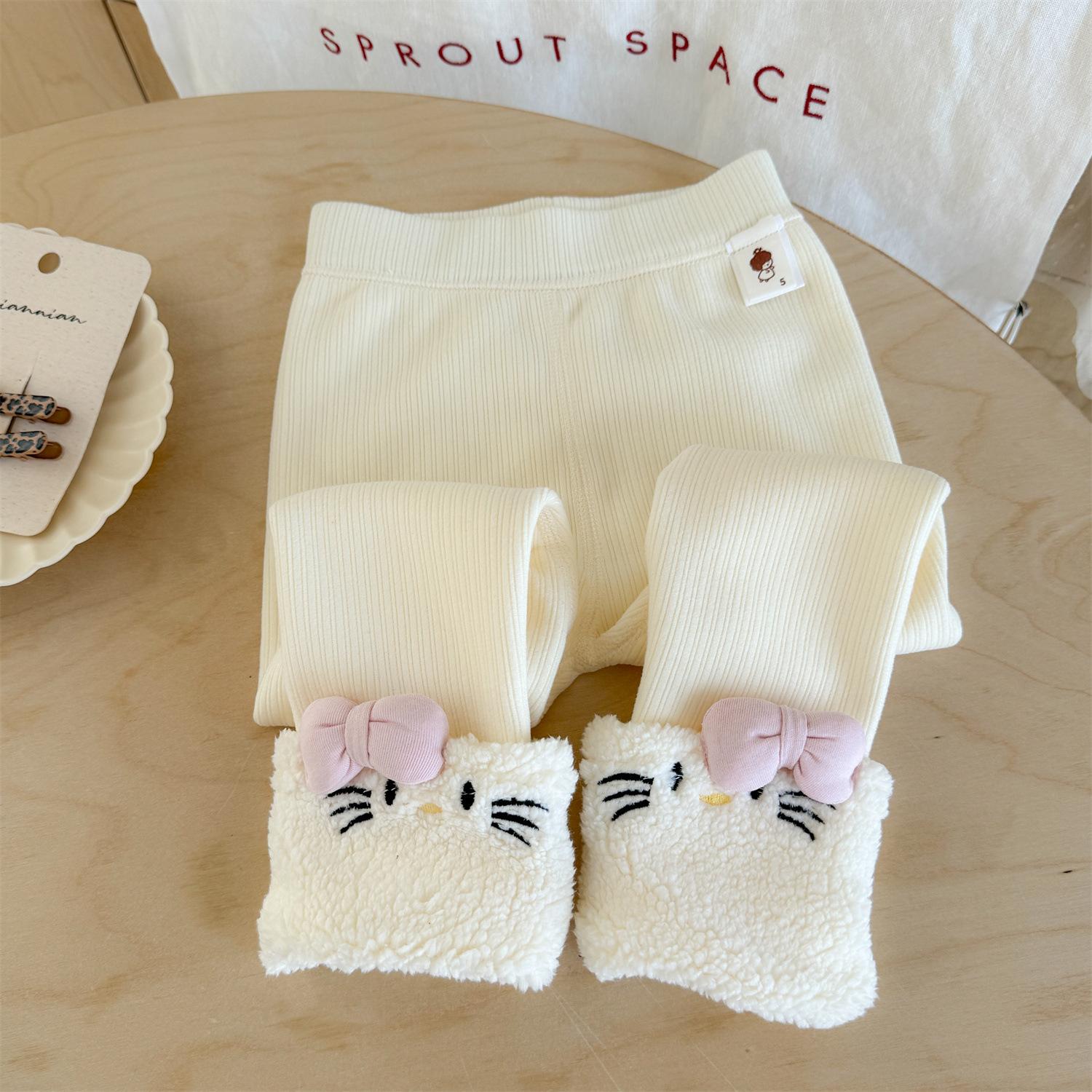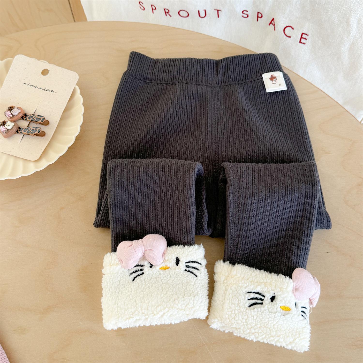 Leggings for Girls with Fleece Lining Autumn and Winter 25 New Children's Cartoon KT Cat Warm Pants Baby Outer Wear Long Pants Trendy Cross-Border