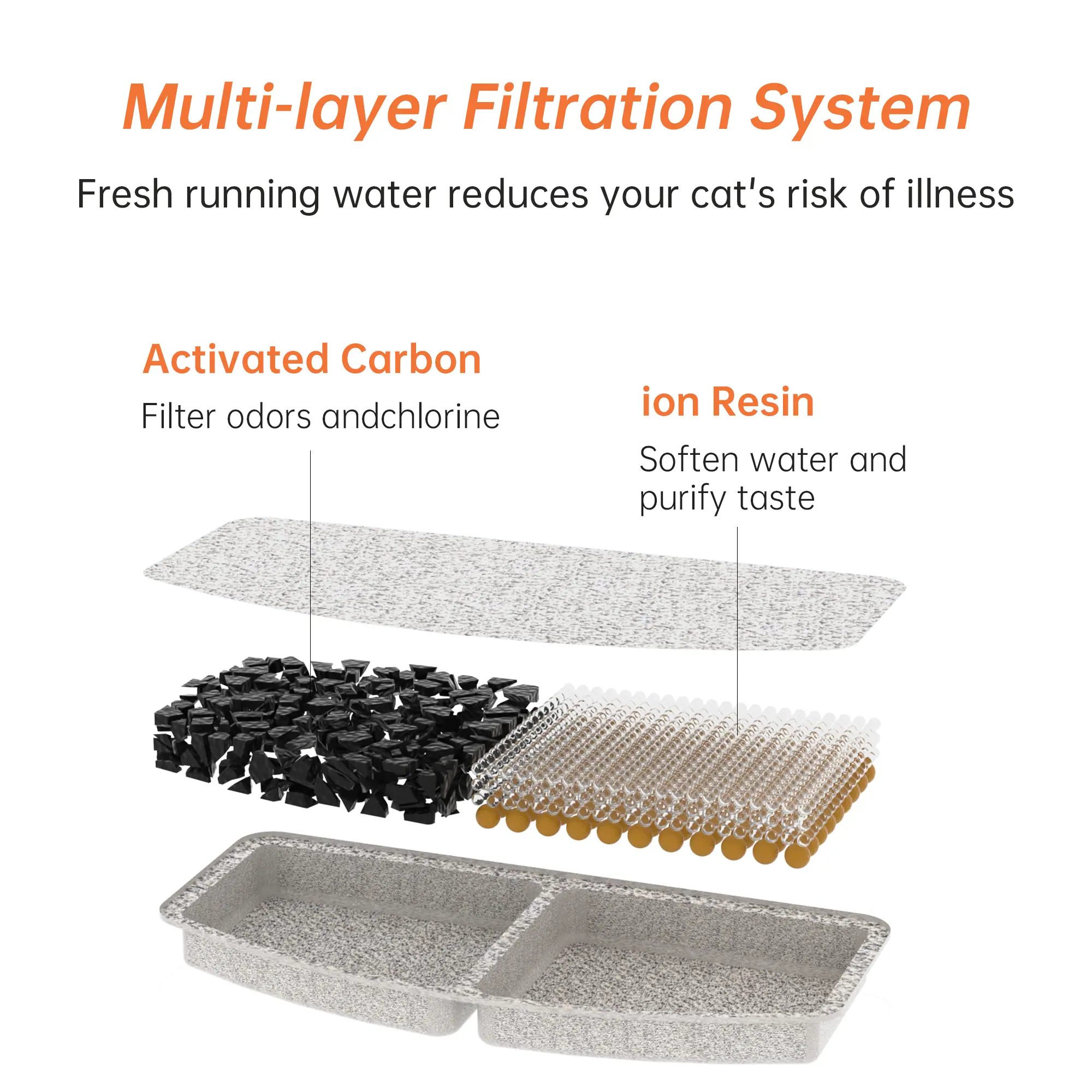 Una fuente para mascotas con filtración de 5 capas garantiza agua limpia. Incluye filtros naturales: carbón activado, resina iónica y más para eliminar pelos, olores e impurezas.