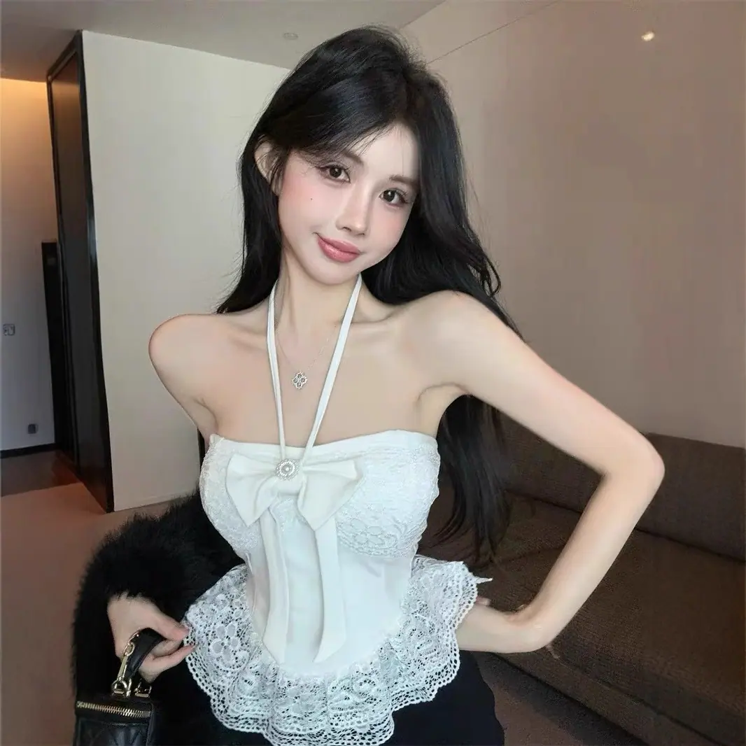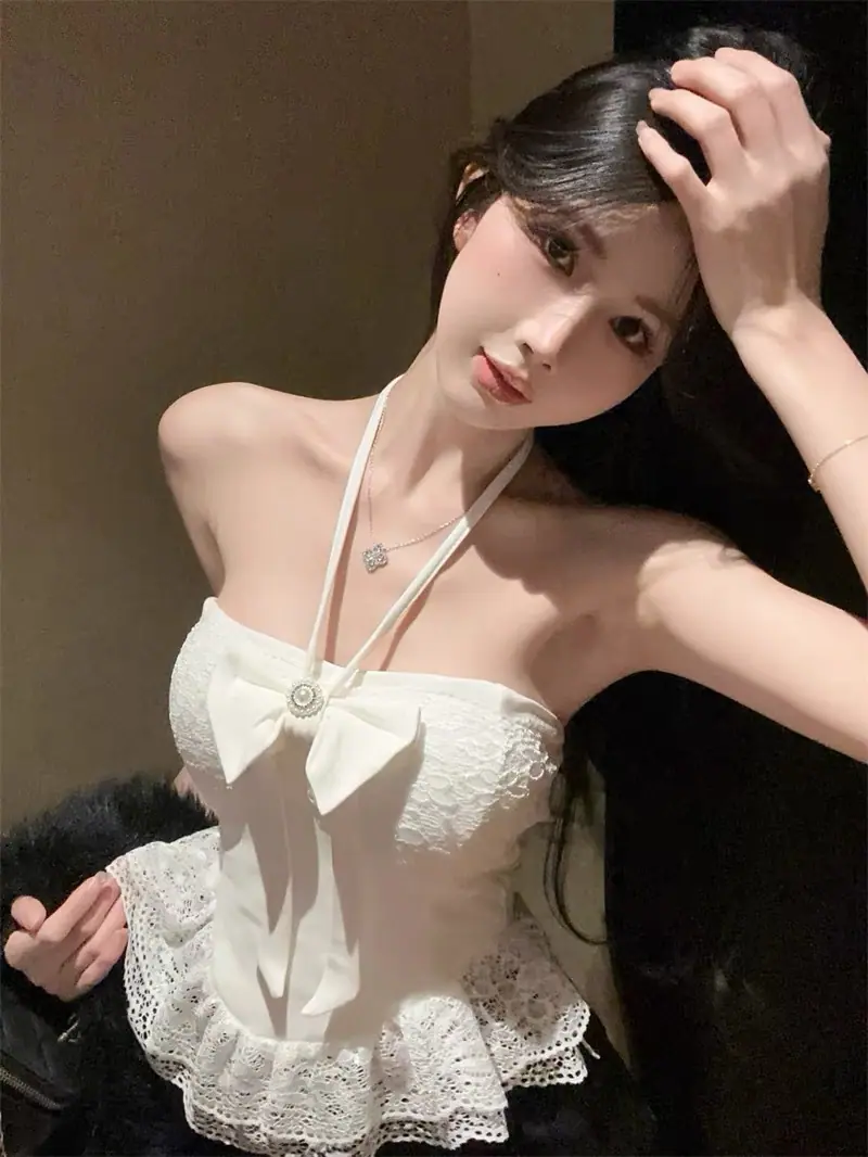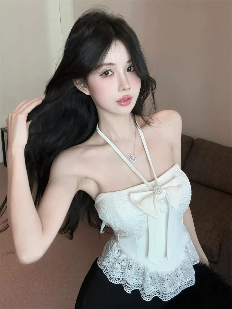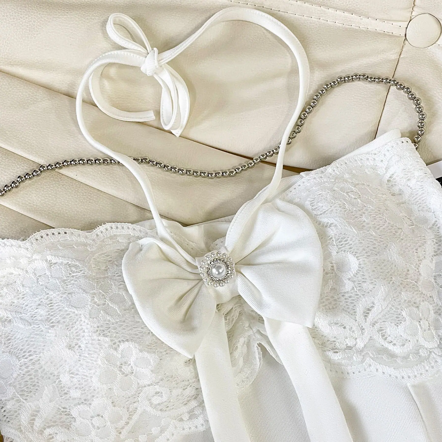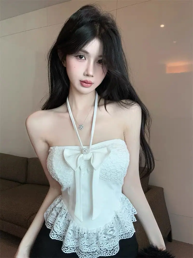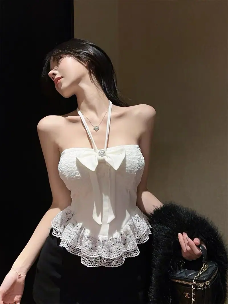 #6612 Estilo Corte Camisola Blanca Strapless con Hombros Descubiertos con Lazo Tirantes con Almohadillas en el Pecho Espalda Sexy Hermosa