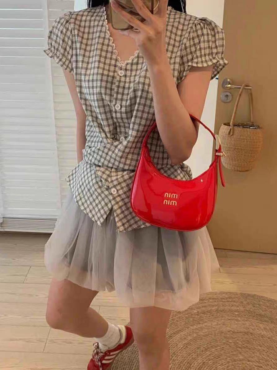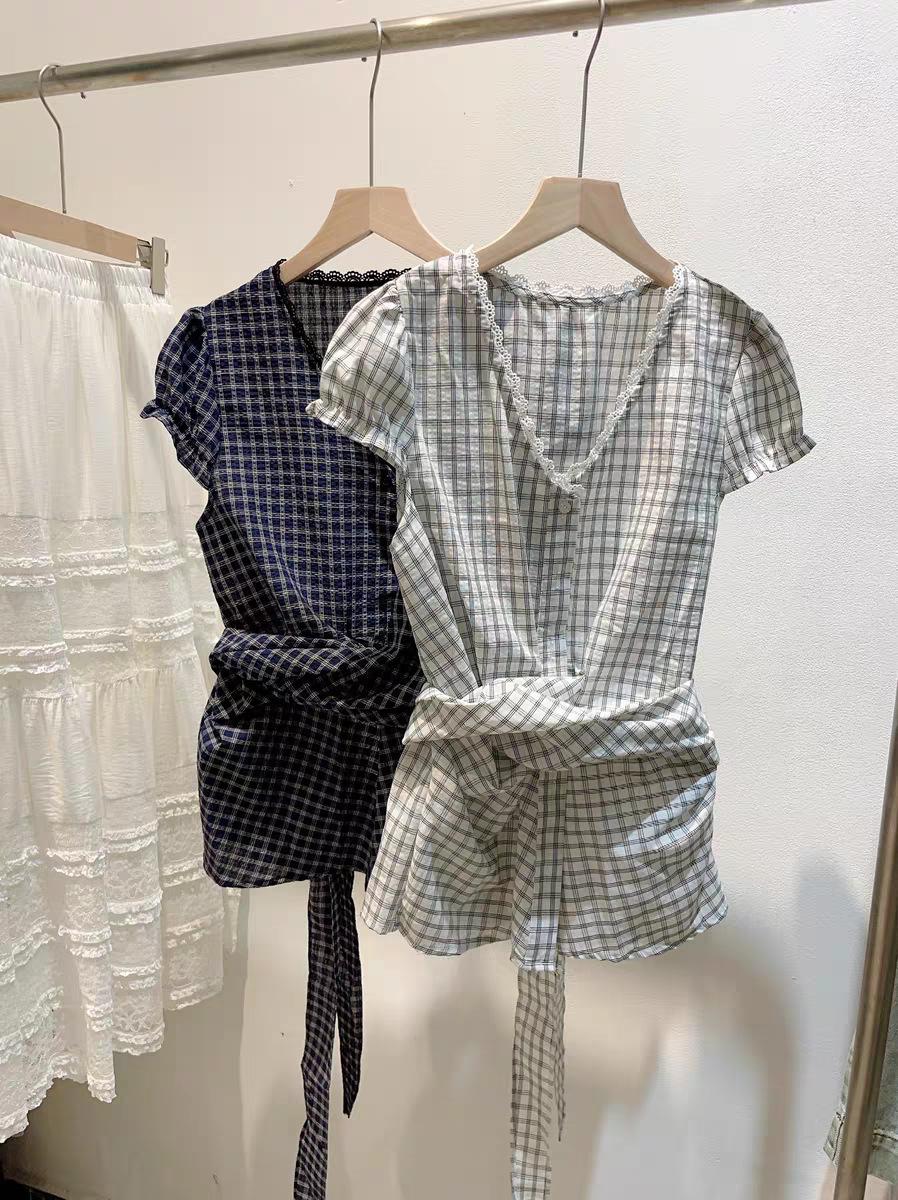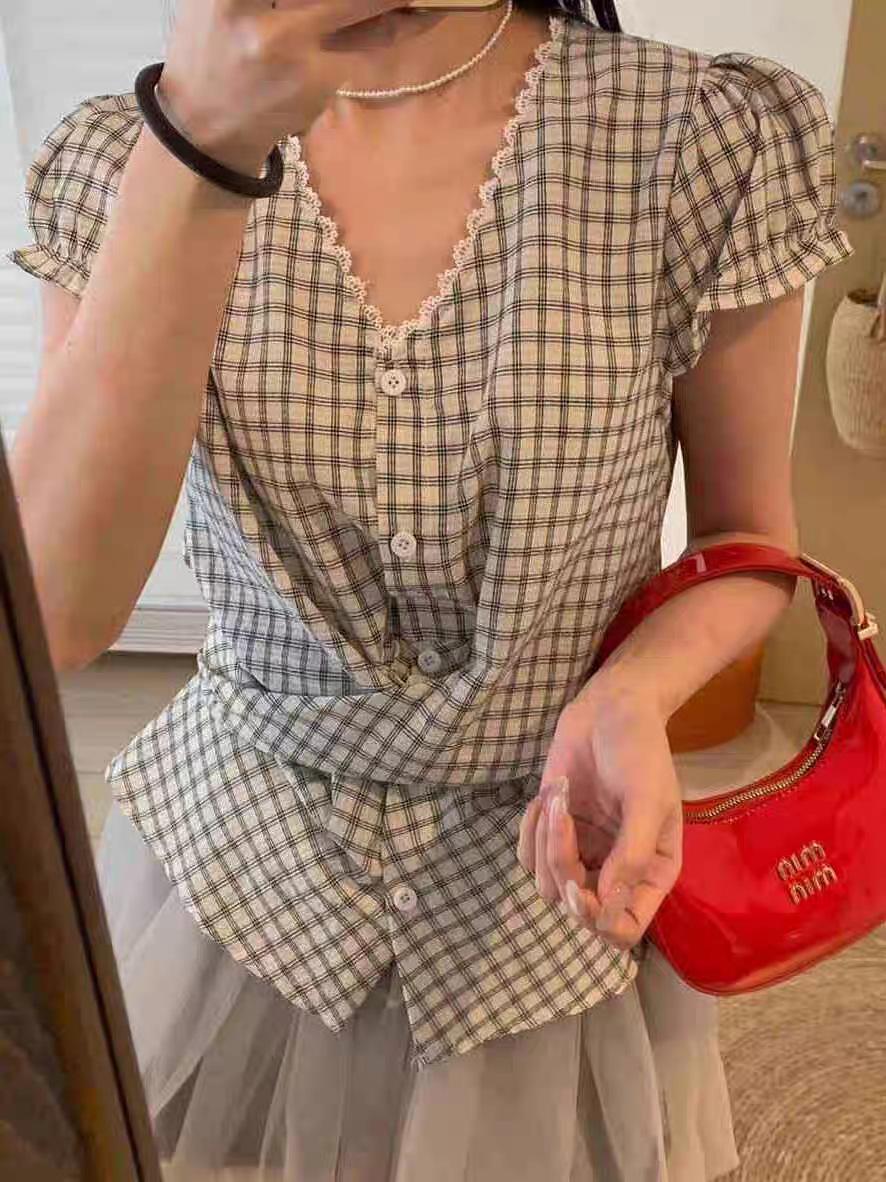 Compra Estilo coreano versión coreana ropa de mujer 2025 verano cuadros cuello en V entallada adelgazante camisa top al por mayor en Joom.pro