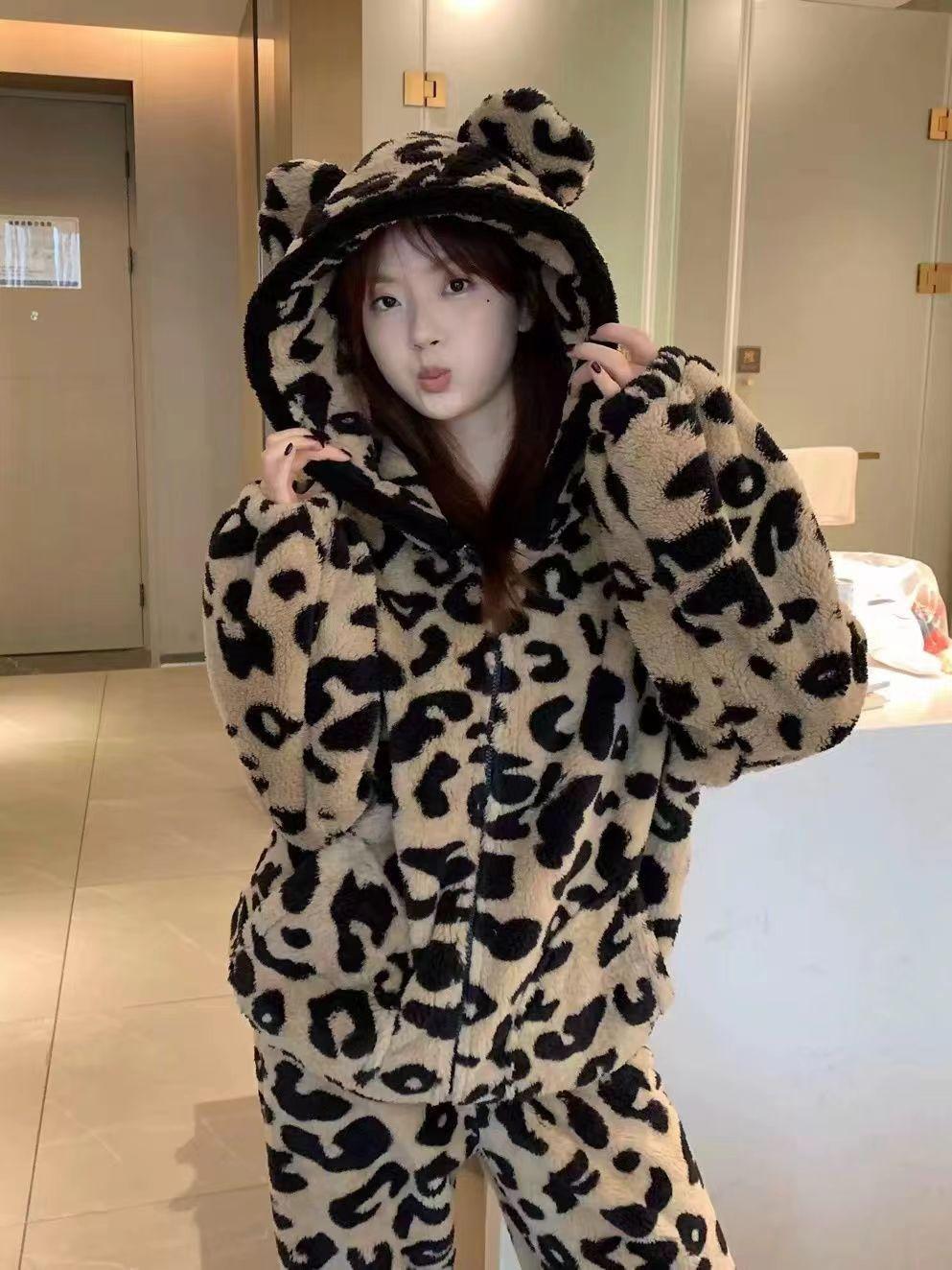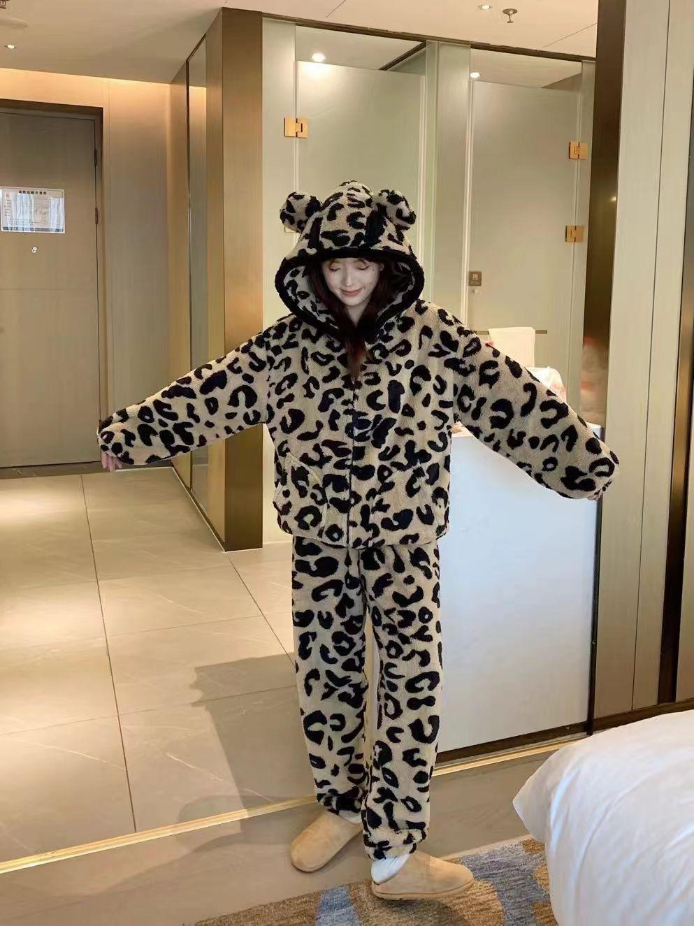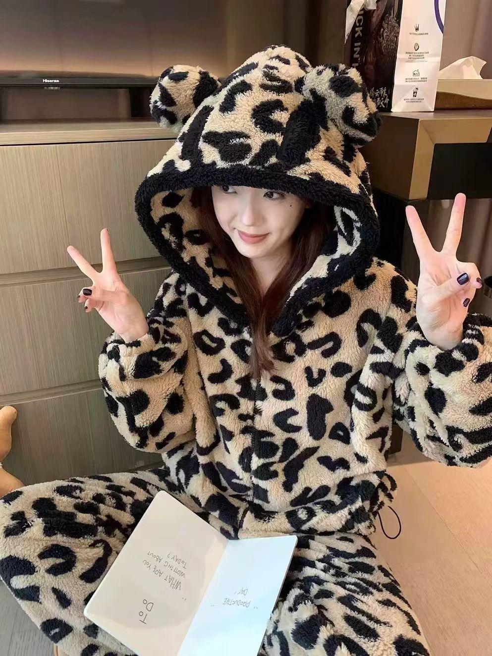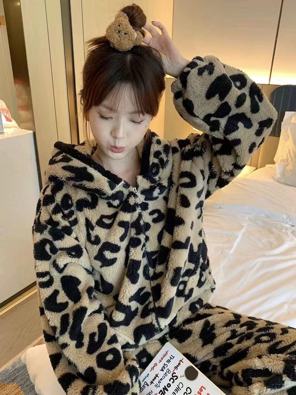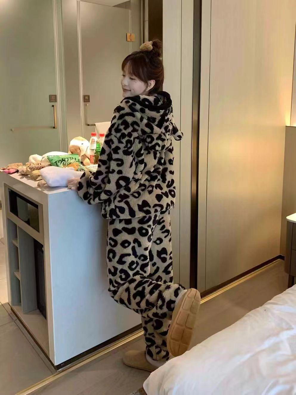 Pijama con capucha de forro polar coral con estampado de leopardo estilo coreano para mujer, invierno, nuevo, plus terciopelo, plus grueso, cálido, conjunto de ropa para el hogar de invierno