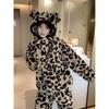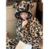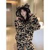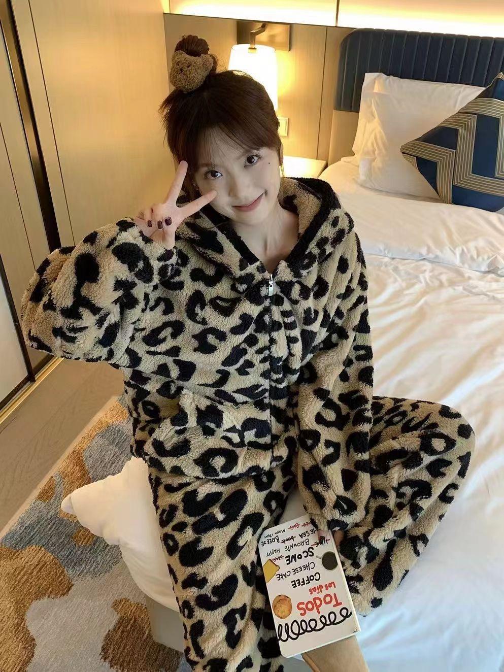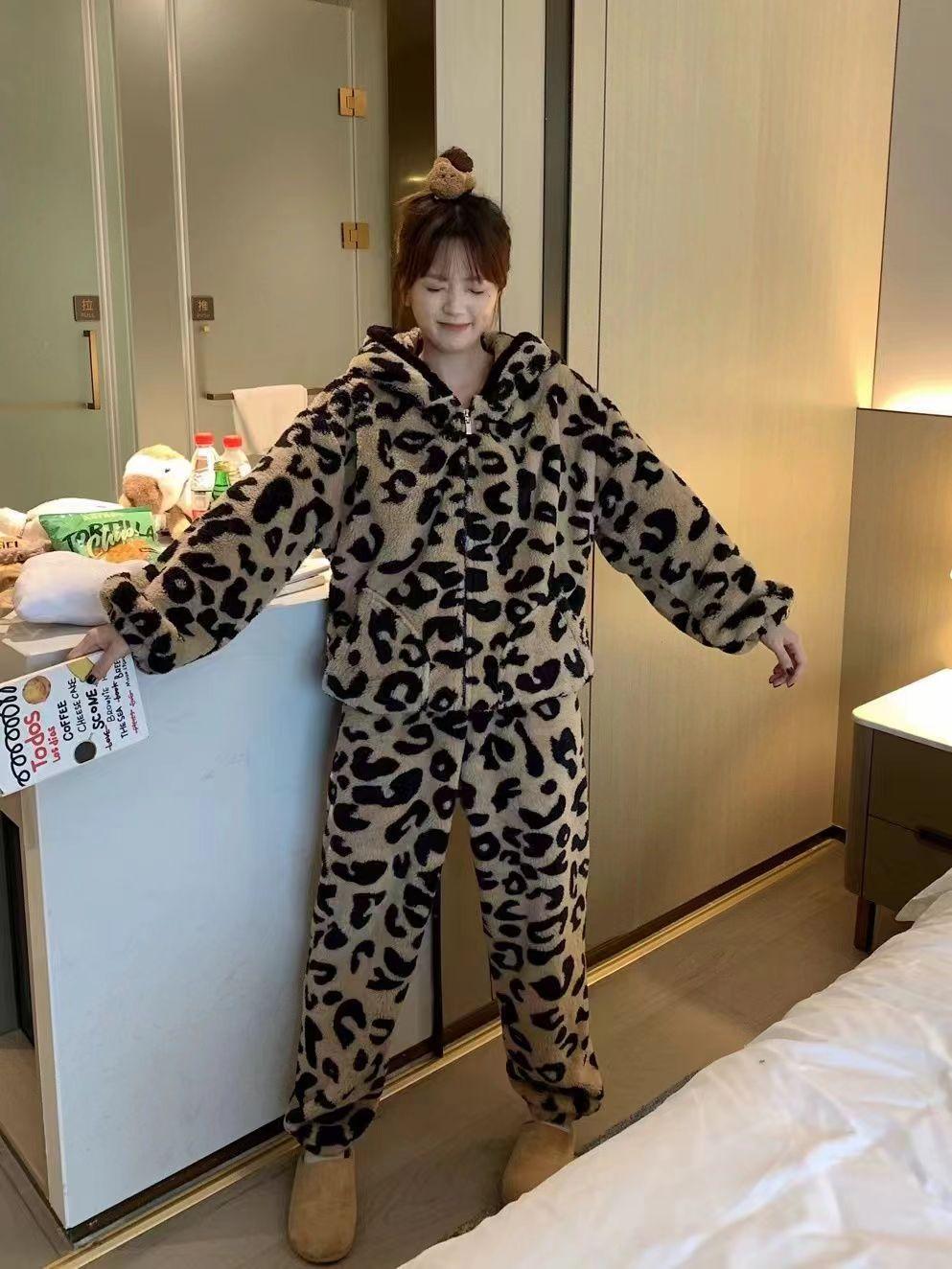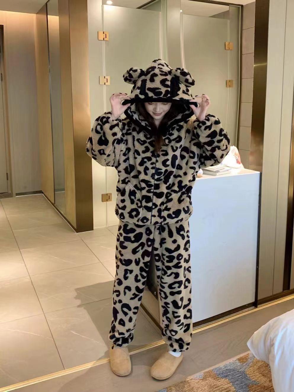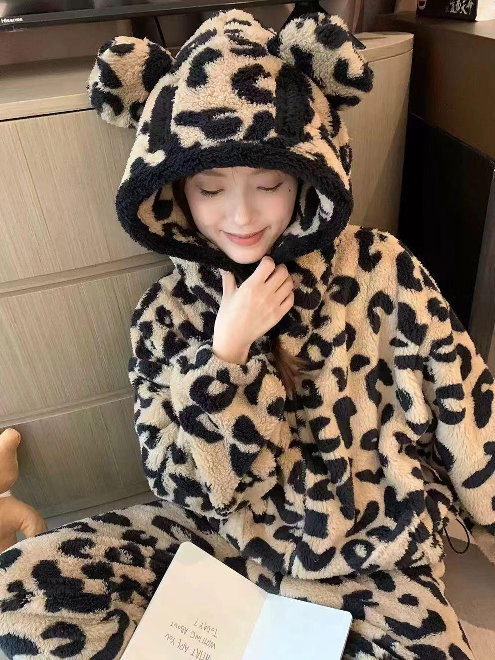 Pijama con capucha de forro polar coral con estampado de leopardo estilo coreano para mujer, invierno, nuevo, plus terciopelo, plus grueso, cálido, conjunto de ropa para el hogar de invierno