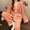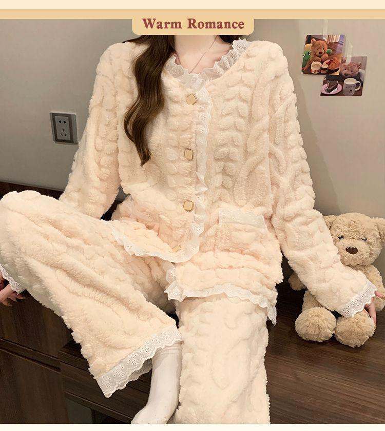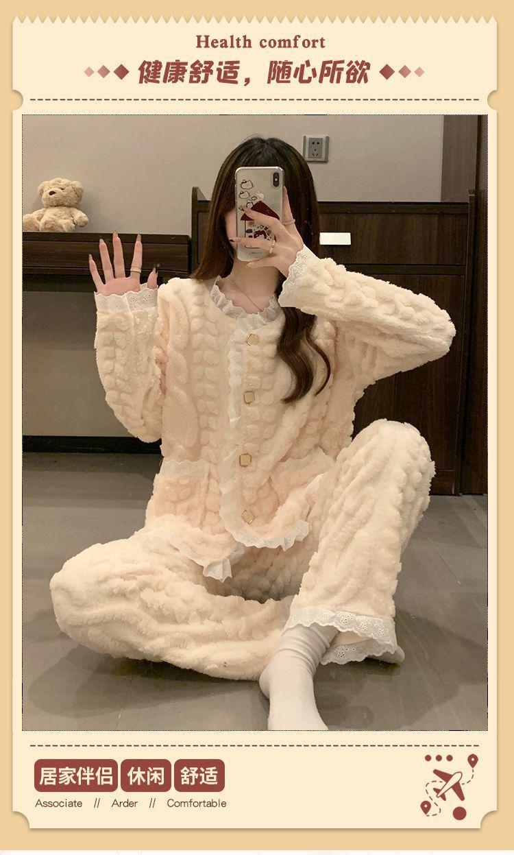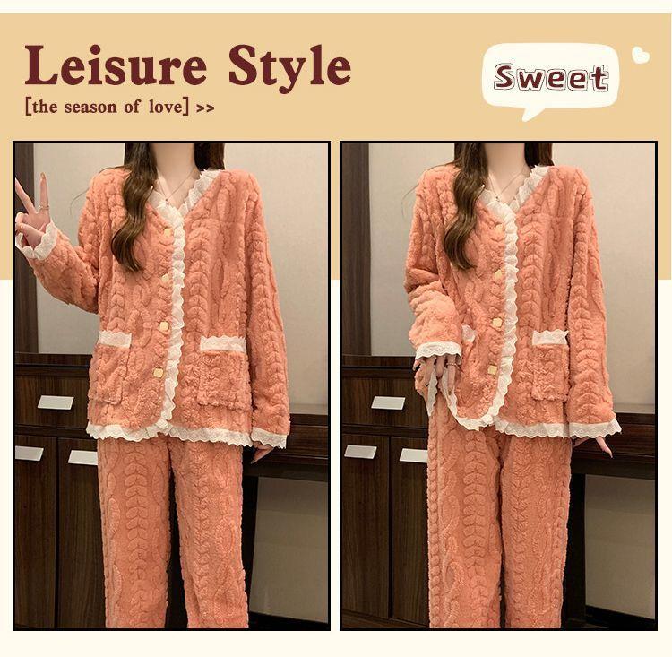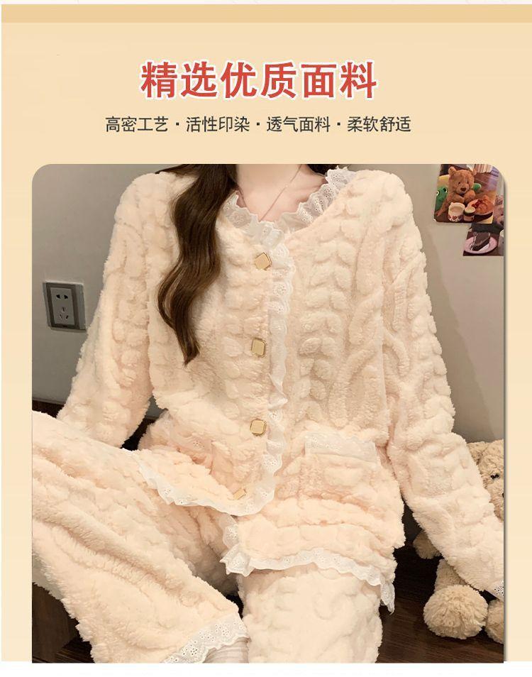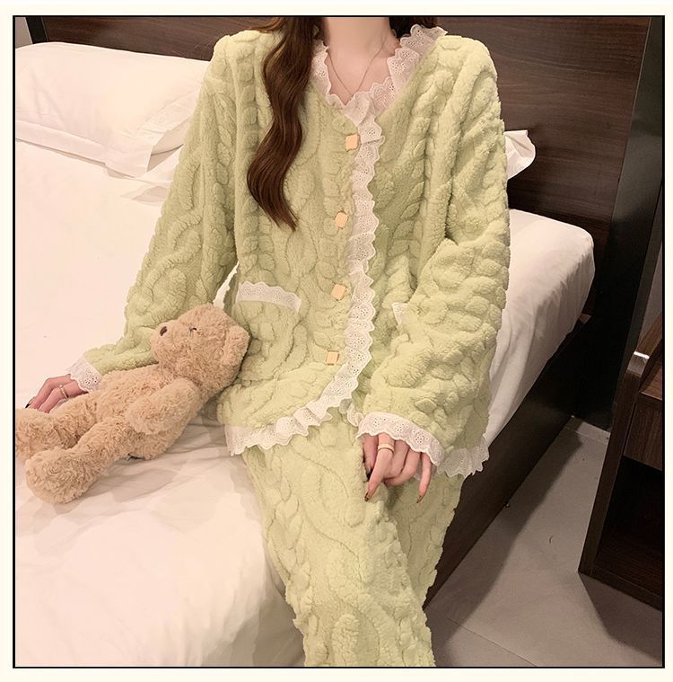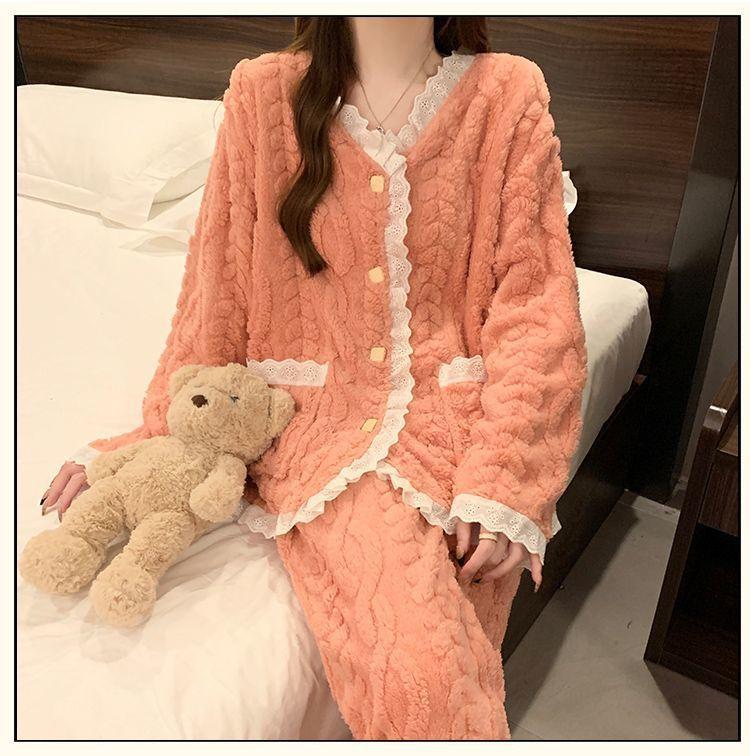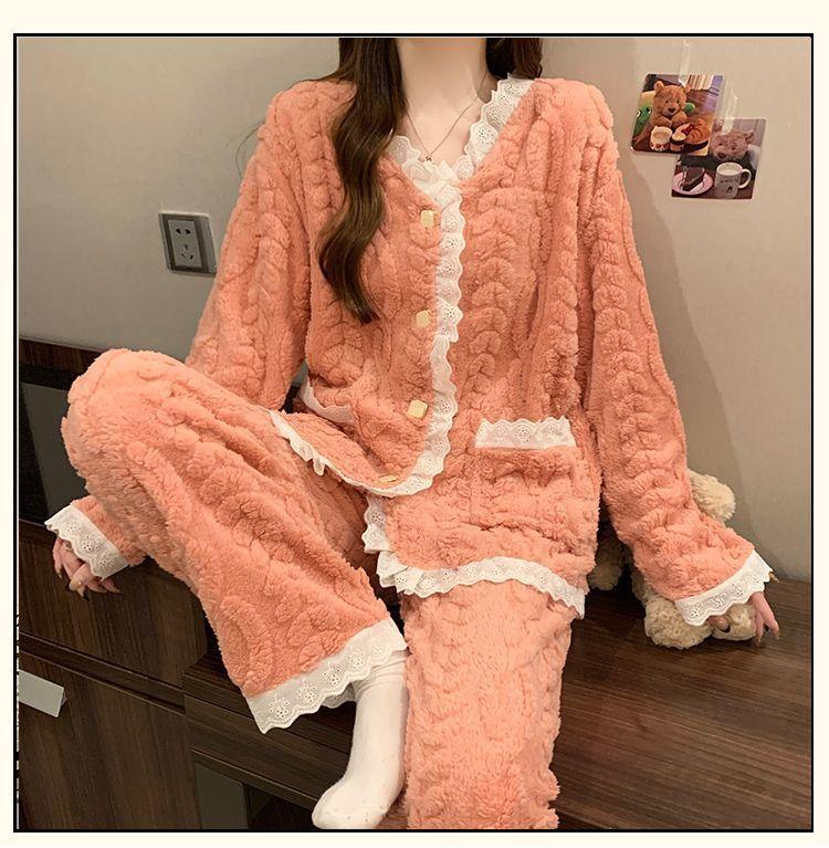 Cárdigan grueso de forro polar de coral para otoño e invierno, estilo princesa, jacquard de franela, pijama dulce para niña, conjunto de ropa para el hogar para mujer