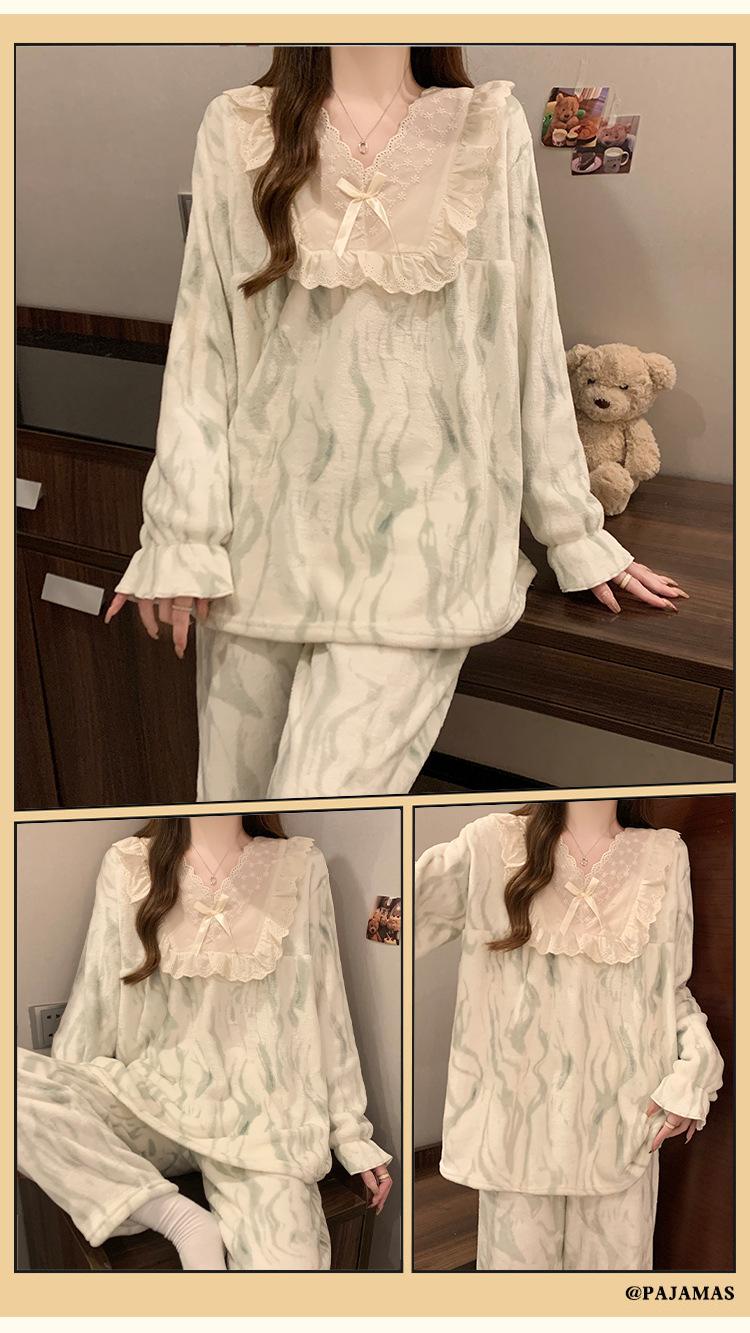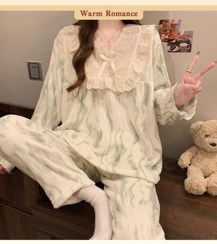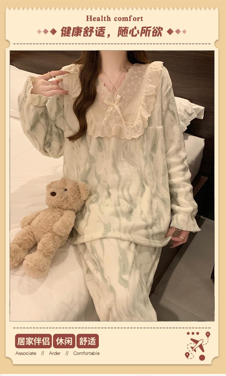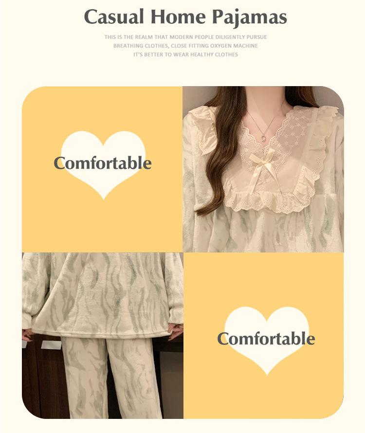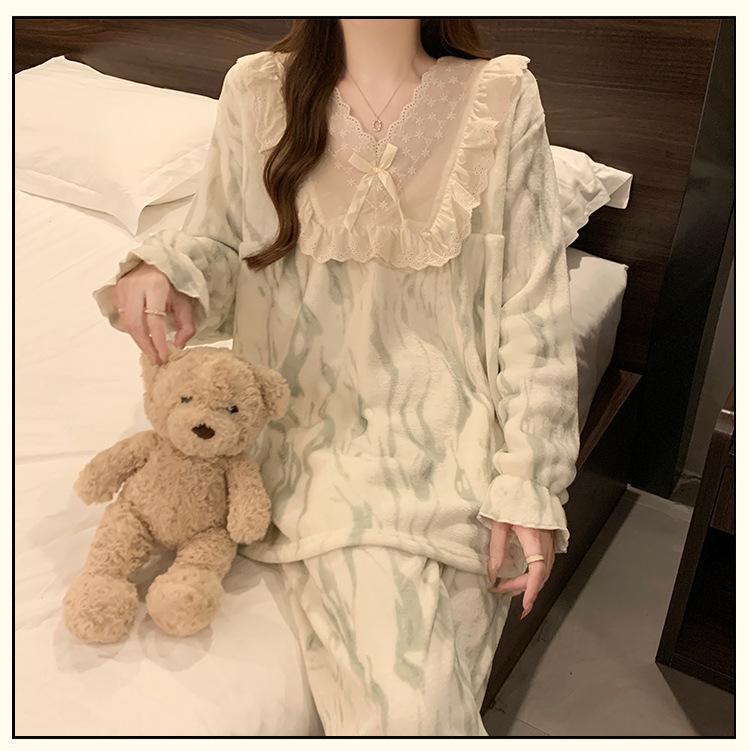 Invierno Nuevo Pijama de Franela Mujer Estilo Coreano Viento de Princesa Damas Encaje Cuello en V Jersey Dulce Ropa de Casa