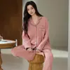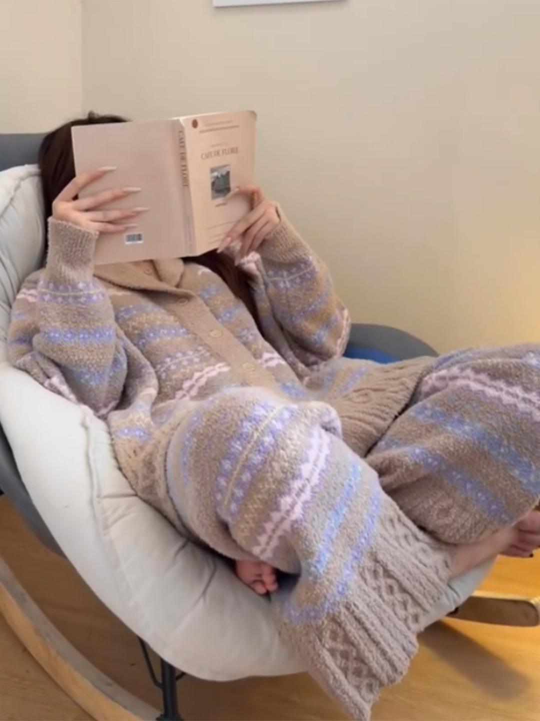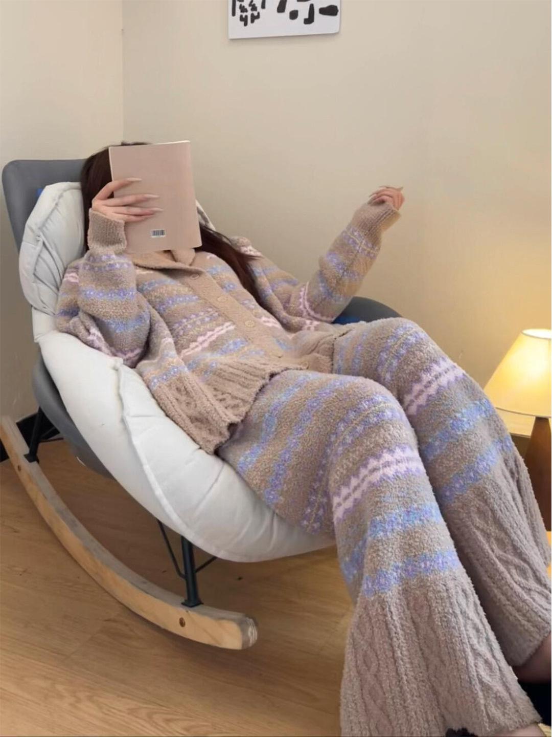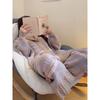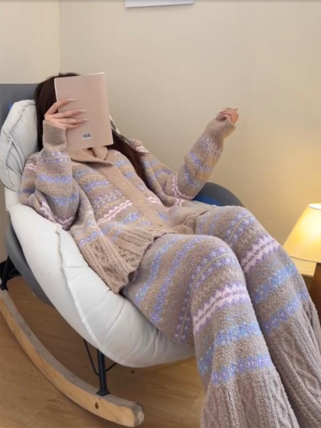 Estilo Perezoso Diseño de Rayas Retro Nicho Pijama para Mujer Otoño e Invierno Talla Grande Terciopelo de Media Cara Manga Larga Pantalón Largo Ropa de Casa