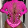 Body de Manga Larga Rojo Rosa Hotfix Pedrería Lencería Tentación Sexy Jacquard Plus Pedrería Bodycon Bikini Malla Lencería tz684