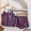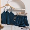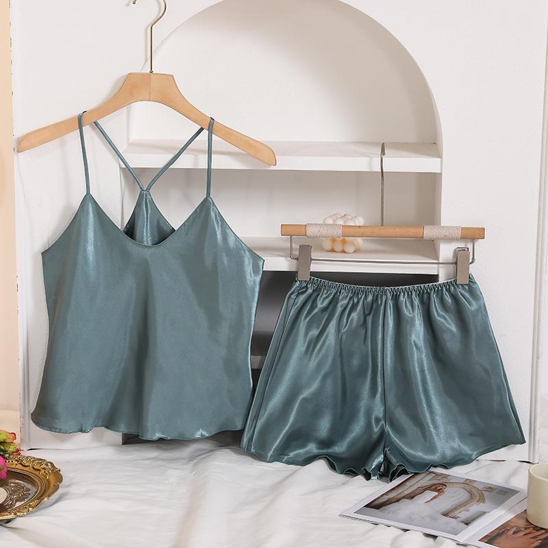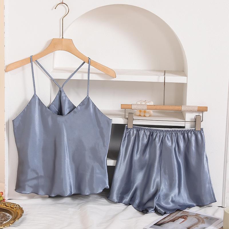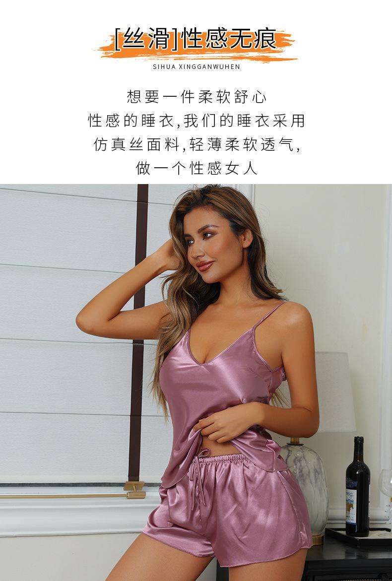Pijama de seda sintética estilo europeo y americano transfronterizo para mujer, casual para el hogar, camisola, camisón, cuello en V, sexy, shorts, conjunto de ropa para el hogar
