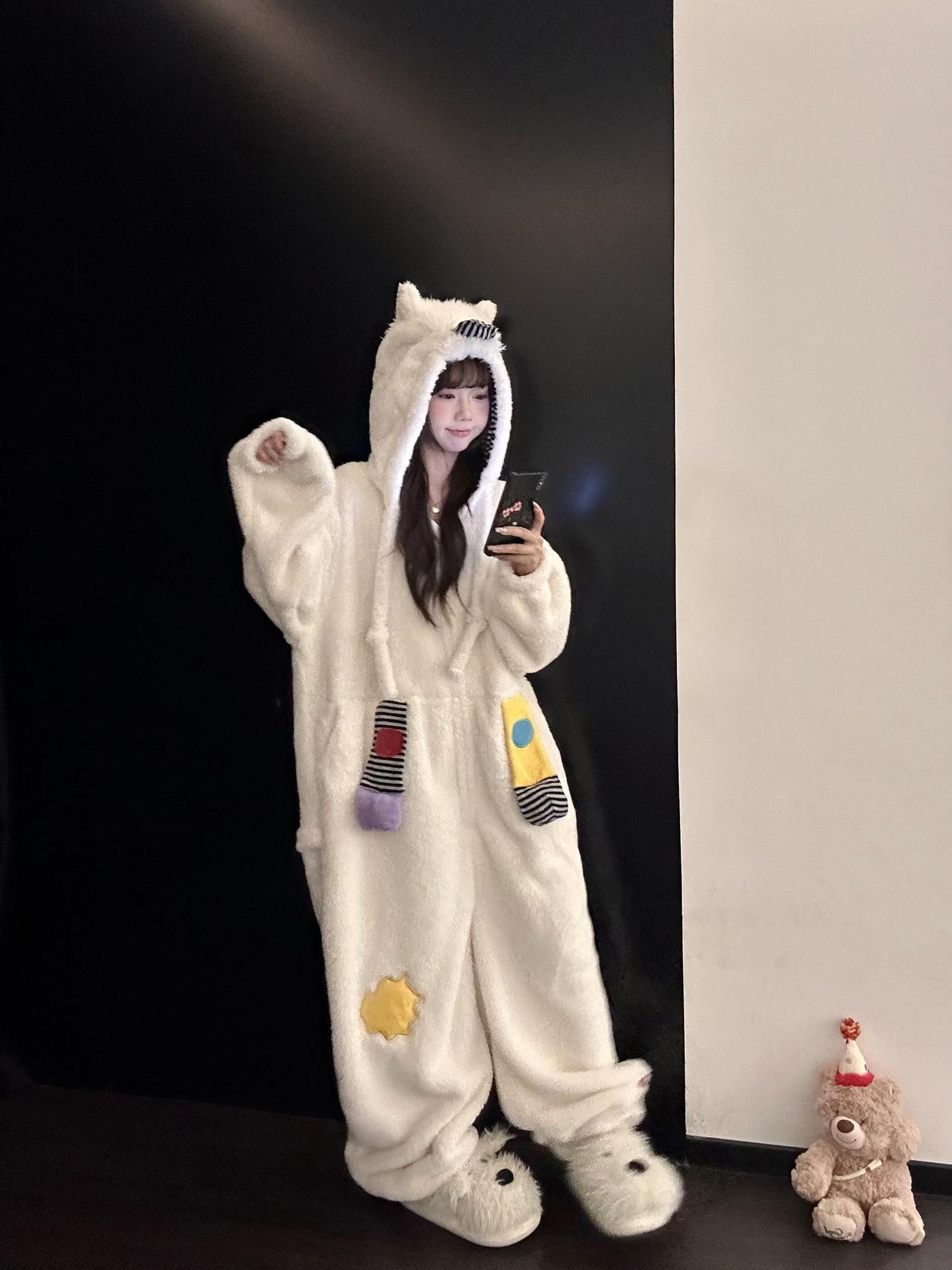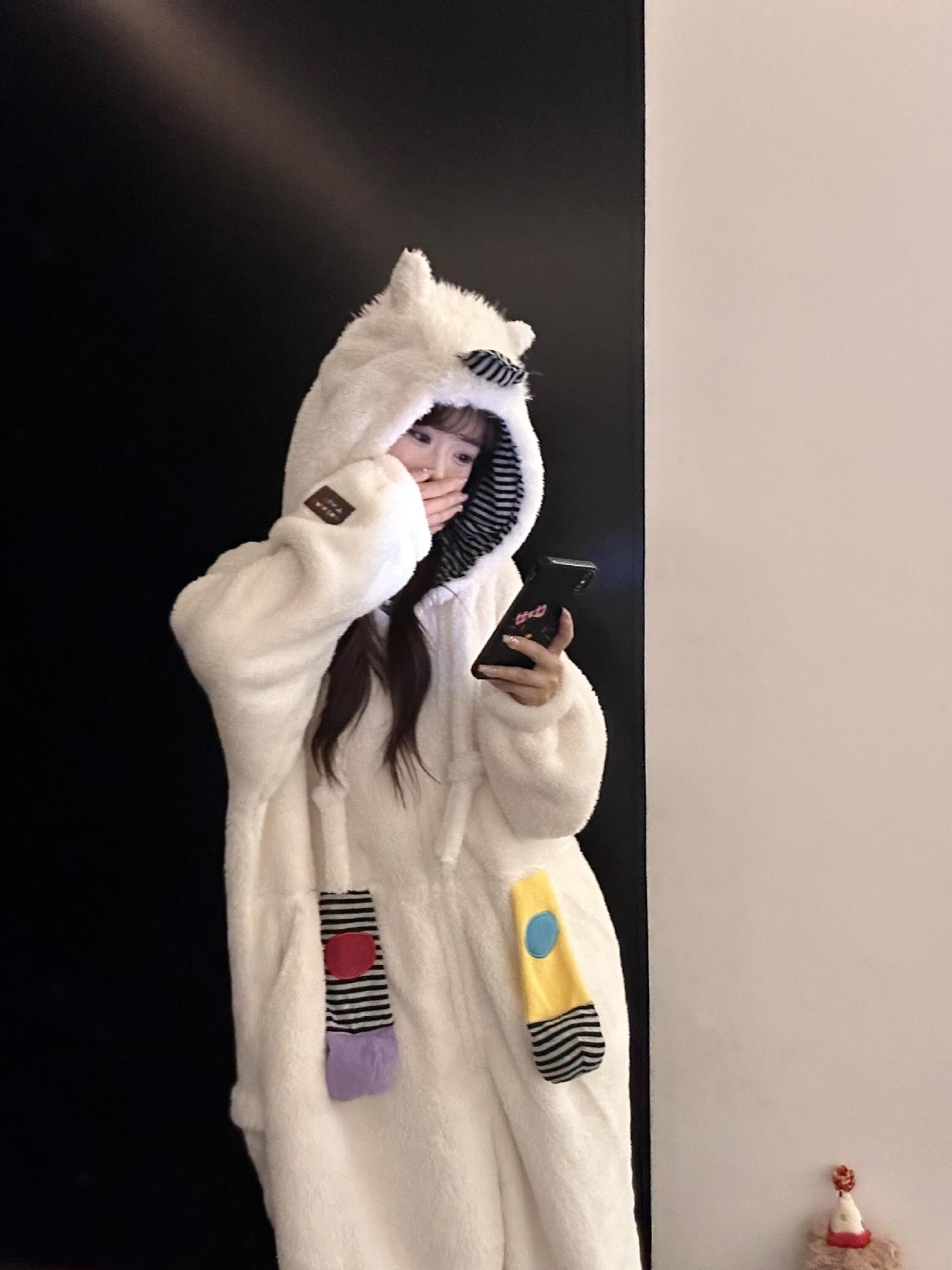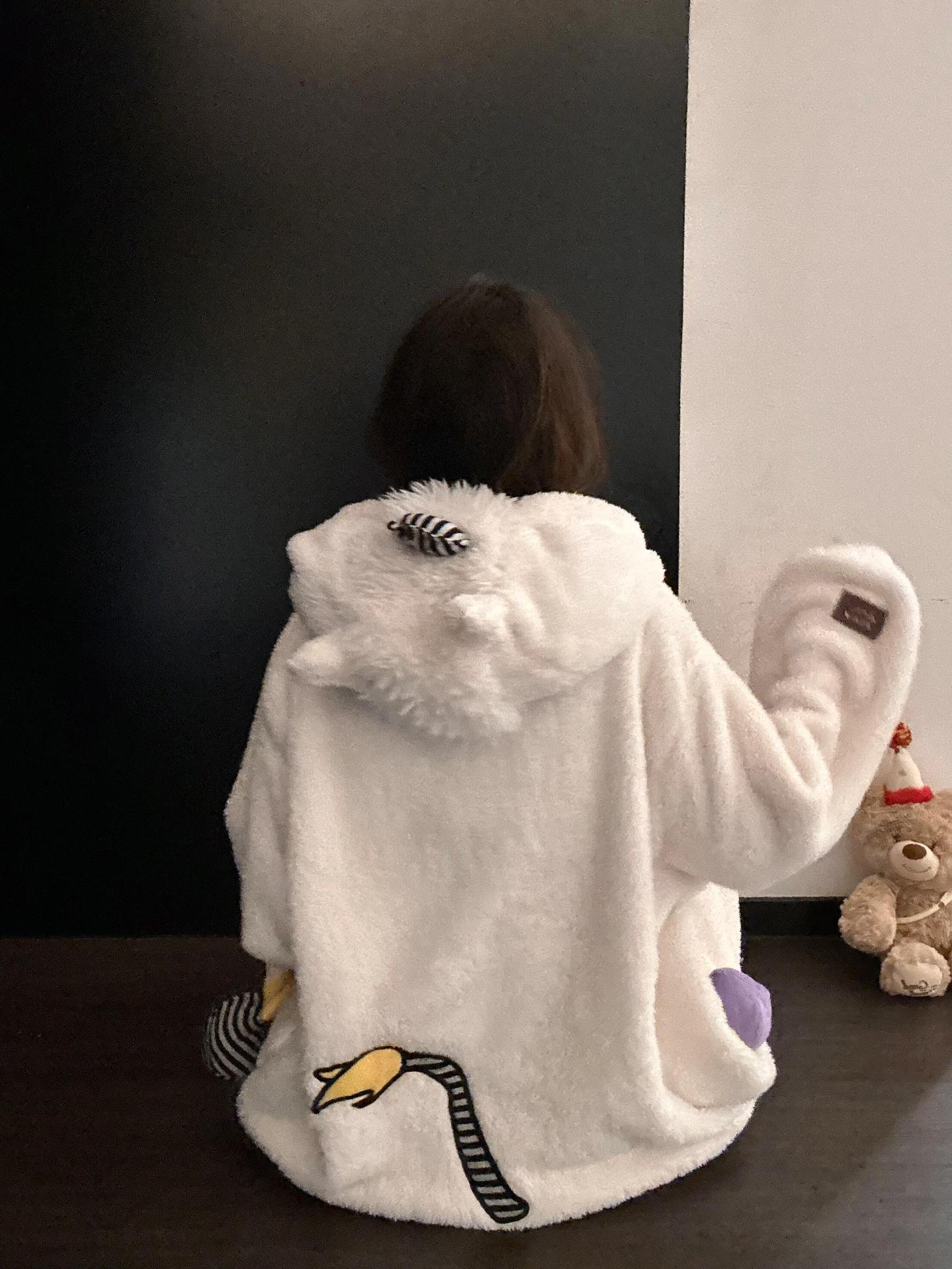 Pijama de Felpa con Capucha de Pony Lindo para Niña Otoño e Invierno Nuevo Forro Polar Coral Ropa de Casa Mono de Una Pieza