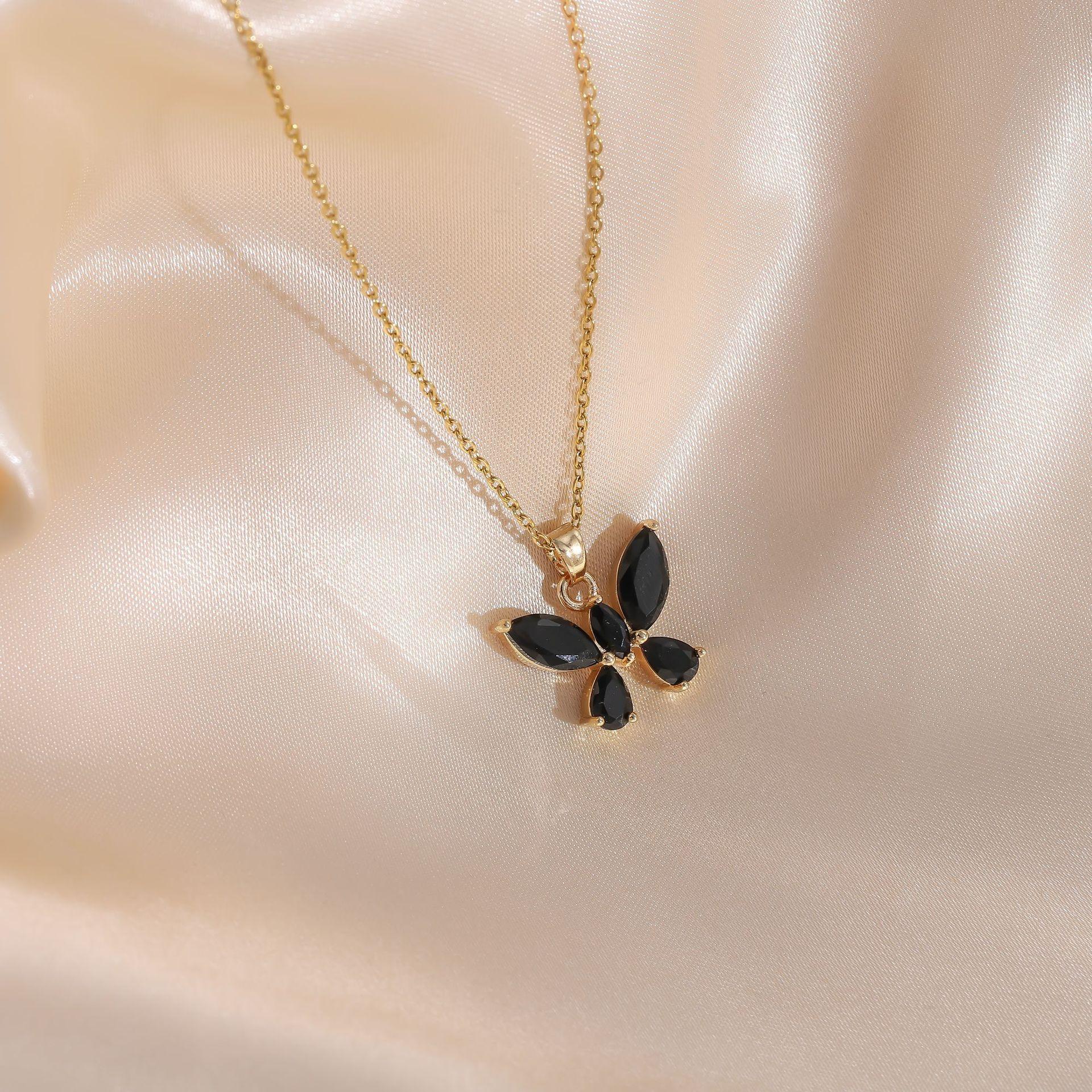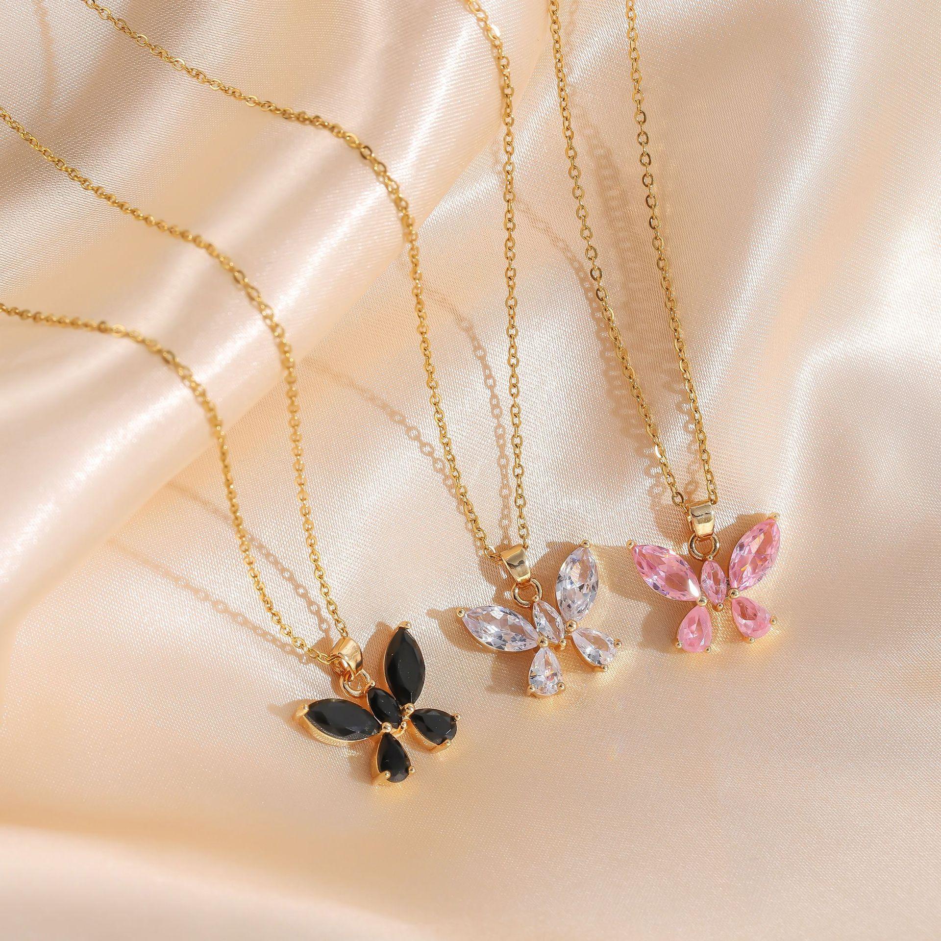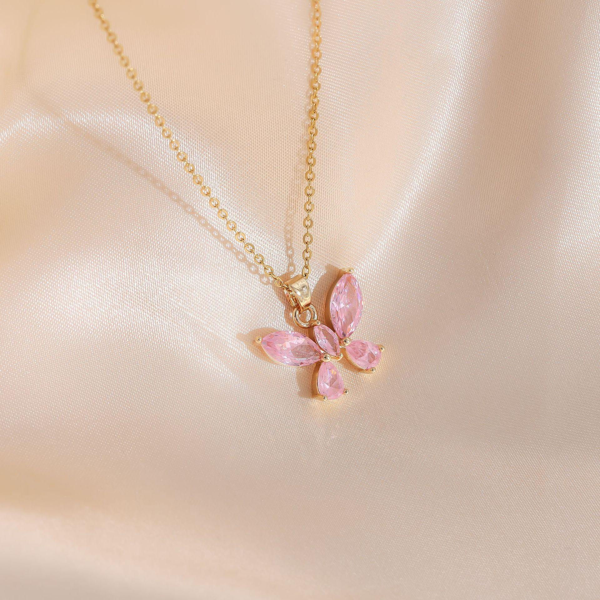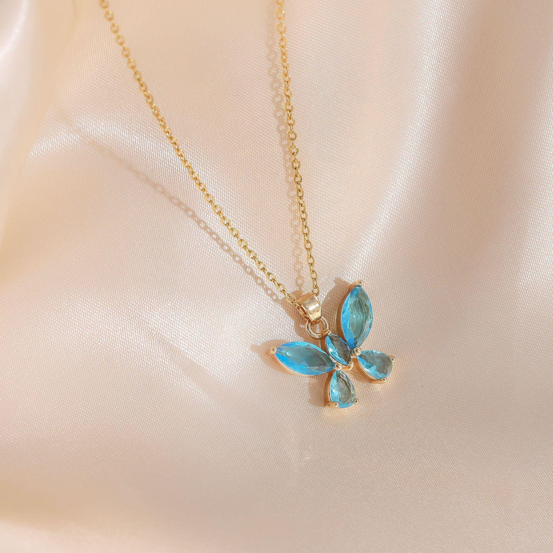 Joyería transfronteriza europea y americana estilo dulce lujo ligero color cristal colgante de mariposa collar de acero de titanio femenino con incrustaciones de circonita cadena para clavícula