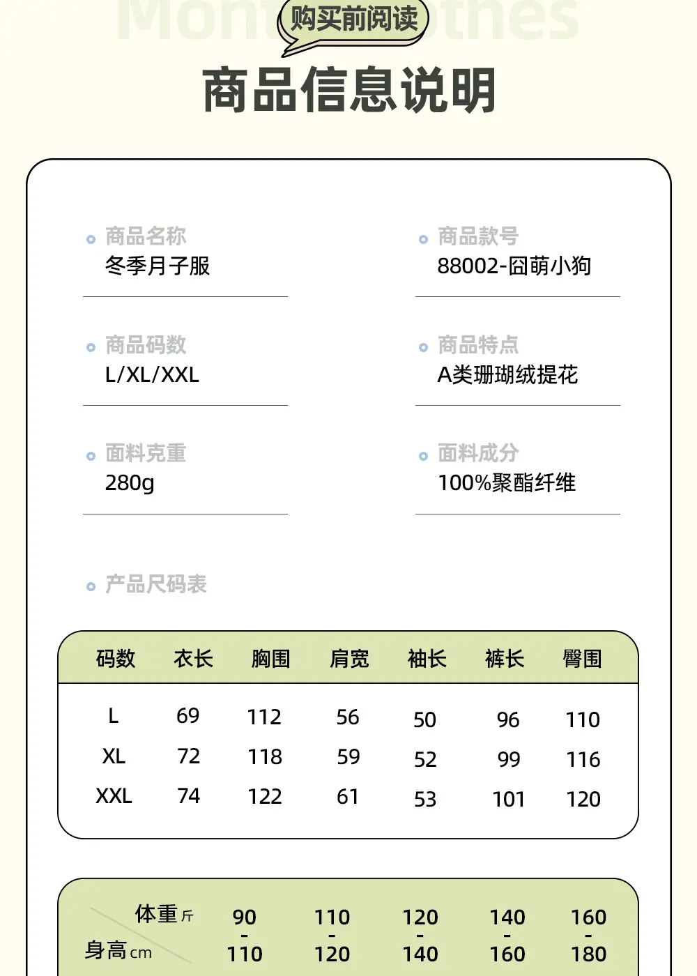 L size (110-140 pounds), XL (130-160 catties), XXL (150-180 catties)