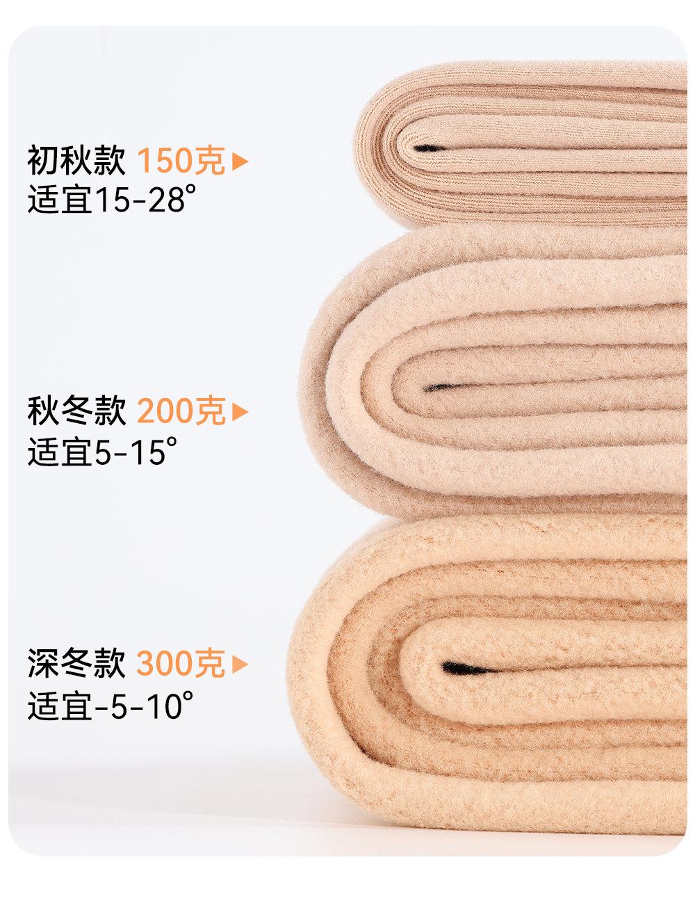 80 grams Spring/Autumn style 20-30℃, 150g thin fleece style 10-20℃, 200g fleece-lined style 5-15℃, 300g Thick Fleece -5-5℃