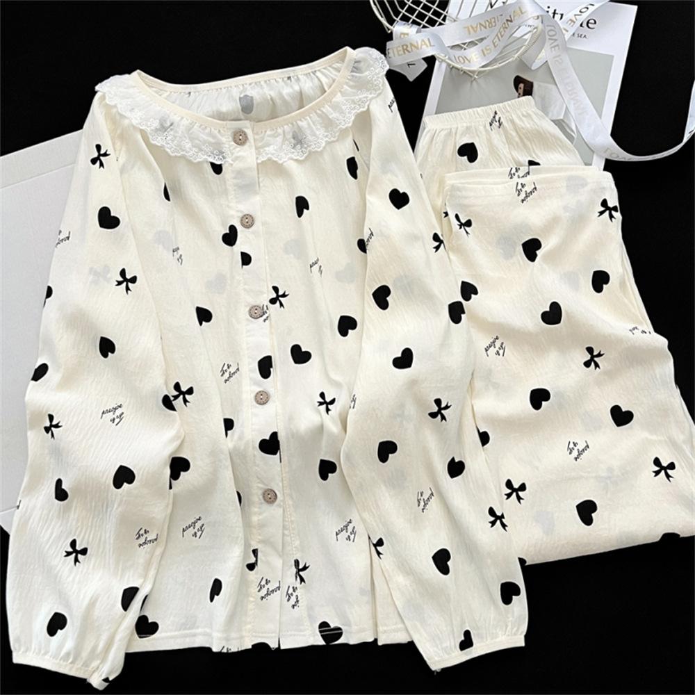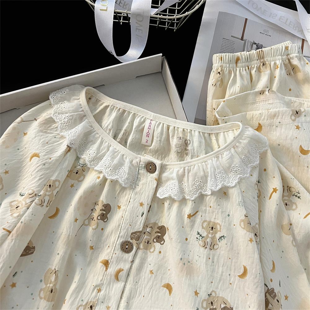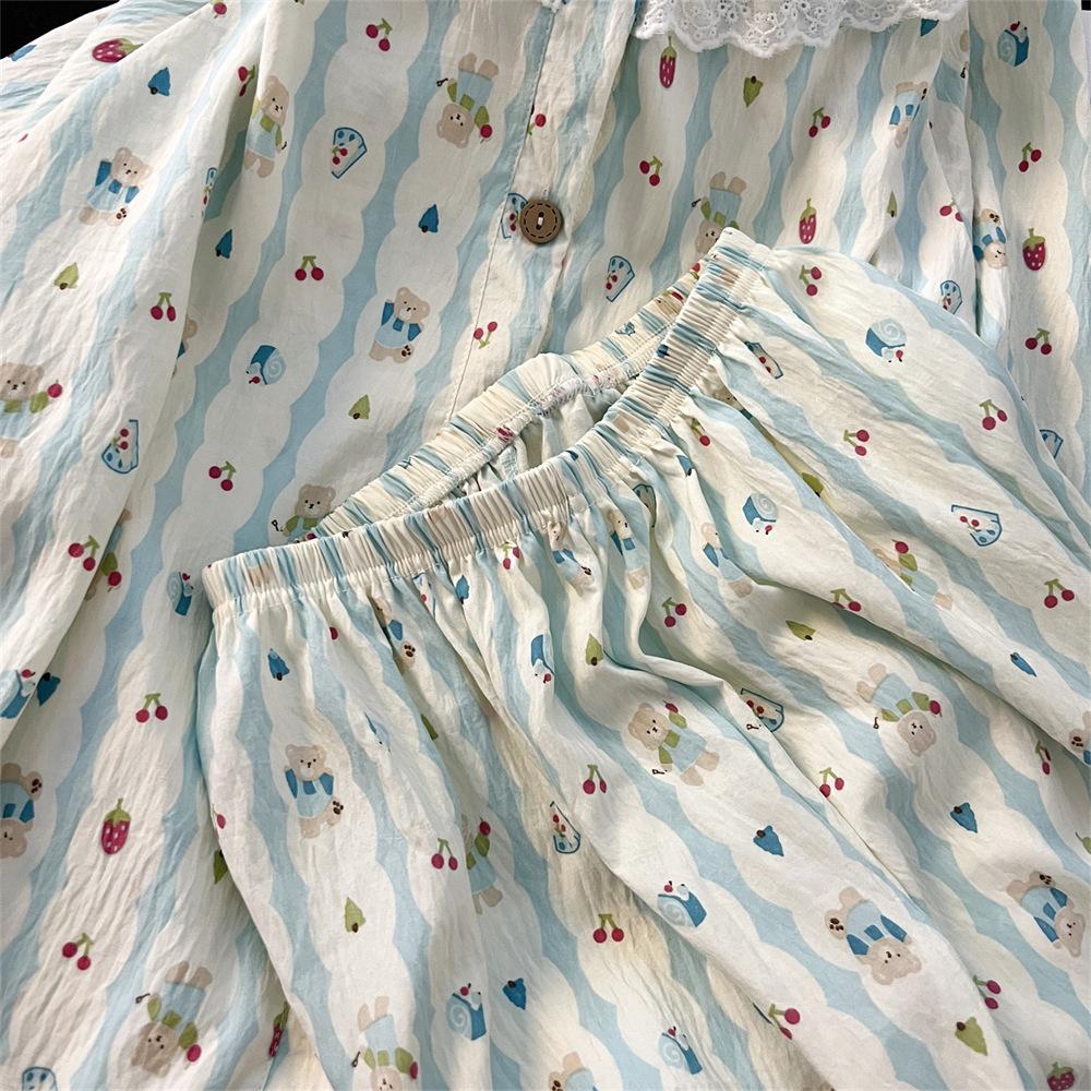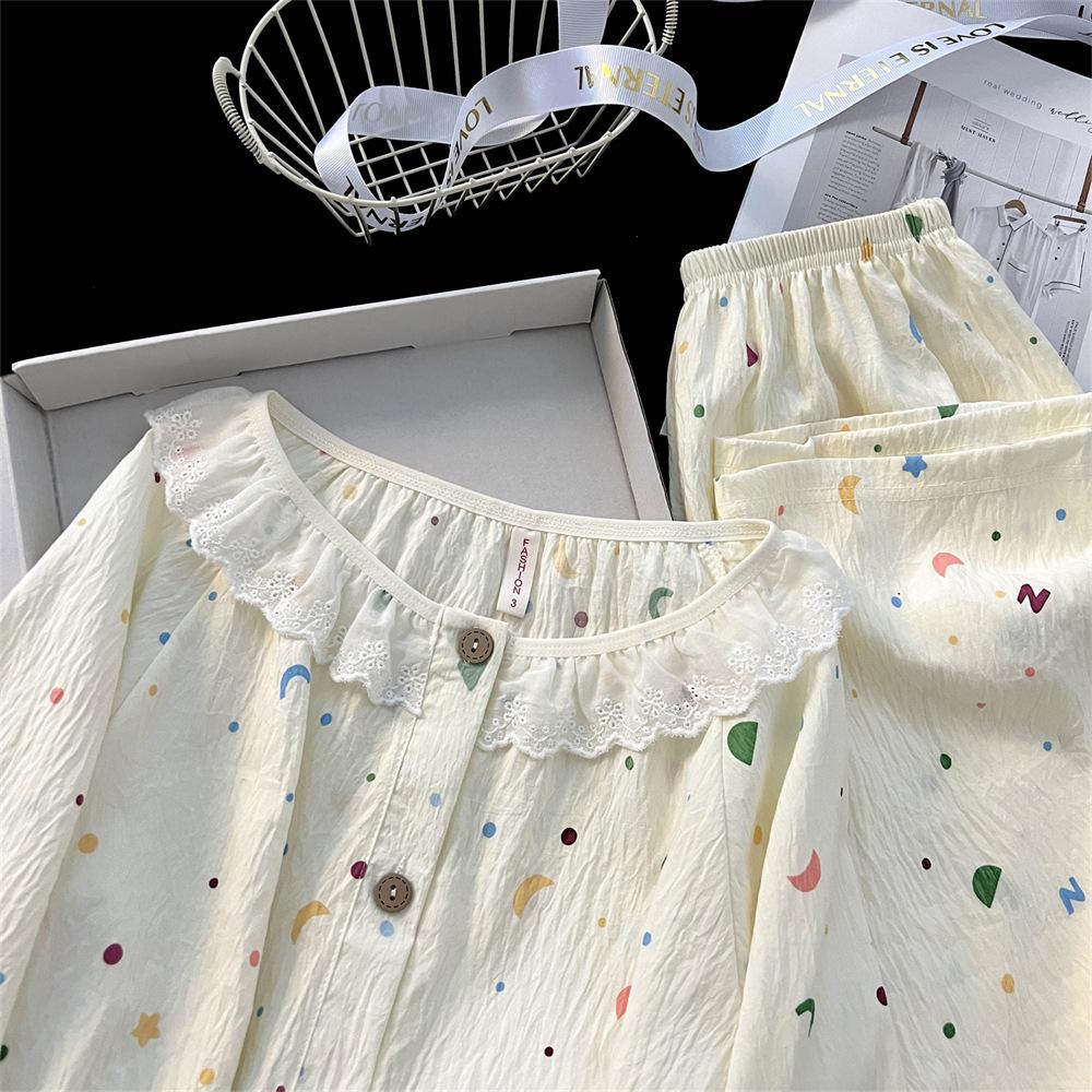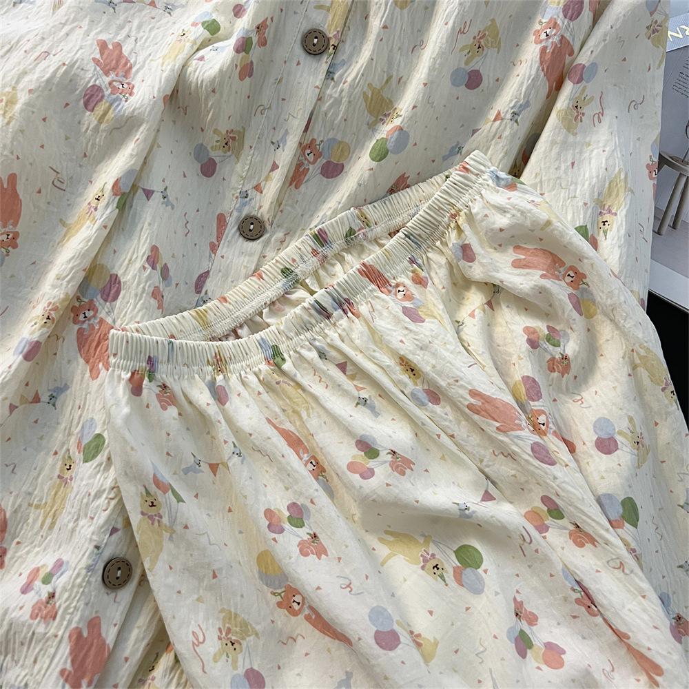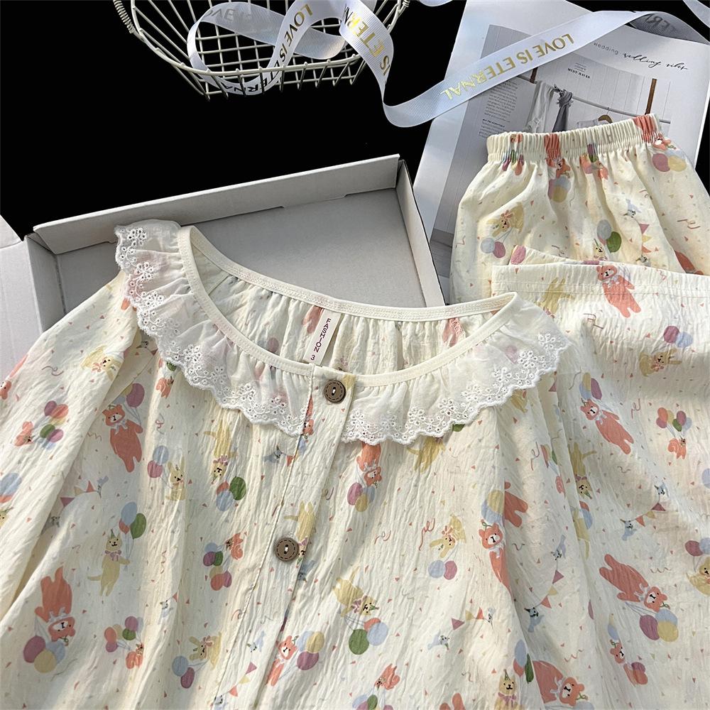 Pijama Delgado de Primavera y Otoño para Mujer Algodón Nube Flores Tridimensionales Manga Larga Pantalón Largo Dulce Niña Conjunto Ropa de Casa