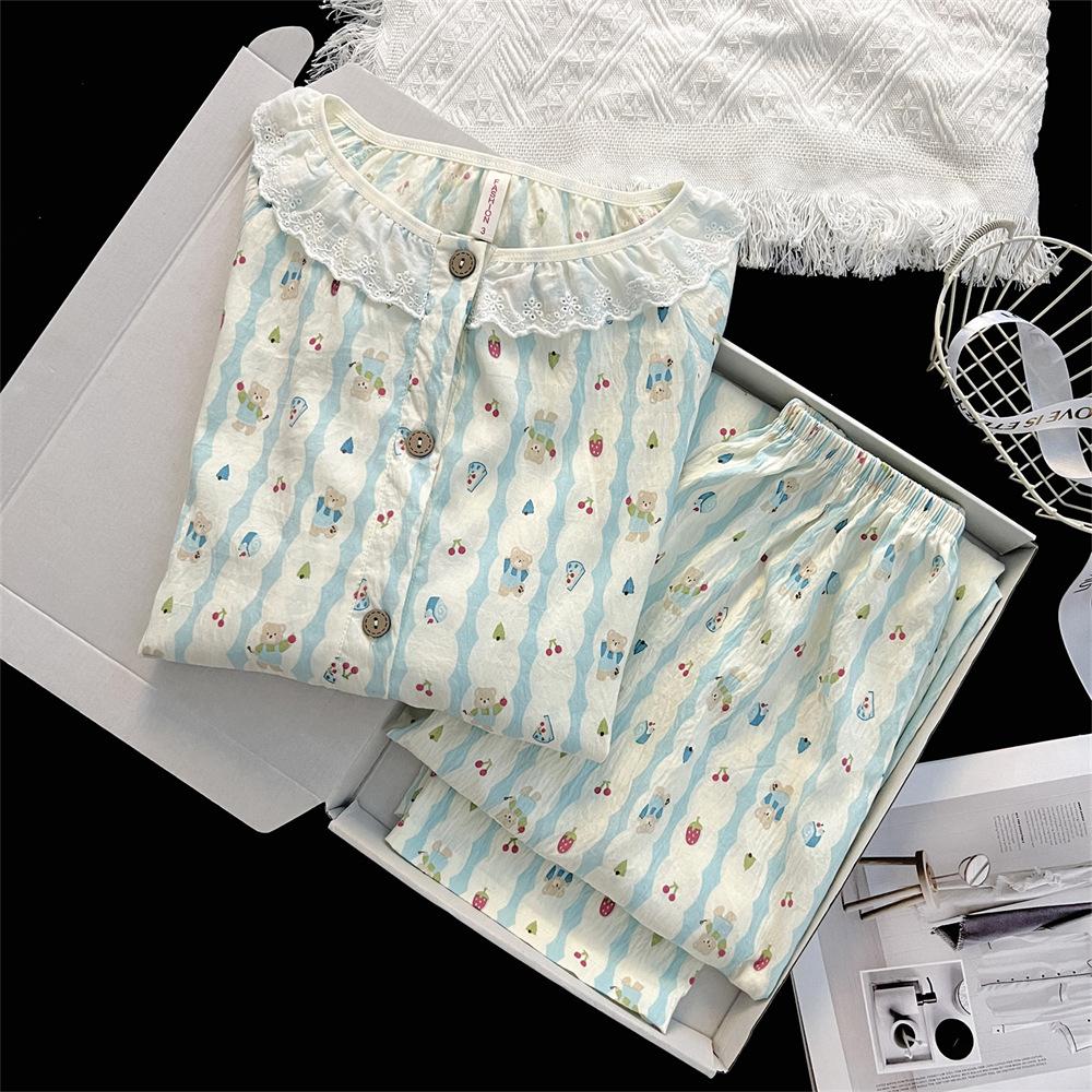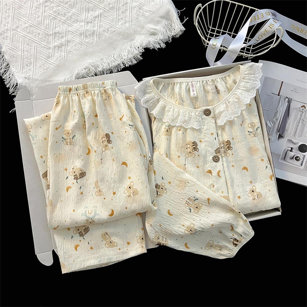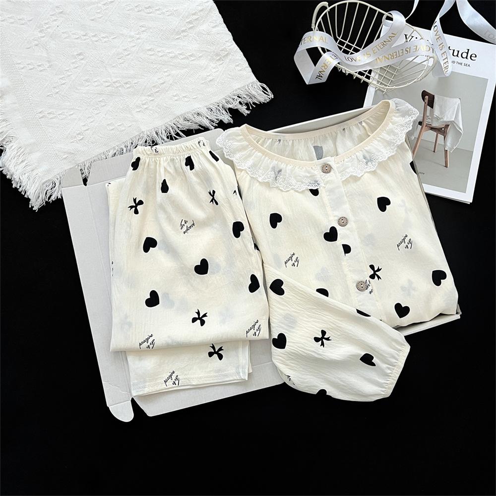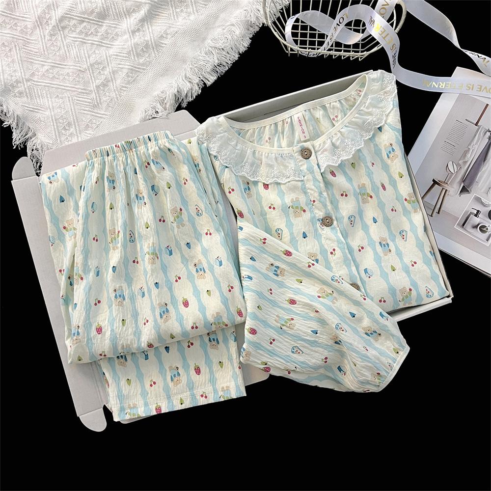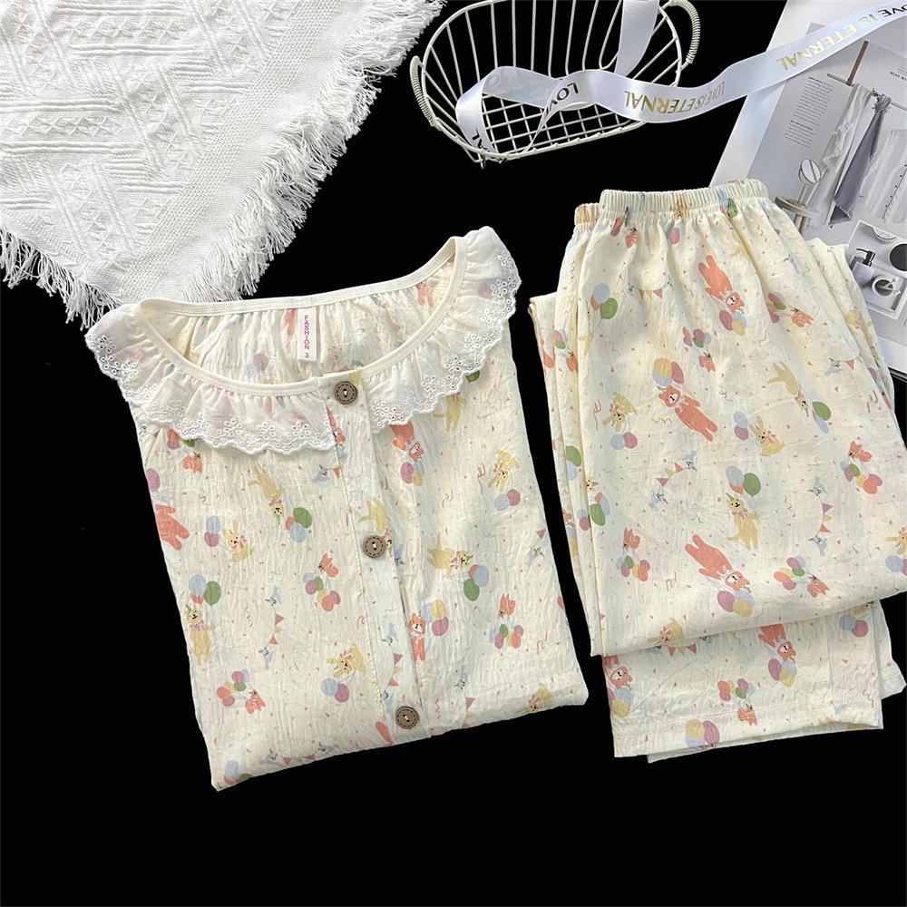 Pijama Delgado de Primavera y Otoño para Mujer Algodón Nube Flores Tridimensionales Manga Larga Pantalón Largo Dulce Niña Conjunto Ropa de Casa