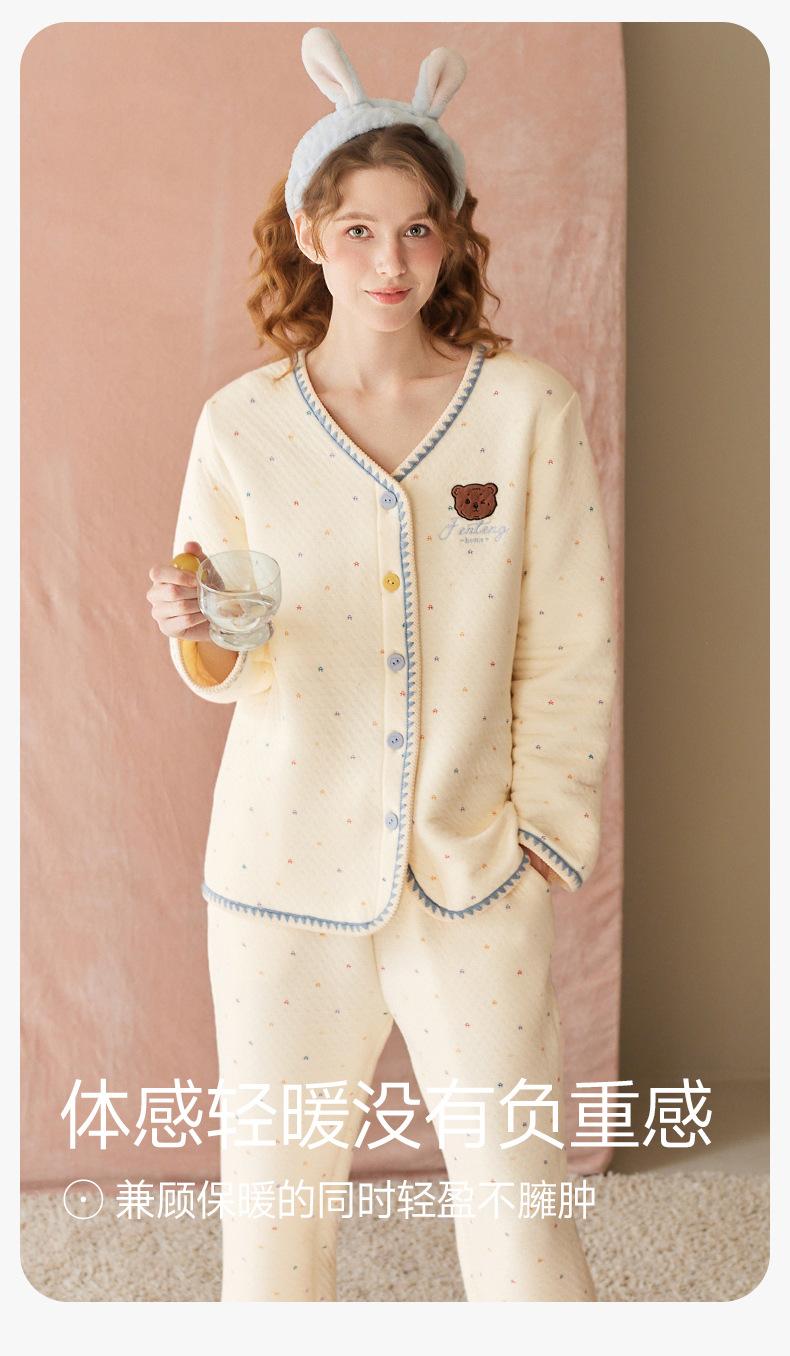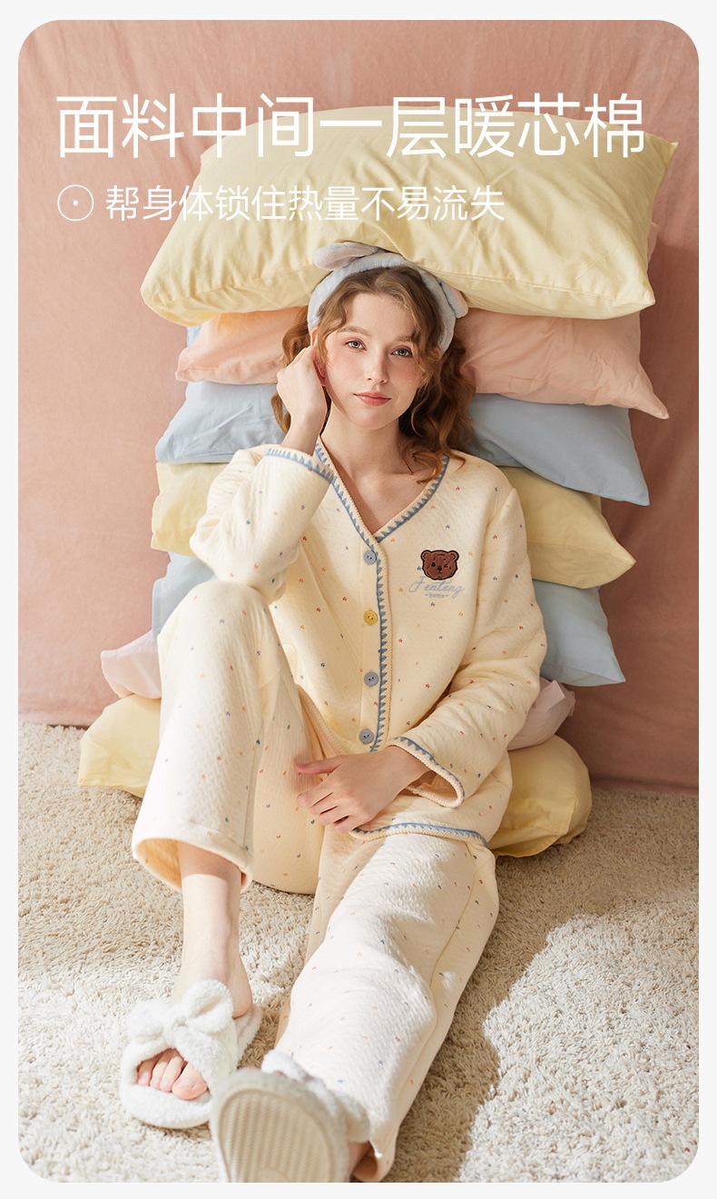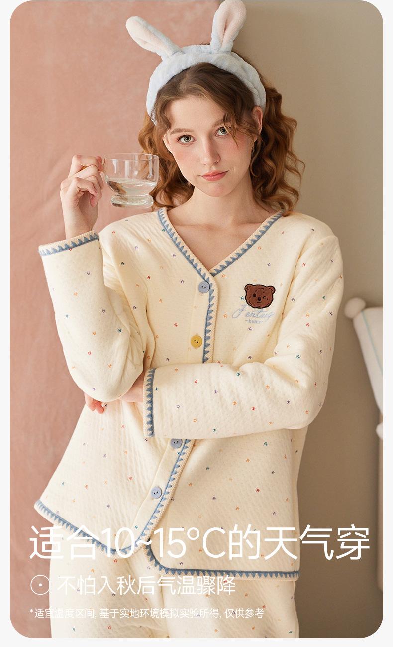 Fenteng [Algodón Cálido de Núcleo de Aire] Pijama de Mujer Otoño/Invierno Manga Larga Algodón Puro Conjunto Casual Talla Grande Ropa de Casa