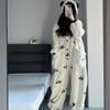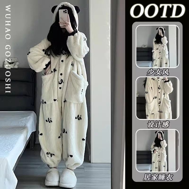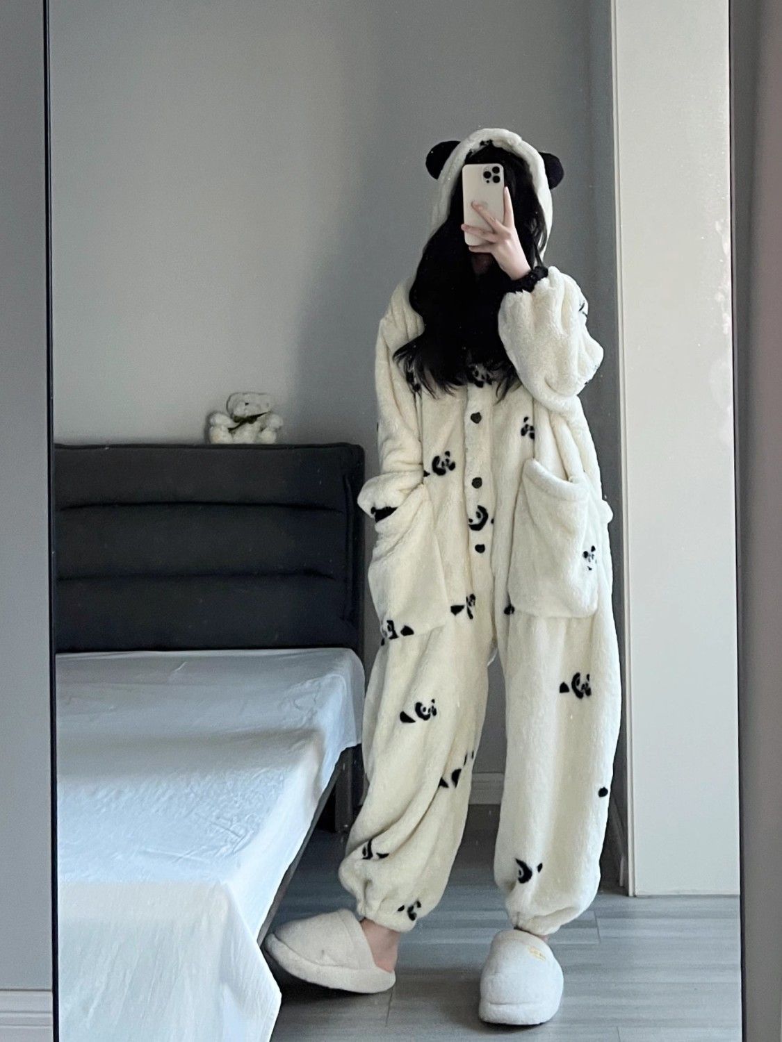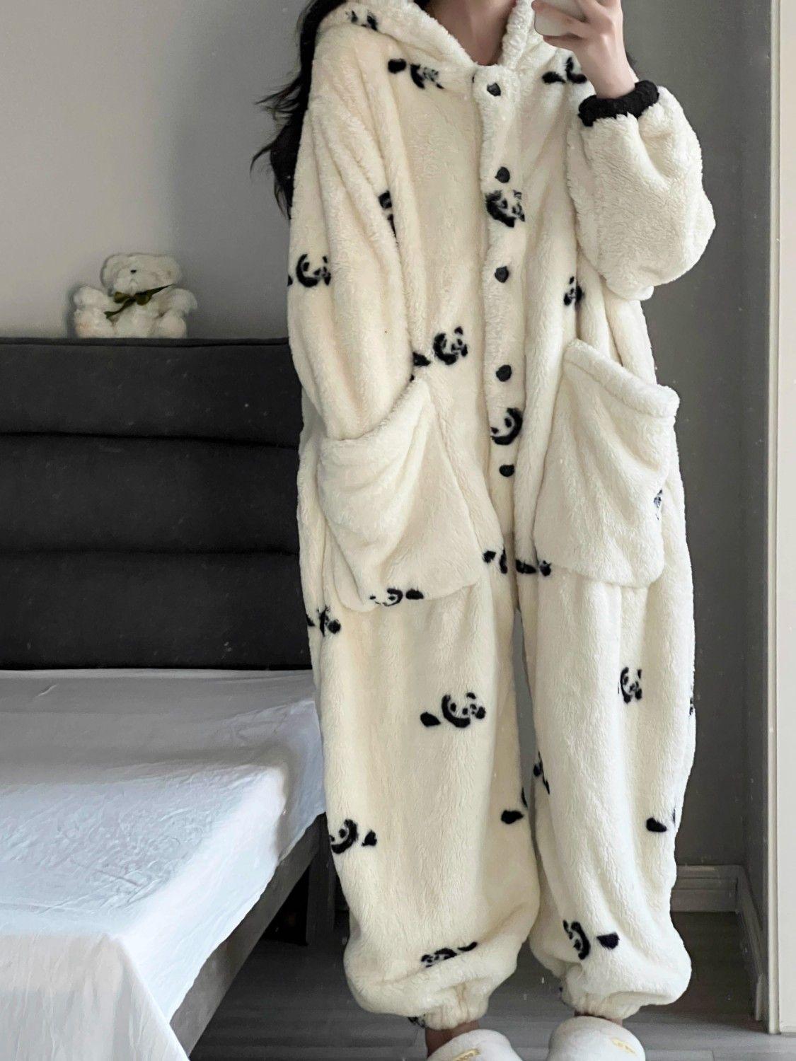 Pijama Premium de Una Pieza Estilo Coreano con Estampado de Panda con Capucha de Vellón Coral para Mujer Invierno Vellón Grueso Talla Extra Bata para Casa