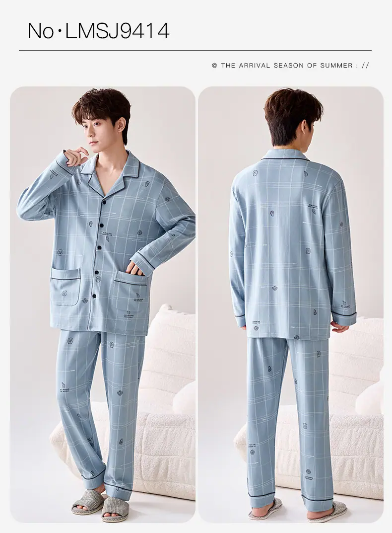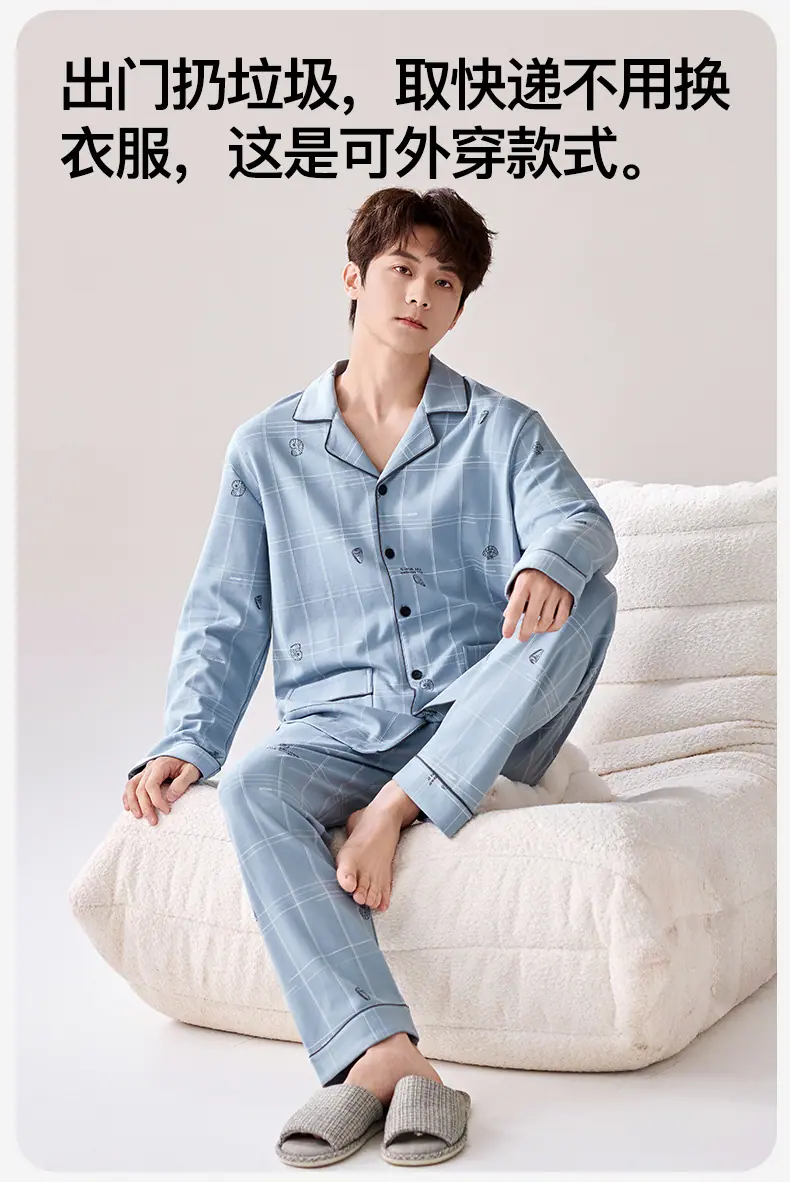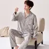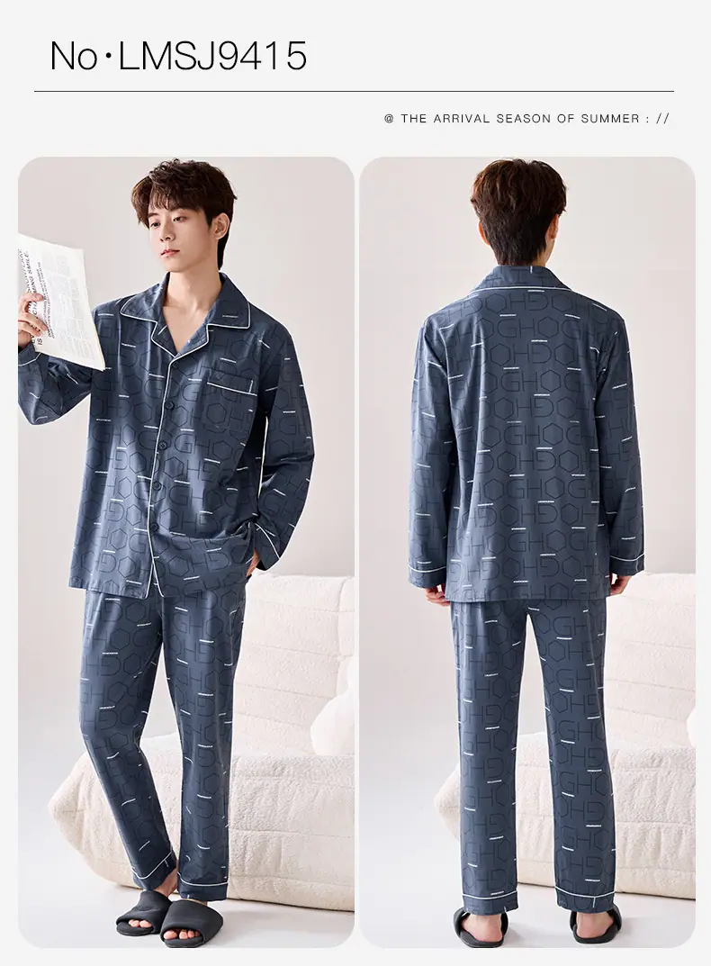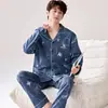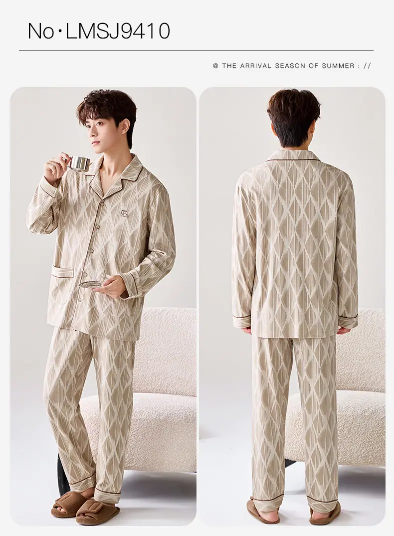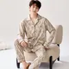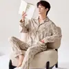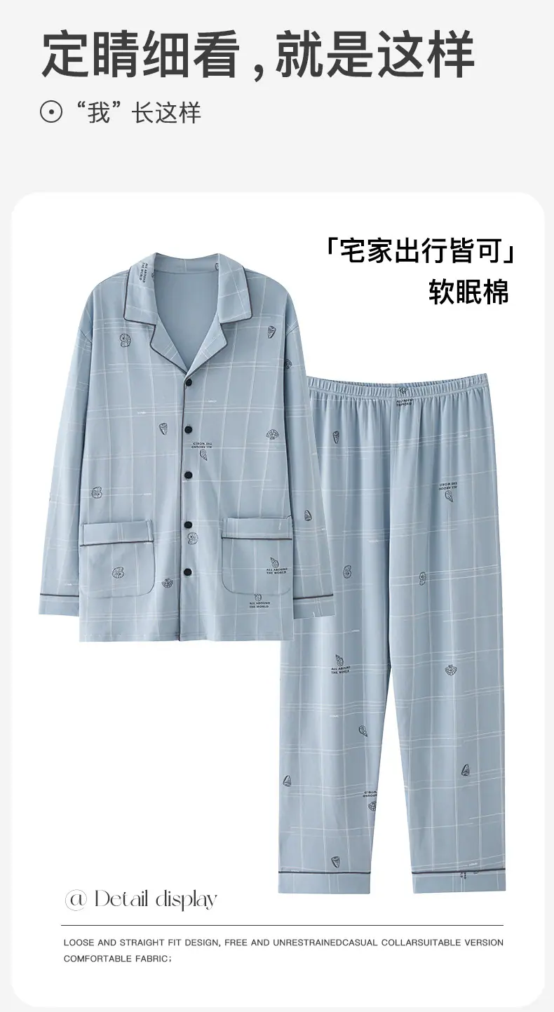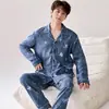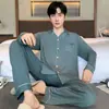 Pijama de Hombre de Primavera y Otoño de Alta Gama de Manga Larga y Pantalón Largo, Cárdigan de Lycra de Algodón Puro, Conjunto Casual Cómodo para Estar en Casa