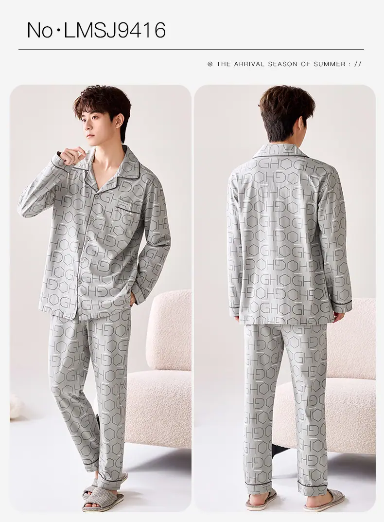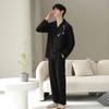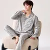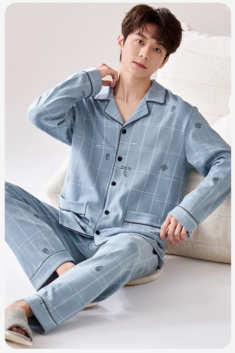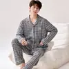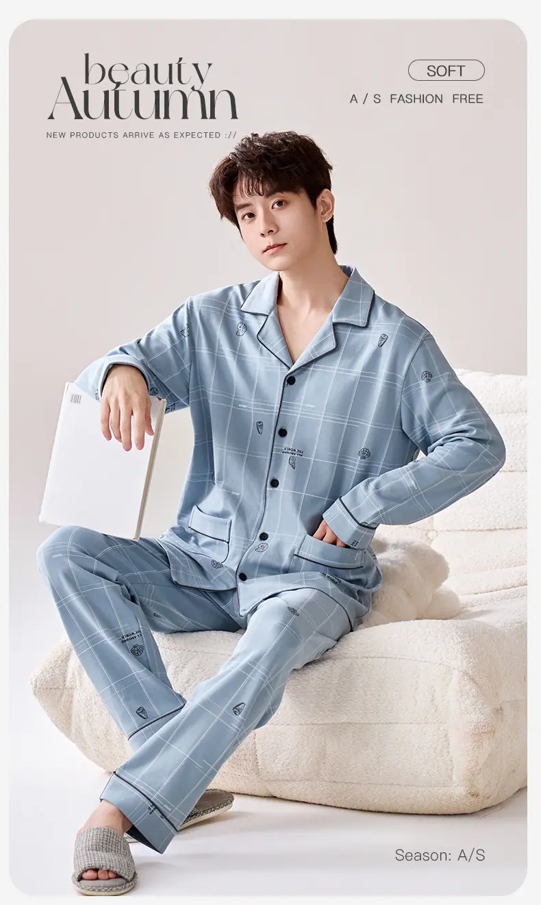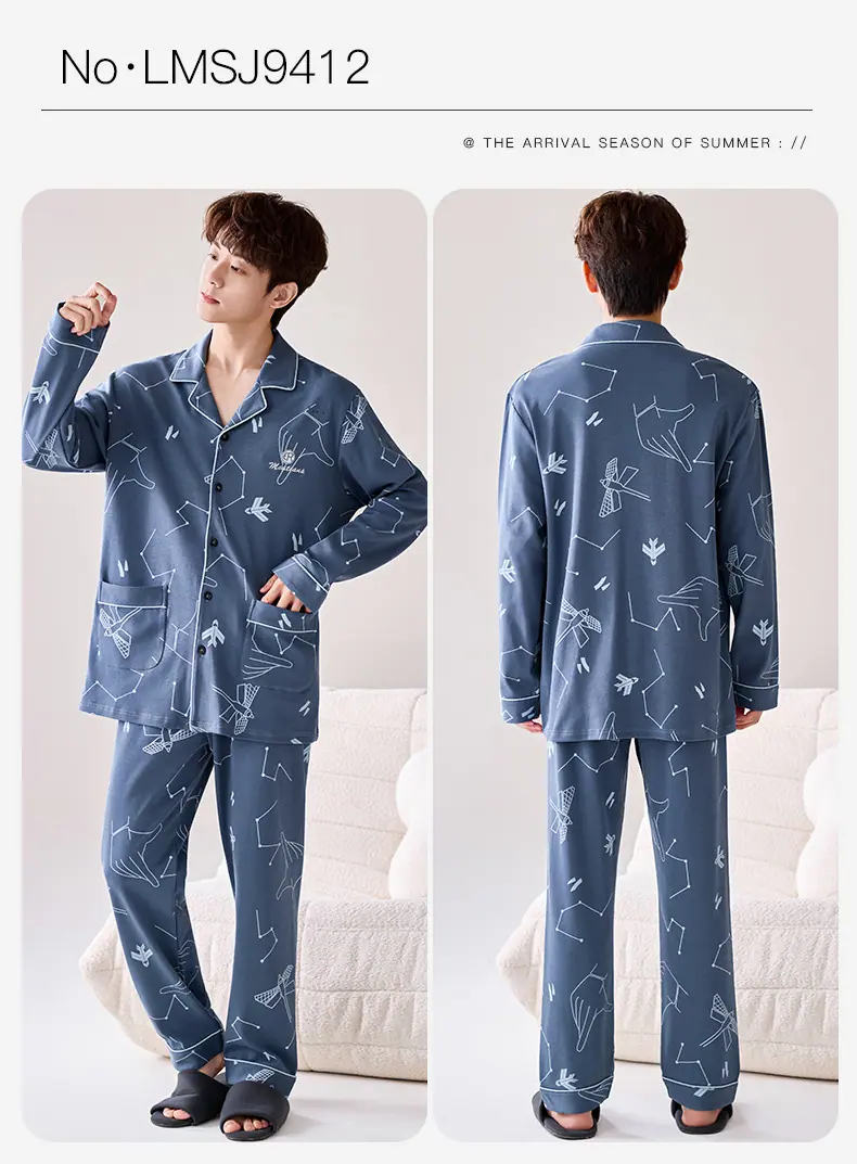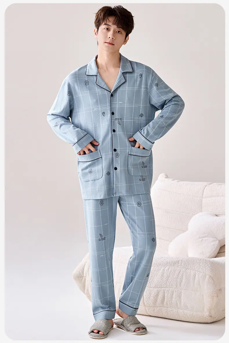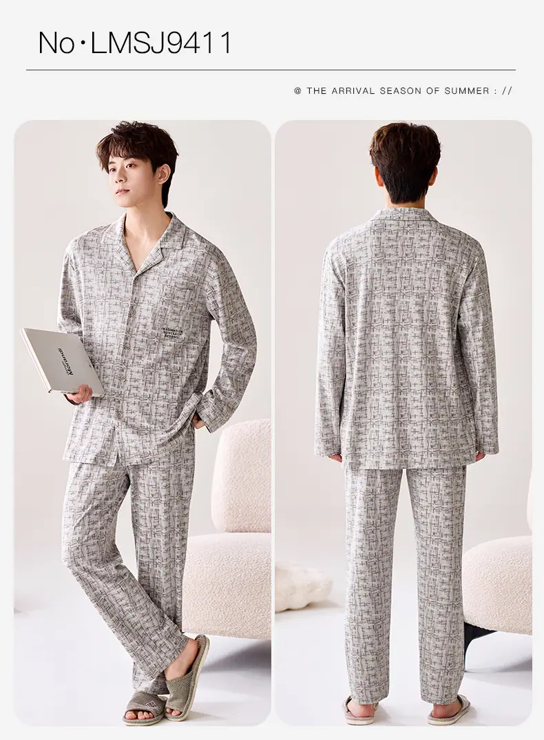 Pijama de Hombre de Primavera y Otoño de Alta Gama de Manga Larga y Pantalón Largo, Cárdigan de Lycra de Algodón Puro, Conjunto Casual Cómodo para Estar en Casa