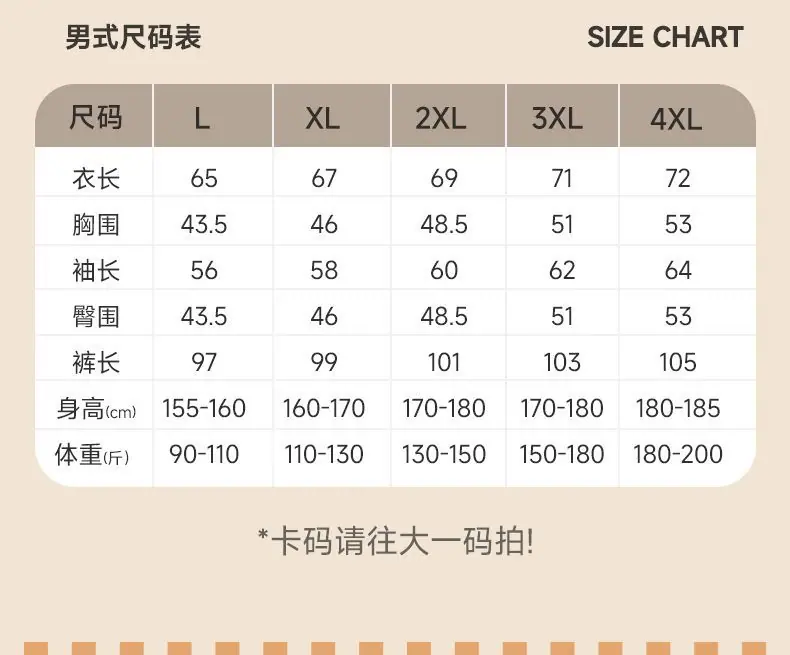 L Men (recommended 90-110 lbs), XL Men (recommended 110-120 lbs), 2XL Men (recommended 120-140 catties), 3XL M...