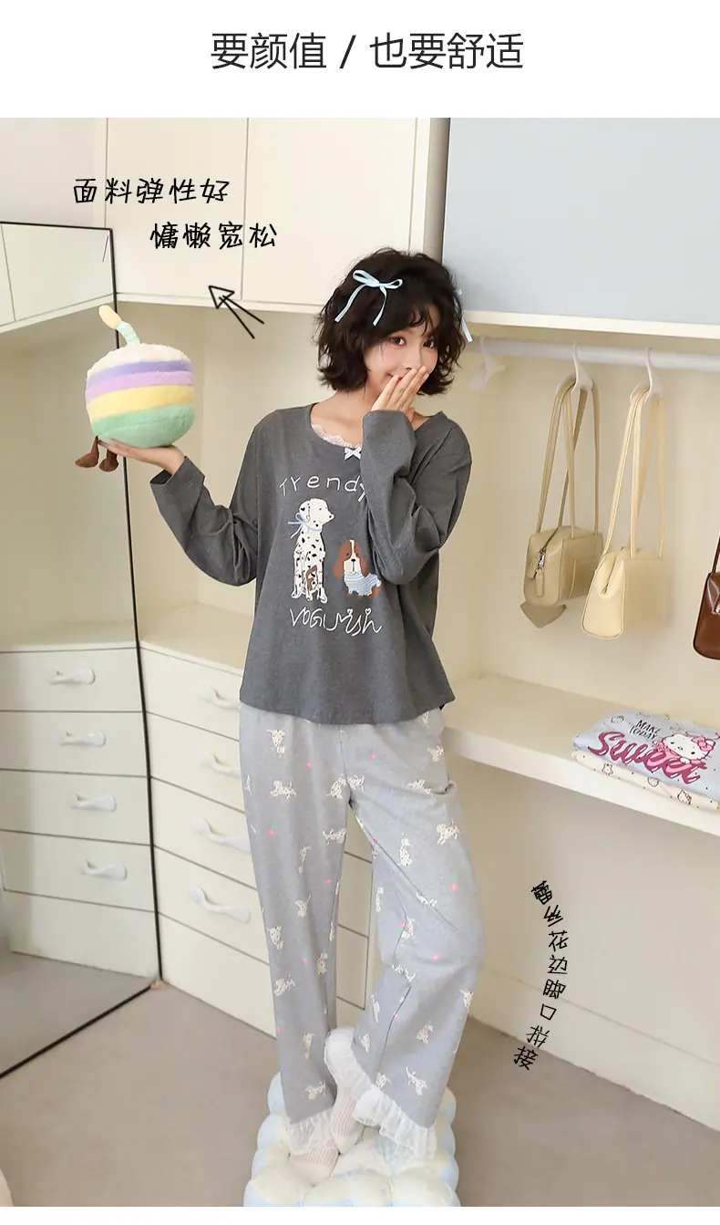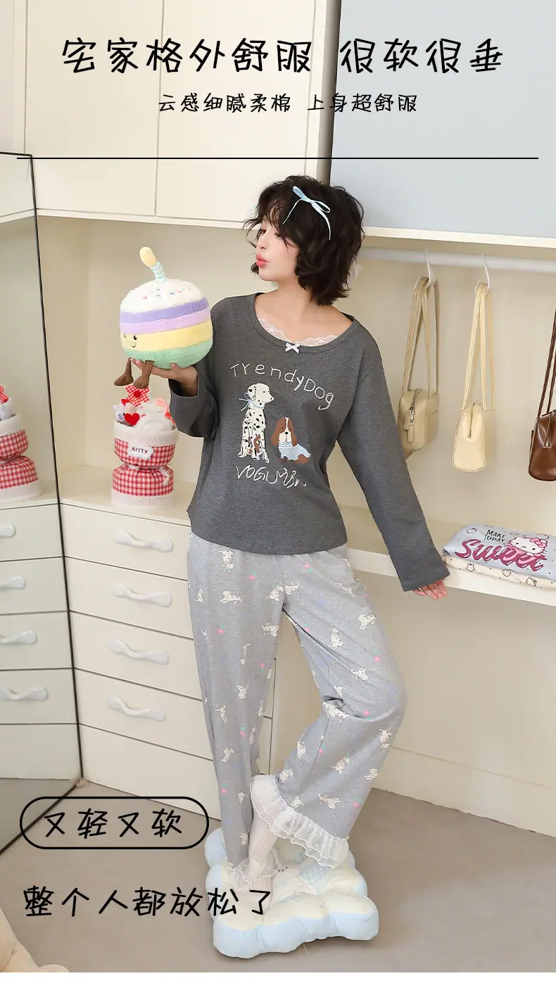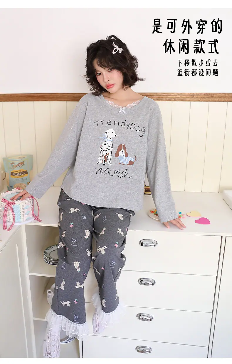 Pijama de Otoño para Mujer Dulce Encaje Patrón de Cachorros Lazo Ropa para el Hogar Manga Larga Pantalón Largo Se Puede Usar Afuera Pijama Mujer