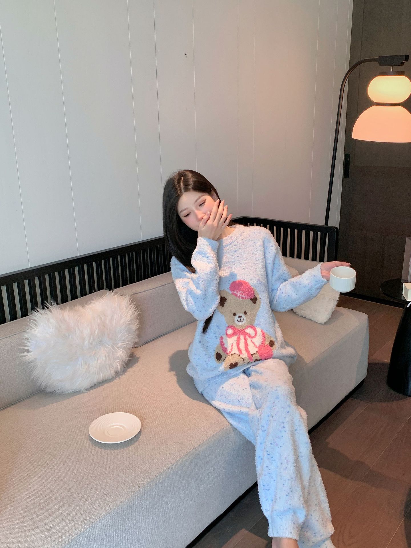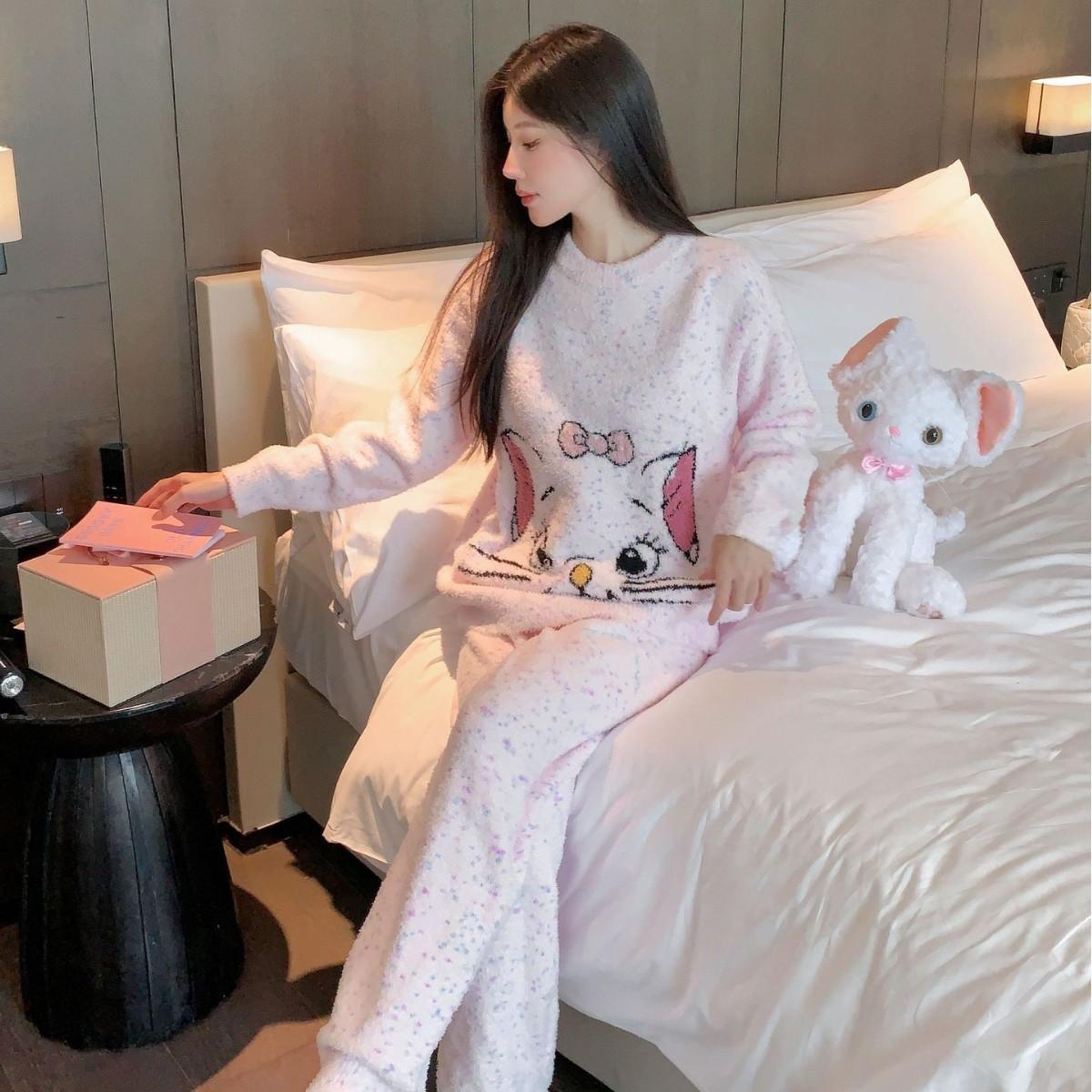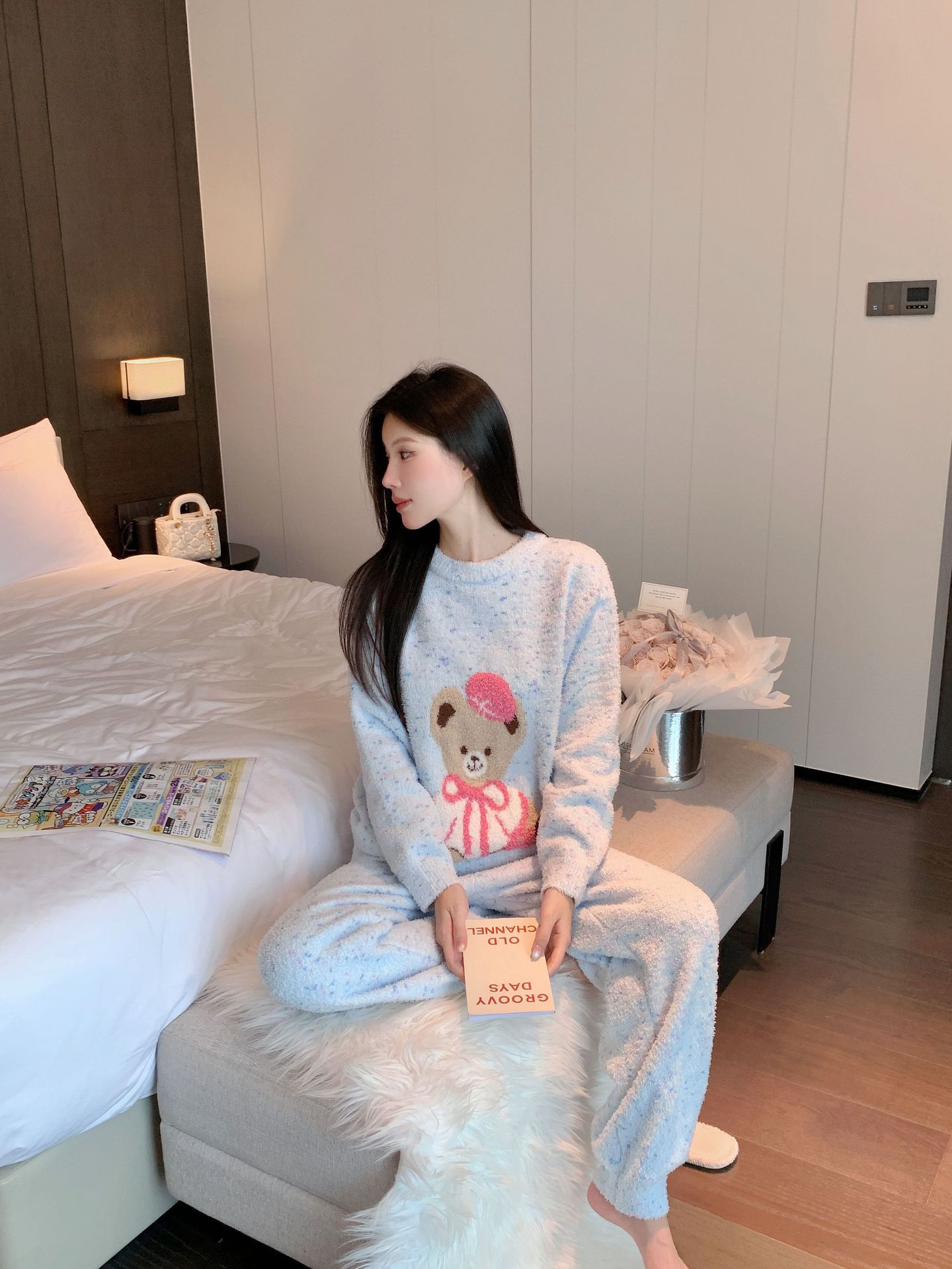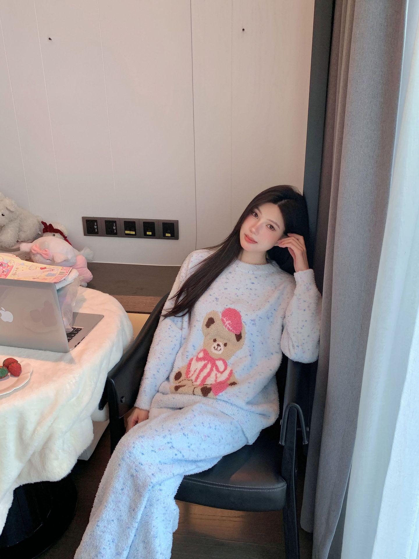Compra Pijamas de otoño e invierno para mujer de dibujos animados dulces de cuello redondo tipo jersey de forro polar coral de dibujos animados cálido se puede usar afuera conjunto para estar en casa al por mayor en Joom.pro