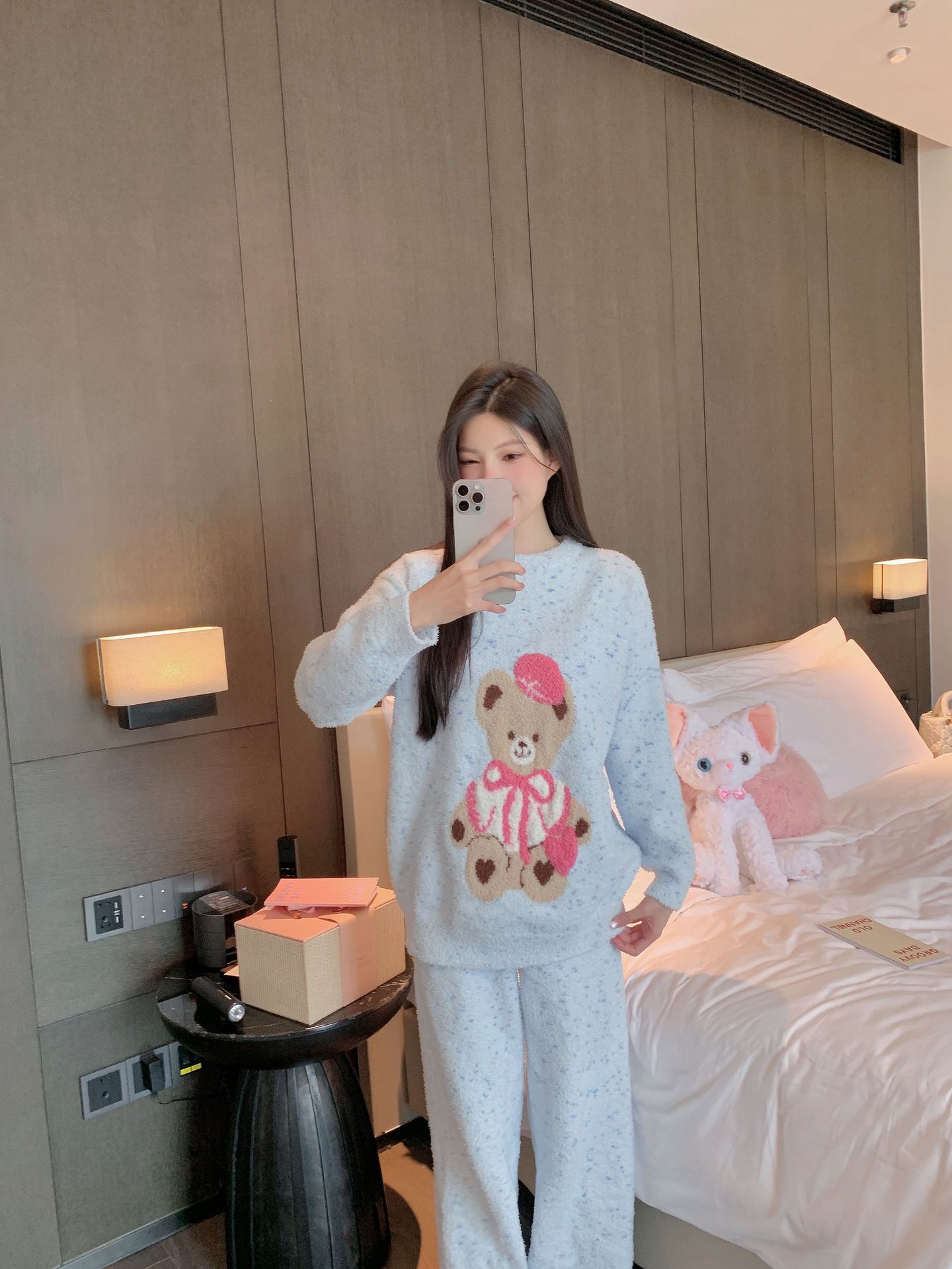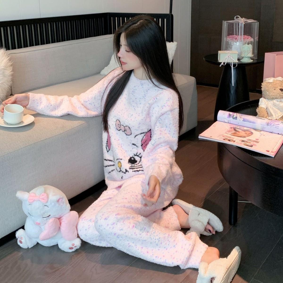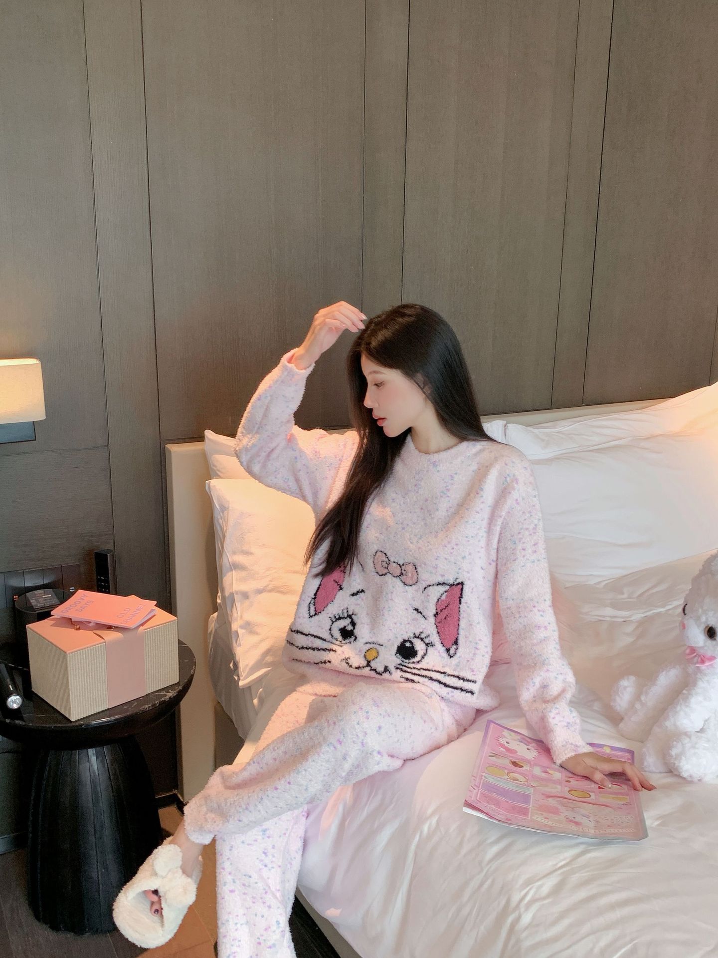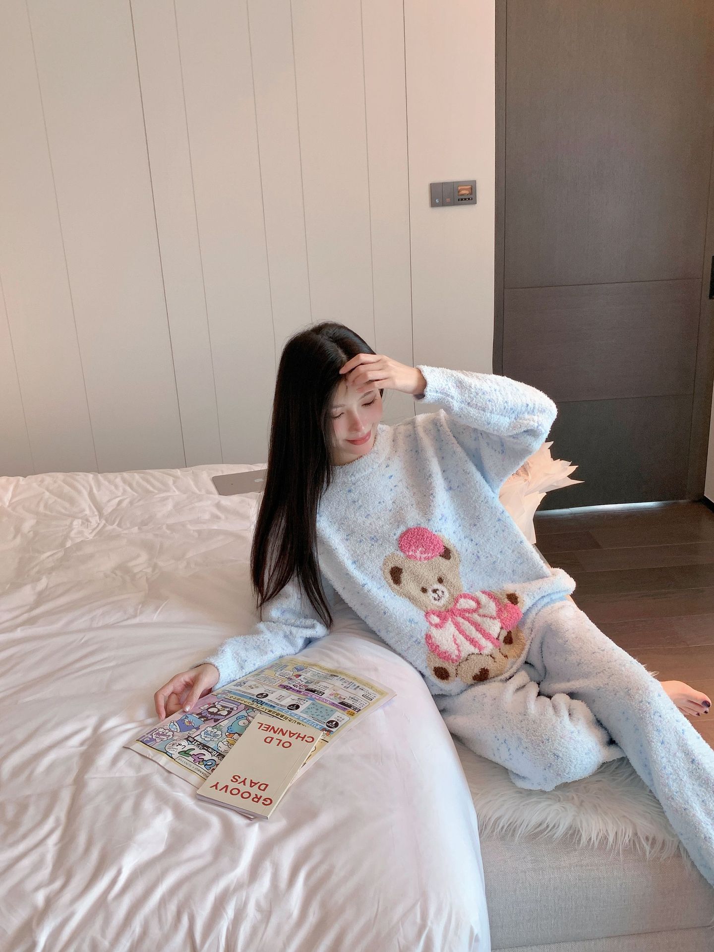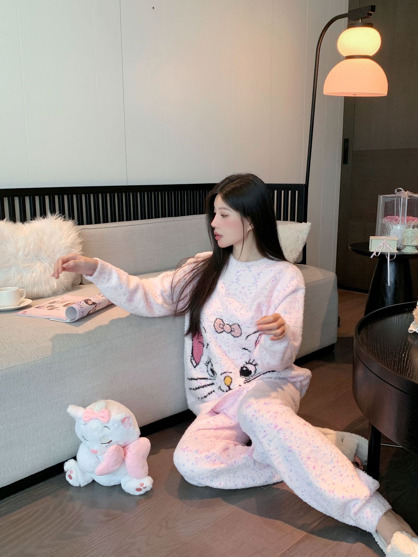 Compra Pijamas de otoño e invierno para mujer de dibujos animados dulces de cuello redondo tipo jersey de forro polar coral de dibujos animados cálido se puede usar afuera conjunto para estar en casa al por mayor en Joom.pro